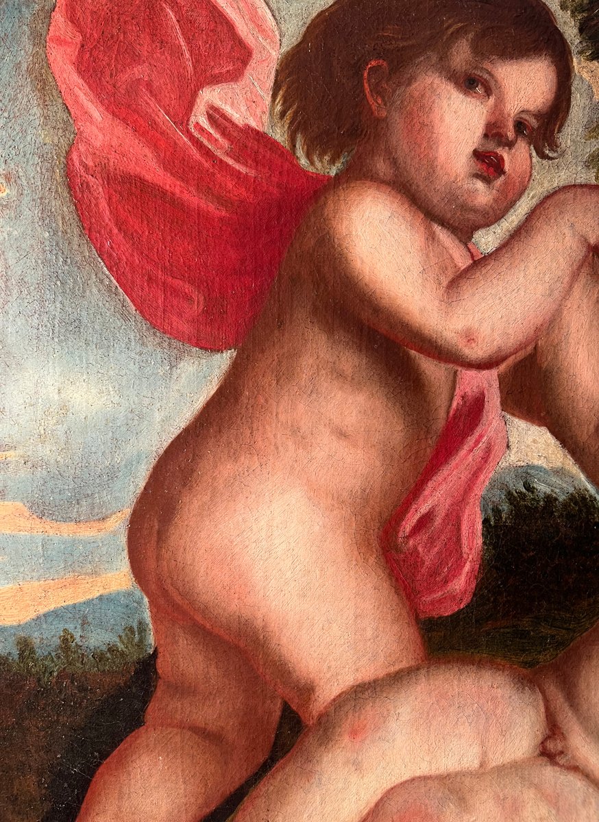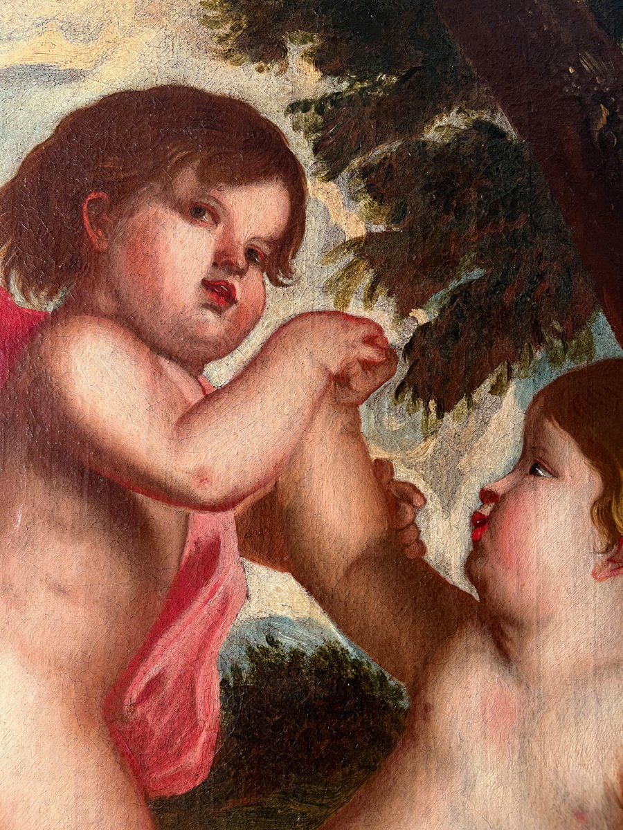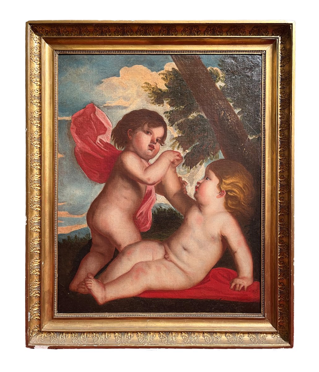 Alessandro Leone Varotari, commonly known as Il Padovanino was born in Padua, Italy and was an Italian painter of the late-Mannerism and early Baroque-Venetian school. He was trained by his own father, who was a local painter and architect. He was known as a copyist and his paintings were characterised for their sexuality. The painting depicts a pair of putti playing with each other on a meadow. One of the two is sitting on a red drape while the other is holding his hand. The scene takes place outdoors, above a meadow, while the two chubby infants play under a tree whose trunk can be seen in the background.