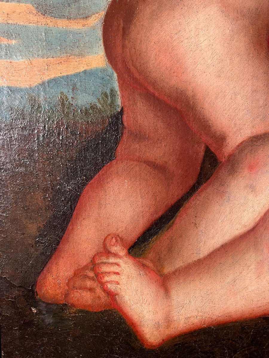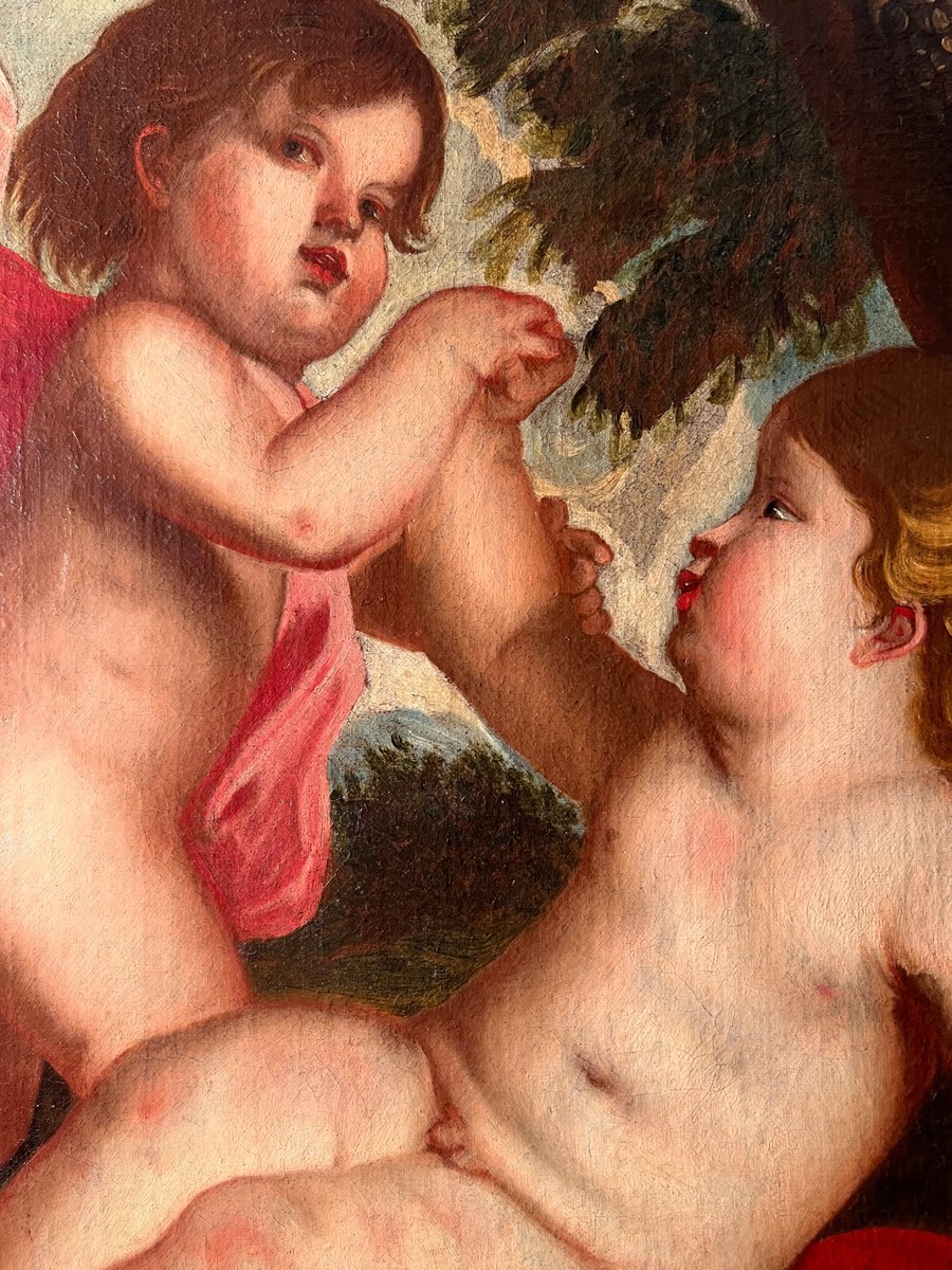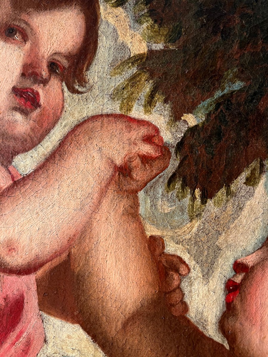 Alessandro Leone Varotari, commonly known as Il Padovanino was born in Padua, Italy and was an Italian painter of the late-Mannerism and early Baroque-Venetian school. He was trained by his own father, who was a local painter and architect. He was known as a copyist and his paintings were characterised for their sexuality. The painting depicts a pair of putti playing with each other on a meadow. One of the two is sitting on a red drape while the other is holding his hand. The scene takes place outdoors, above a meadow, while the two chubby infants play under a tree whose trunk can be seen in the background.