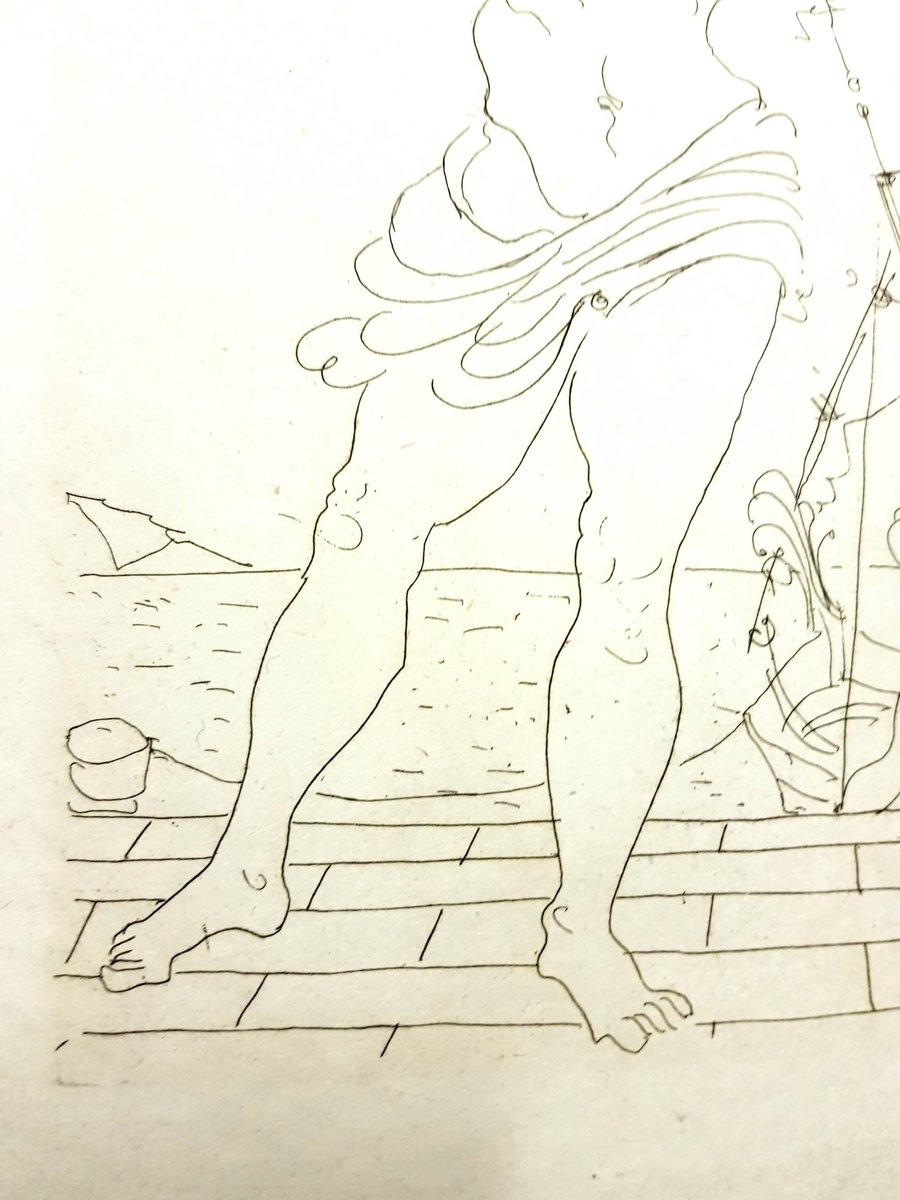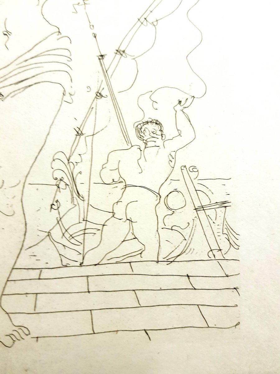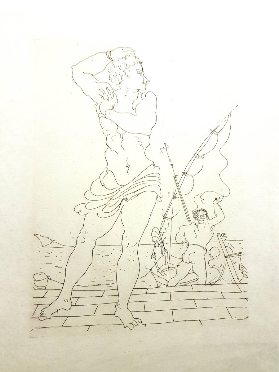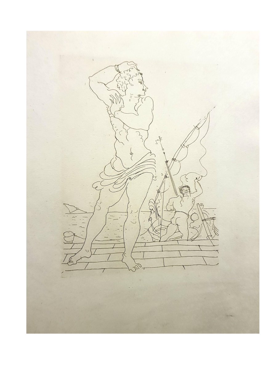 André Derain - Heroides di Ovidio Acquaforte originale Edizione di 134 Dimensioni: 32 x 25 cm Ovide [Marcel Prevost], Héroïdes, Parigi, Société des Cent-une, 1938 Andre Derain è nato nel 1880 a Chatou, una colonia di artisti fuori Parigi. Nel 1898, si iscrive all'Academie Carriere di Parigi dove incontra Matisse. Frequenta la scuola d'arte e nel 1900 apre uno studio con Maurice deVlaminck. Dopo il suo servizio militare dal 1900-1904, Derain espose le sue opere al Salon des Independants e poi al Salon d'Automne con Matisse, Vlaminck e altri, creando così il movimento del Fauvismo. Lavorò con Henri Matisse nel 1905 a Collioure, e partecipò al Salon d'Automne del 1905 con Matisse, Vlaminck e Braque, la mostra in cui questo gruppo fu etichettato come Fauves, o Wild Beasts. Insieme a Vlaminck, Derain fu uno dei primi artisti a collezionare l'arte tribale dell'Africa che fu influente per molti artisti dell'inizio del XX secolo. Nel 1906, Derain incontrò Picasso e il suo mercante, che acquistò l'intero studio di Derain, creando un ritrovato successo finanziario. Durante questo periodo, fu assunto per le illustrazioni di opere di Guillaume Apollinaire e Andre Breton. Dopo la prima guerra mondiale, il movimento cubista del suo amico influenzò la sua arte, insieme all'influenza del classicismo e dell'arte africana. Derain rimase a Parigi durante la maggior parte dell'occupazione, dove fu stimato dai nazisti per la sua integrità artistica. Il ministro degli esteri di Hitler gli commissionò un ritratto di famiglia, ma lui rifiutò educatamente. La sua popolarità cominciò a diminuire dopo la guerra a causa del disaccordo sui nuovi movimenti artistici. Più tardi perse la maggior parte della sua vista a causa di una malattia, che potrebbe essere stata la ragione per cui fu investito da un camion nel 1954, morendo per lo shock all'età di 74 anni. I dipinti fauve di Derain sono tipicamente luminosi con colori intensi. Influenzato dal lavoro di Cézanne così come dai primi dipinti cubisti di Picasso e Braque, lo stile di Derain cambiò e dal 1912, i dipinti divennero più tradizionali e strutturati. Per il resto della sua carriera, continuò a indagare diversi metodi compositivi tra cui la prospettiva di Cézanne e il divisionismo di Seurat. Disegnò anche scenografie di balletti e realizzò un certo numero di sculture. Alla fine del secolo, Andre Derain espose al radicale Salon d'Automne fauve (1905) e fu uno dei membri fondatori del movimento fauvista insieme ai suoi amici di sempre Matisse e Vlaminck. Le opere che produsse in questo periodo, spesso sotto la guida di Matisse, sono state annoverate tra i capolavori del Fauvismo. Dal 1918 circa, Derain ha voltato le spalle all'avanguardia e ha iniziato a esplorare alcuni dei generi più tradizionali dell'arte occidentale, compresi i paesaggi. La sua principale fonte di ispirazione, una volta che il gruppo dei Fauves si è disperso, si trova al Louvre, dove ammira in particolare le opere del primo Rinascimento. Parlando delle sue frequenti visite lì, una volta disse: "Mi sembrava allora la vera, pura pittura assoluta" Il suo lavoro si è evoluto attraverso molti stili e, più significativamente, è tornato al passato, in particolare dopo il 1922 quando Lenin aveva pubblicamente pronunciato il suo disprezzo per l'arte astratta. Nel corso della sua vita, Derain costruì un'immensa e affascinante collezione di dipinti, sculture e oggetti d'arte che aiutò la sua sperimentazione e si riflette nella sua opera tra il 1930 e il 1945. Durante questi anni, la sua tecnica pittorica mostrò il massimo dell'invenzione, utilizzando un repertorio di motivi primitivisti. La sua collezione eclettica cambiò costantemente. Nel 1930 vendette la sua collezione africana in cambio di bronzi dell'antichità e del Rinascimento, il che indica un reale cambiamento di interesse per gli oggetti, così come la sua successiva ricerca della pittura su ceramica greca e il suo entusiasmo per i grandi cicli di temi letterari e antichi con il passare degli anni trenta. Tra il 1947 e il 1953 Derain si concentrò sul paesaggio come soggetto. Paysage au bord de la mer', 1948-50 circa, è un pezzo splendidamente audace che combina sia le influenze tradizionali che quelle moderne. Come un paesaggio successivo, è strutturato con la premeditazione e l'ordine che rimanda a Cezanne e all'idea che il pittore ha il privilegio di imporre un ordine alla natura. Derain ama soprattutto inquadrare le sue vedute in funzione della luce, quando questa sembra ammorbidire il soggetto, evocando i paesaggi dipinti da Corot nel XIX secolo. L'effetto di questa inquadratura imposta è stupefacente in "Paysage au bord de la mer", dove le ombre nude e i toni terrosi del paesaggio in primo piano sono contrapposti alla luce brillante del paesaggio marino dietro.