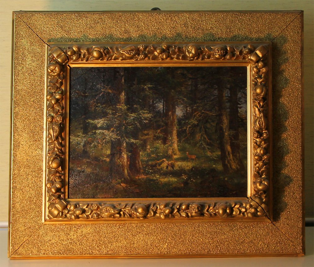 Anton Heinrich Dieffenbach, a German landscape and genre painter, beautifully captures the essence of the natural world in this mesmerizing artwork created in 1891. Painted on mahogany panel using oil, this exquisite piece depicts an idyllic scene with a finely rendered deer amidst a dense forest, capturing the impressive play of light with virtuosity. Dieffenbach, who received training at the Düsseldorf Academy and was influenced by Ludwig Knaus, demonstrates his profound connection to nature and the changing seasons through his forest landscapes. The original frame from the period adds to the authenticity and charm of this artwork. Measuring approximately 45 x 53 cm with frame, this painting is in good condition. The subtle naturalistic details and the skillful representation of depth and mood make this piece a valuable addition to any art collection.