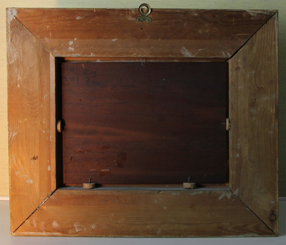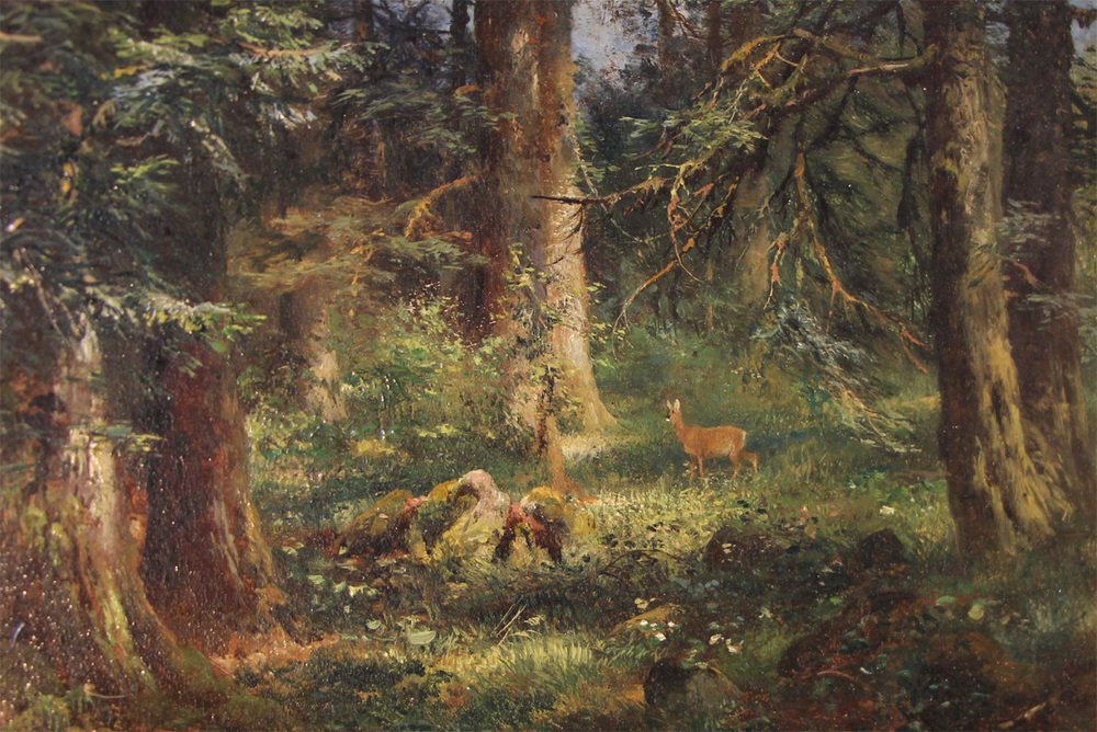 Anton Heinrich Dieffenbach, pittore tedesco di paesaggi e di genere, cattura magnificamente l'essenza del mondo naturale in questa ipnotica opera d'arte creata nel 1891. Dipinto a olio su tavola di mogano, questo squisito pezzo raffigura una scena idilliaca con un cervo finemente reso in mezzo a una fitta foresta, catturando con virtuosismo gli impressionanti giochi di luce. Dieffenbach, che si formò all'Accademia di Düsseldorf e fu influenzato da Ludwig Knaus, dimostra il suo profondo legame con la natura e l'alternarsi delle stagioni attraverso i suoi paesaggi forestali. La cornice originale dell'epoca aggiunge autenticità e fascino a quest'opera d'arte. Il dipinto, che misura circa 45 x 53 cm con la cornice, è in buone condizioni. I sottili dettagli naturalistici e l'abile rappresentazione della profondità e dello stato d'animo rendono quest'opera un'aggiunta preziosa a qualsiasi collezione d'arte.