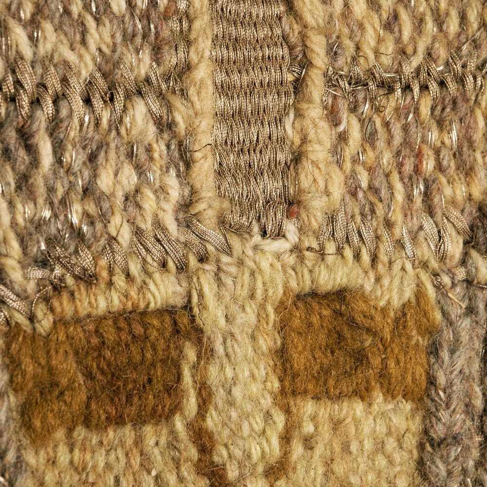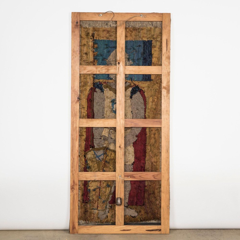 What is truly spectacular of this piece is the way the helmet of the knight is woven with wool and brass thread. See detail pictures. The knight is dressed in an armour that is typical for a Norman knight. He is carrying a shield and a sword and is standing in front of a blue flag.