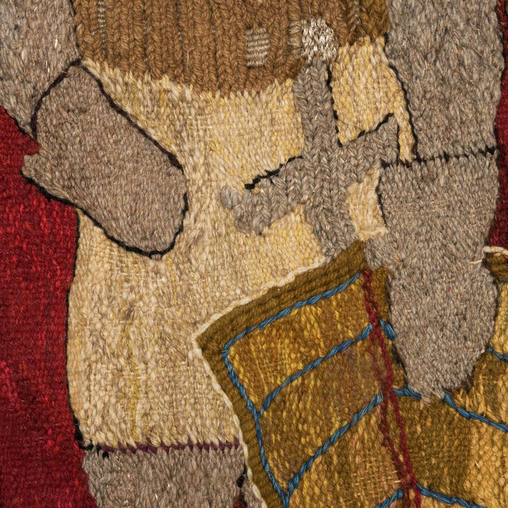 Appeso da parete in stile "Kilim" in lana di arte popolare, molto unico nel suo genere, raffigurante un cavaliere della Normandia, in Francia. Tessuto a mano, circa anni '50.