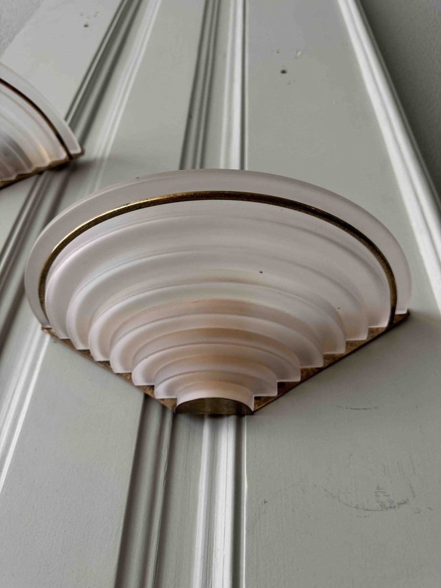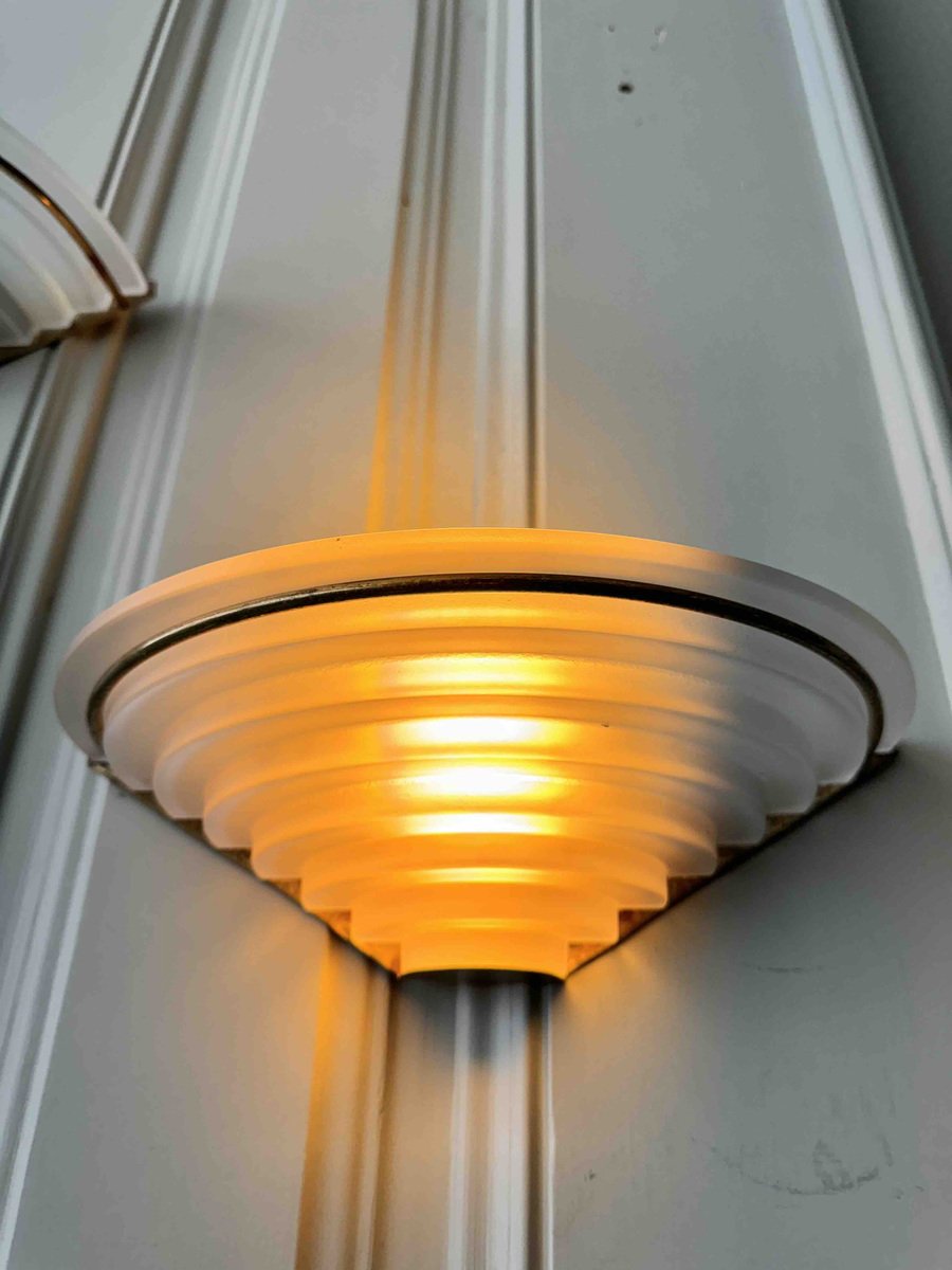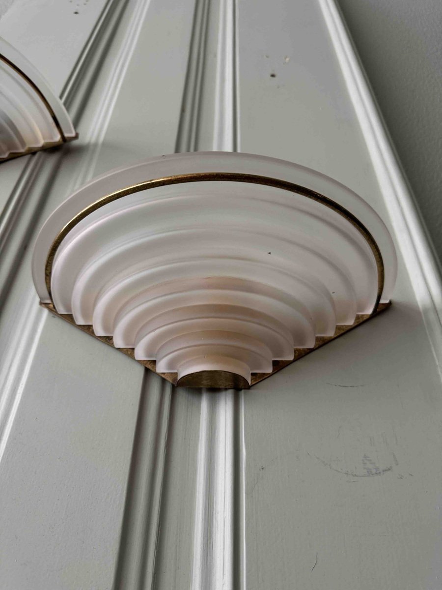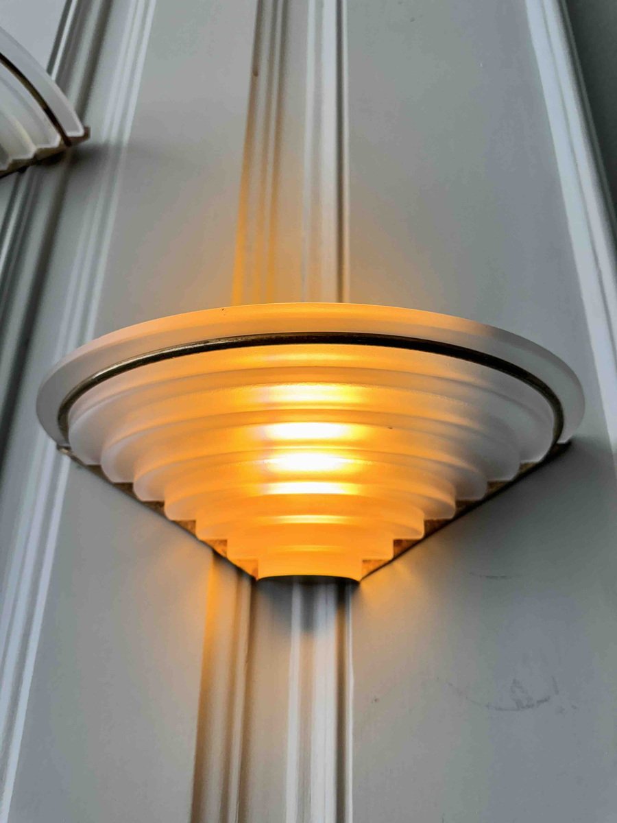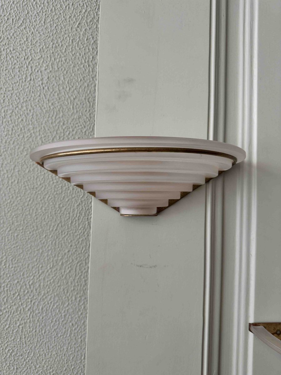Nonostante la loro storia pluridecennale, queste applique sono state meticolosamente conservate e rimangono in eccellenti condizioni vintage, con solo una leggera usura che ne accresce il fascino autentico. Il loro design classico Art Déco le rende un'aggiunta perfetta a qualsiasi spazio, integrandosi perfettamente con interni tradizionali e contemporanei.