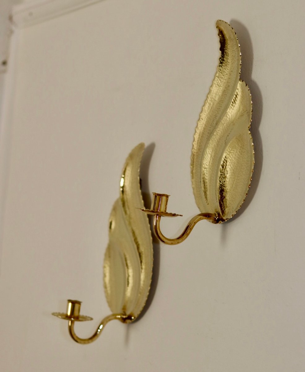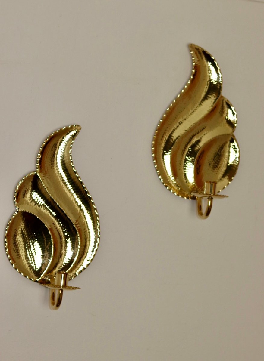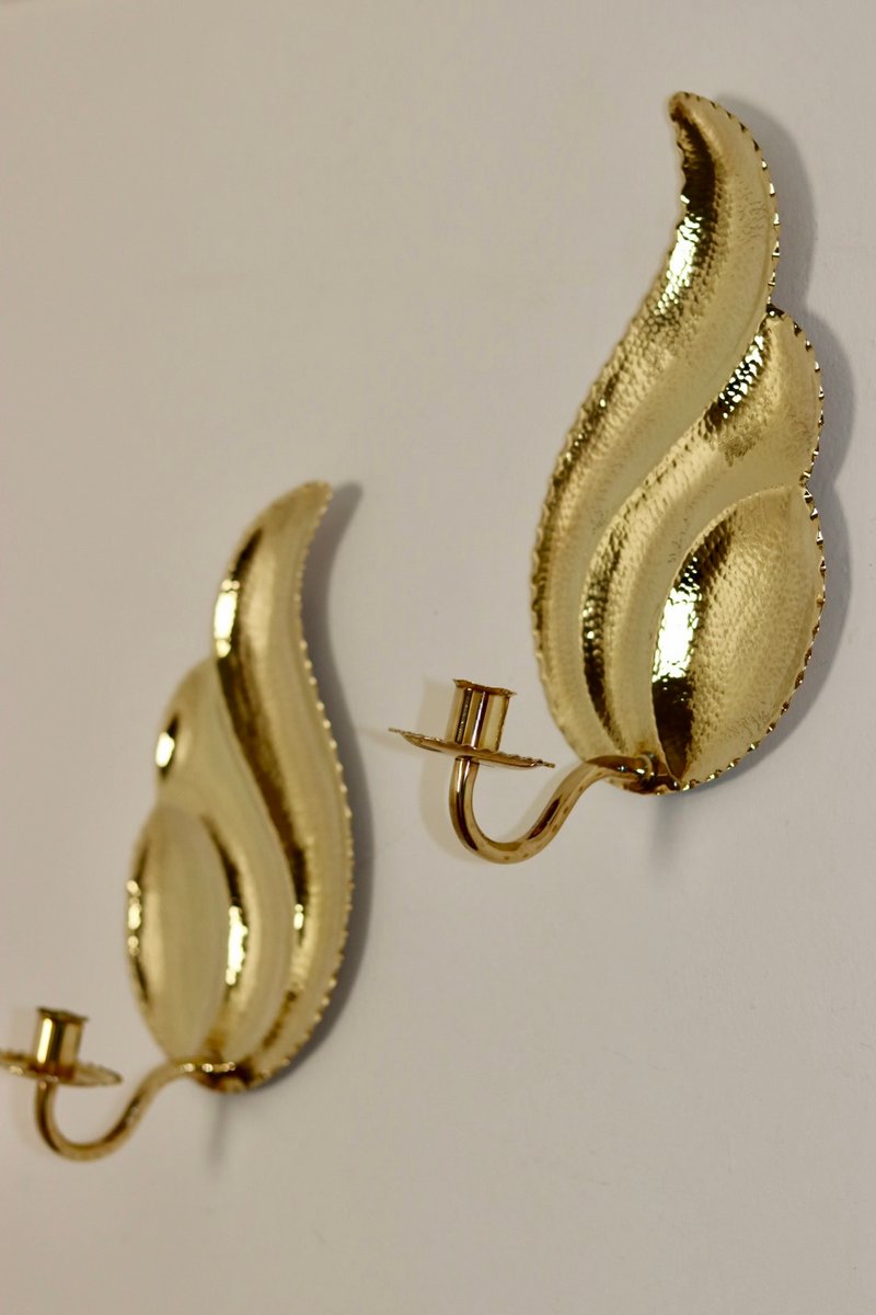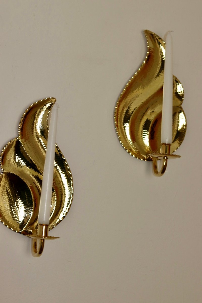 Elegante coppia di appliques svedesi di L. Andersson Fågelmara, realizzate in ottone repoussé martellato. Questi pezzi fondono l'eleganza storica con una meticolosa lavorazione artigianale, rendendoli un'aggiunta straordinaria a qualsiasi arredamento. Includono vaschette per la cera fusa e sono adatte a candele da cena standard. Consegnato lucido e pronto ad adornare il vostro spazio.