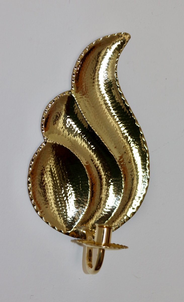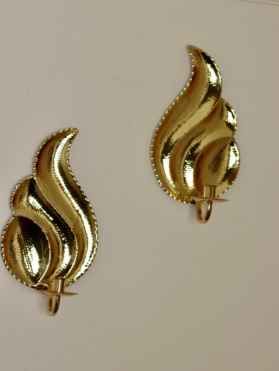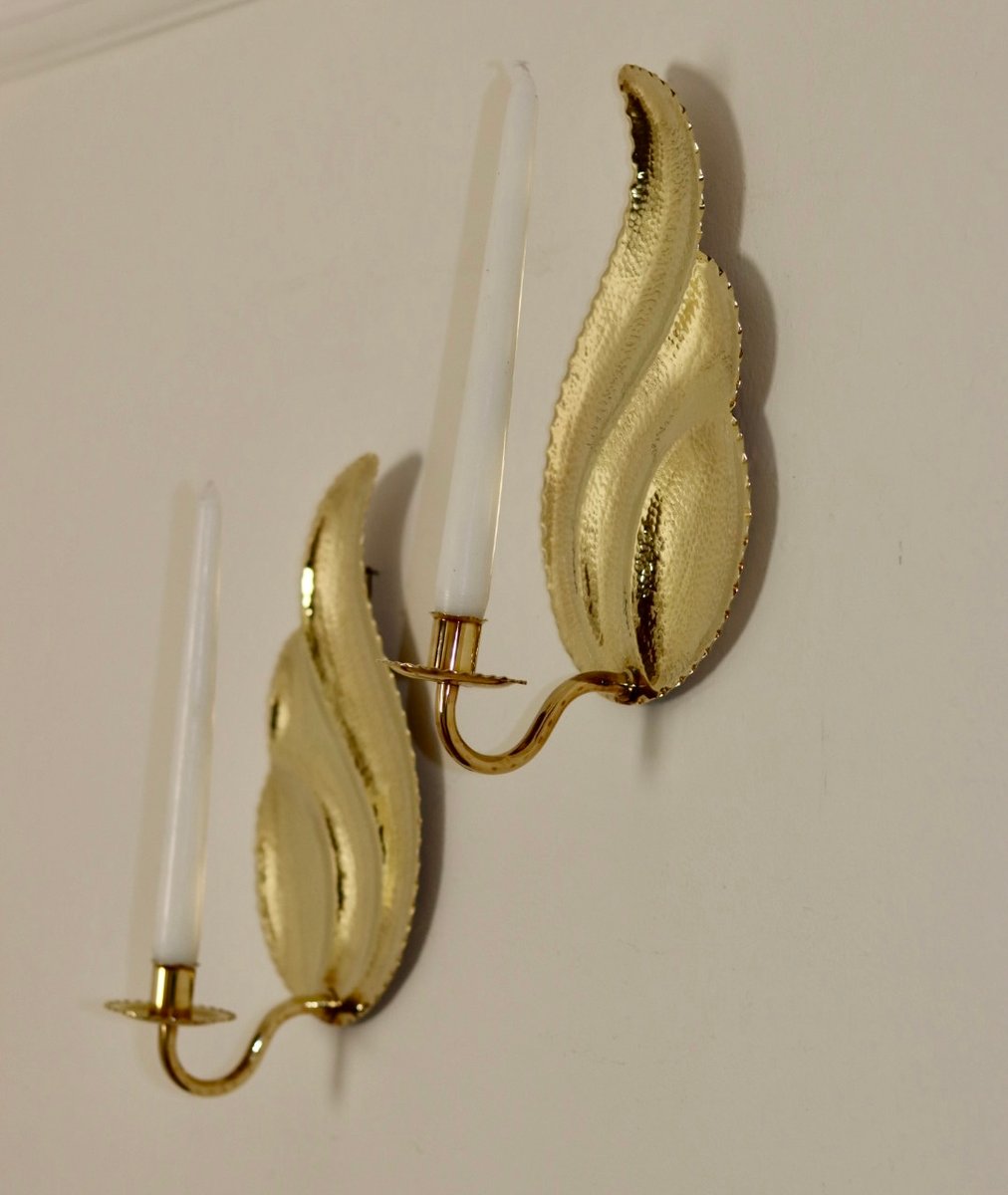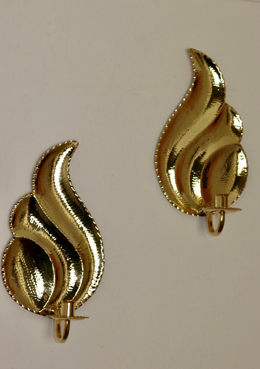 Elegante coppia di appliques svedesi di L. Andersson Fågelmara, realizzate in ottone repoussé martellato. Questi pezzi fondono l'eleganza storica con una meticolosa lavorazione artigianale, rendendoli un'aggiunta straordinaria a qualsiasi arredamento. Includono vaschette per la cera fusa e sono adatte a candele da cena standard. Consegnato lucido e pronto ad adornare il vostro spazio.