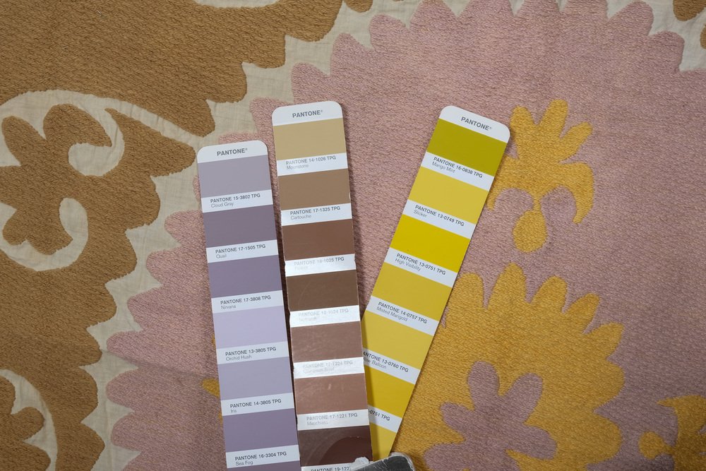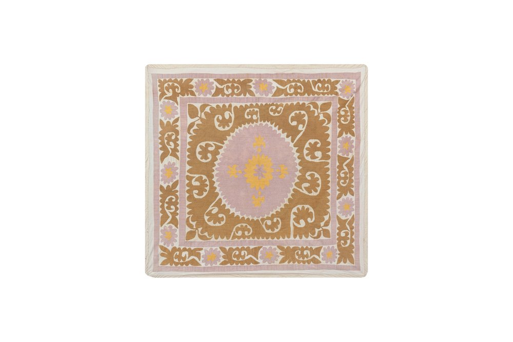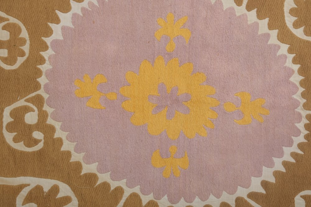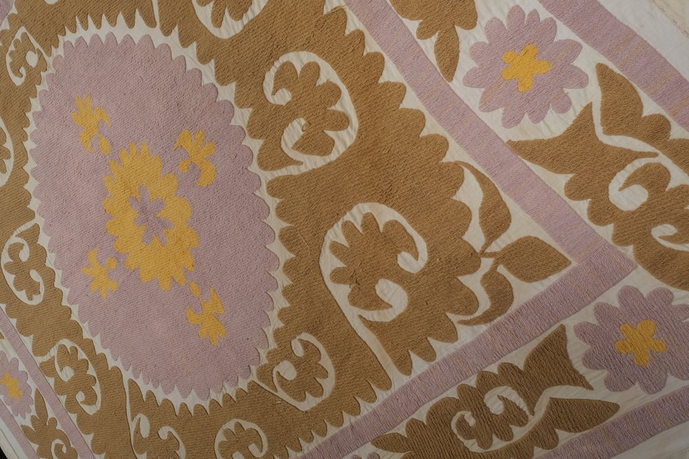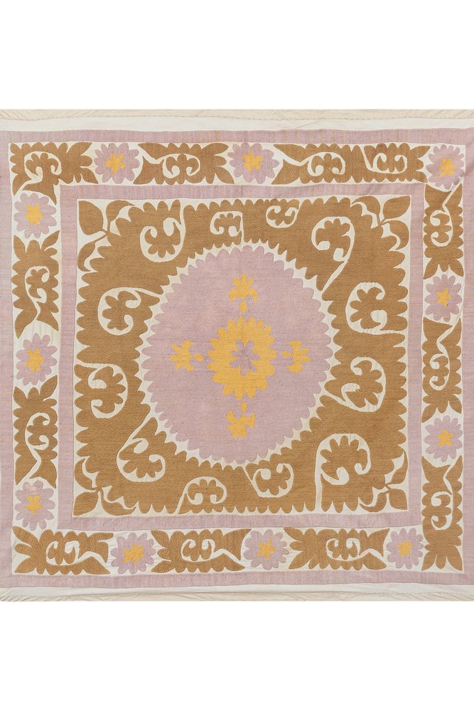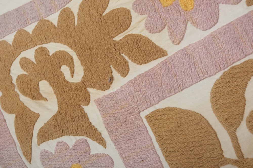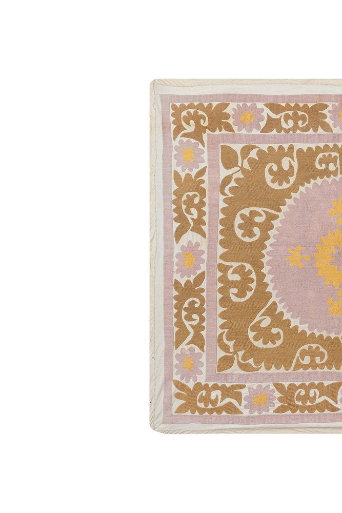 "Il termine "Suzani" deriva dalla parola anatolica "suzan", che significa "ago", e si riferisce alle tappezzerie e ai copriletto ricamati in seta brillante che adornavano le case delle persone nelle occasioni di festa. I suzani sono oggetti pratici e decorativi che richiedevano mesi di lavoro per 1-2 persone. Ci sono variazioni nella tonalità del filo di seta usato per ricamare, come si vede comunemente nei suzani più vecchi che erano fatti per uso personale nelle case delle persone.