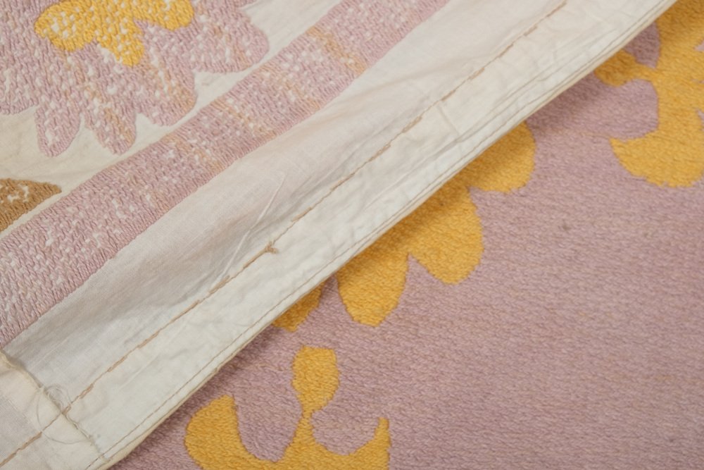 Sebbene questo suzani sia in condizioni meravigliose, presenta piccole macchie e segni di usura, come è normale che sia in oggetti di questa età.