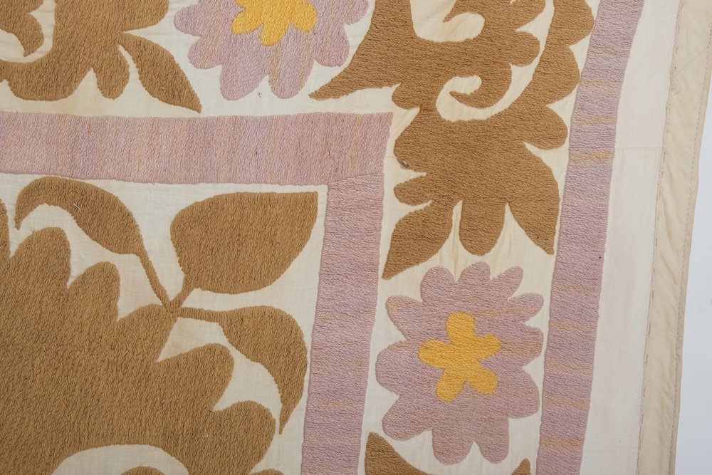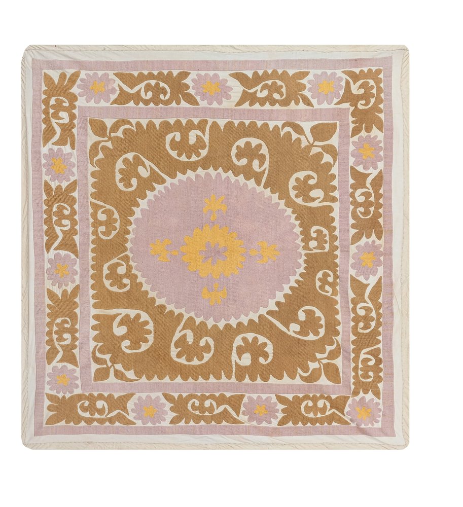 “Suzani” derives from the Anatolian word ""suzan"" for ""needle"" and refers to bright silk embroidered wall hangings and bedspreads that adorned homes of people on festive occasions. Suzanis are practical yet decorative items that took months for 1-2 individuals to make. There are variations in the shade of the silk thread used to embroider this, as is commonly seen in older suzanis that were made for personal use in people’s homes.