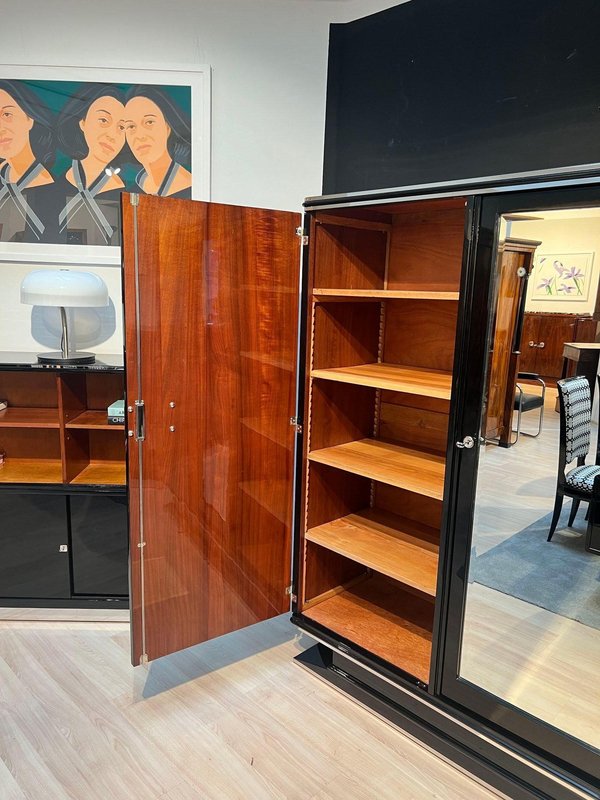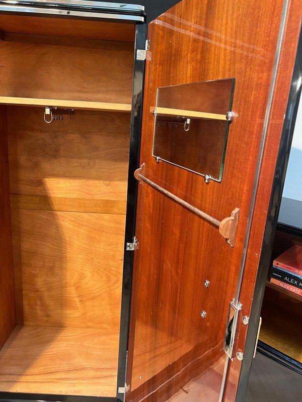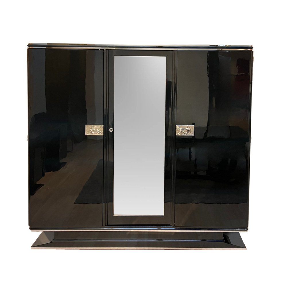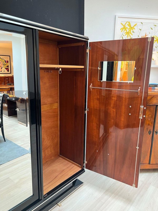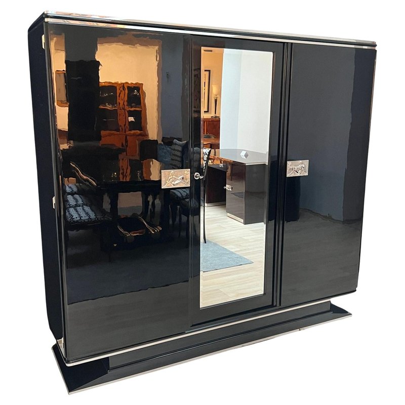 Armadio o armoire Art Déco di prima classe in lacca nera per pianoforte proveniente dalla Francia intorno al 1930. Corpo in mogano, esterno in lacca nera per pianoforte, lucidato a specchio. Doppie finiture metalliche sul cornicione e singole sulla base. Specchio incassato con taglio sfaccettato al centro. Molto bella la ferramenta originale in ottone cromato al centro delle ante, finemente lavorata con motivi maschili e femminili con colombe. Interno in mogano satinato. Anta centrale impiallacciata e laccata all'interno con legno satinato e mogano come raggi. A sinistra con ripiani su guide regolabili. A destra una fascia metallica estraibile con ganci per appendiabiti. All'interno delle ante esterne sono presenti due serrature a barra cromate originali. L'armadio è completamente smontabile in 14 parti singole con viti. Dimensioni: H 187,5 cm / 73,8 in L 197 cm / 77,56 in P 53 cm / 20,86 in