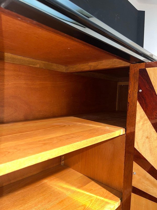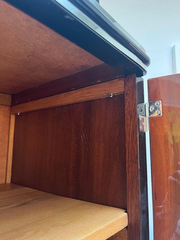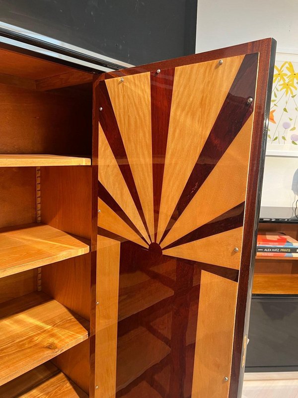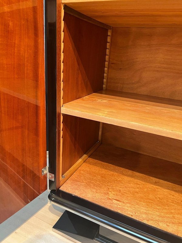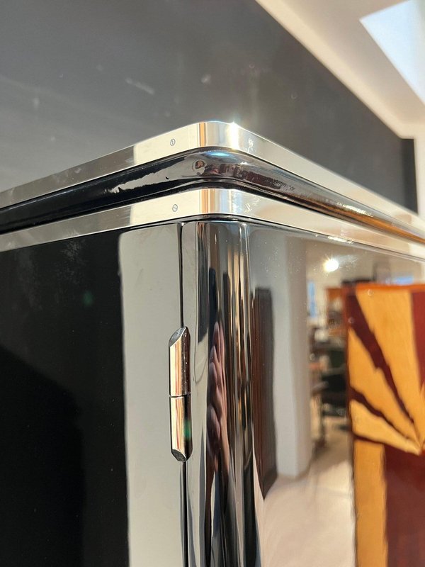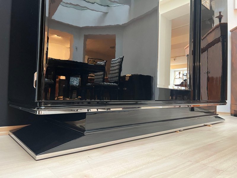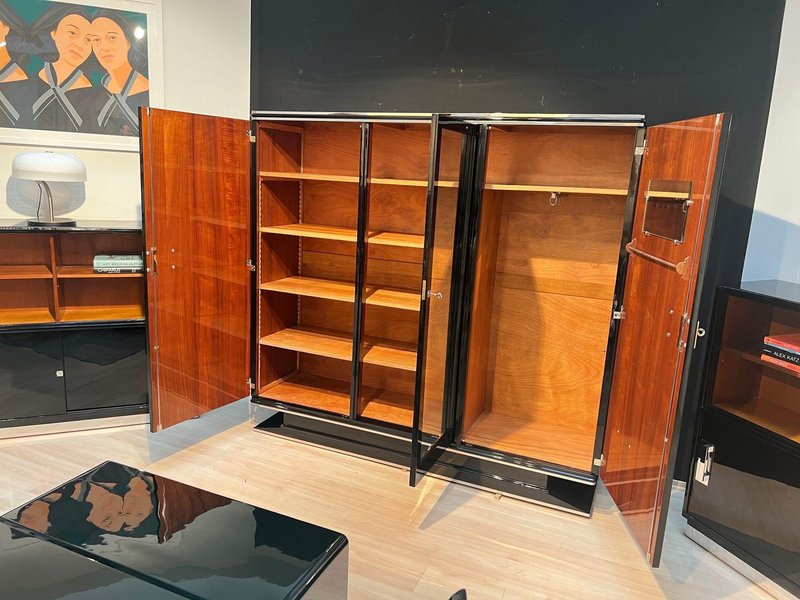Armadio o armoire Art Déco di prima classe in lacca nera per pianoforte proveniente dalla Francia intorno al 1930. Corpo in mogano, esterno in lacca nera per pianoforte, lucidato a specchio. Doppie finiture metalliche sul cornicione e singole sulla base. Specchio incassato con taglio sfaccettato al centro. Molto bella la ferramenta originale in ottone cromato al centro delle ante, finemente lavorata con motivi maschili e femminili con colombe. Interno in mogano satinato. Anta centrale impiallacciata e laccata all'interno con legno satinato e mogano come raggi. A sinistra con ripiani su guide regolabili. A destra una fascia metallica estraibile con ganci per appendiabiti. All'interno delle ante esterne sono presenti due serrature a barra cromate originali. L'armadio è completamente smontabile in 14 parti singole con viti. Dimensioni: H 187,5 cm / 73,8 in L 197 cm / 77,56 in P 53 cm / 20,86 in