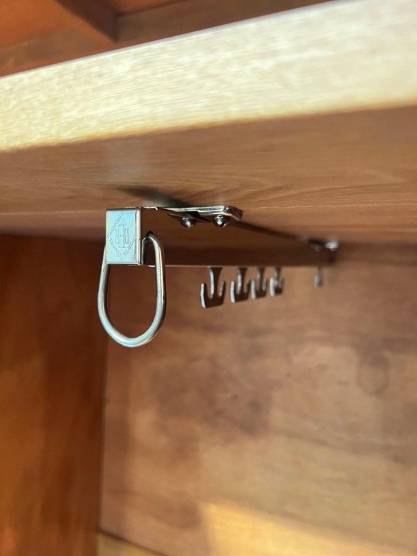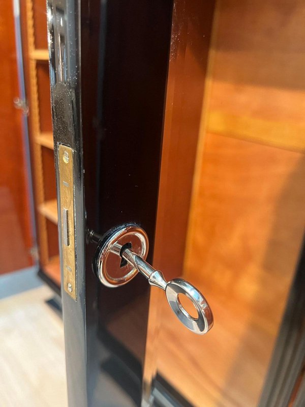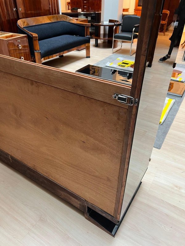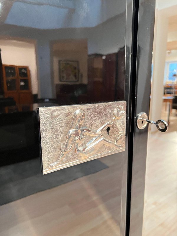 First-class Art Deco wardrobe or armoire in black piano lacquer from France around 1930. Mahogany body, outside in black piano lacquer, polished to high gloss. Double metal trim on the cornice and single trim on the base. A recessed mirror with facet cut in the center. Very beautiful, original chrome-plated brass fittings in the center of the doors, finely crafted with male and female motifs with doves. Interior in mahogany, satin polished. Central door veneered and lacquered inside with satinwood and mahogany as rays. On the left with shelves on adjustable rails. On the right a pull-out metal strip with hooks for coat hangers. There are two original, chrome-plated bar locks on the inside of the outer doors. The wardrobe can be completely dismantled into 14 individual parts with screws. Dimensions: H 187.5 cm / 73.8 in W 197 cm / 77.56 in D 53 cm / 20.86 in