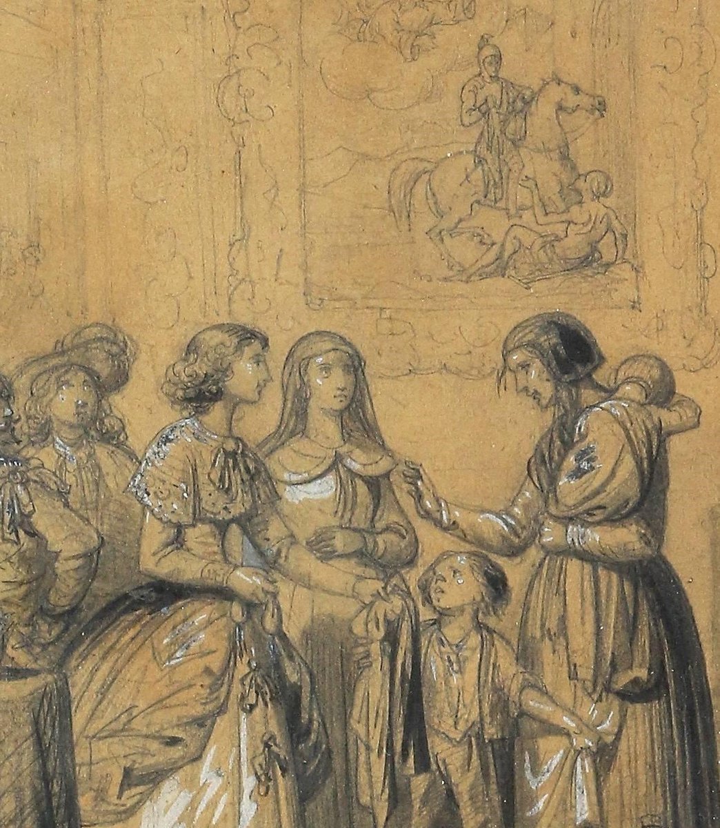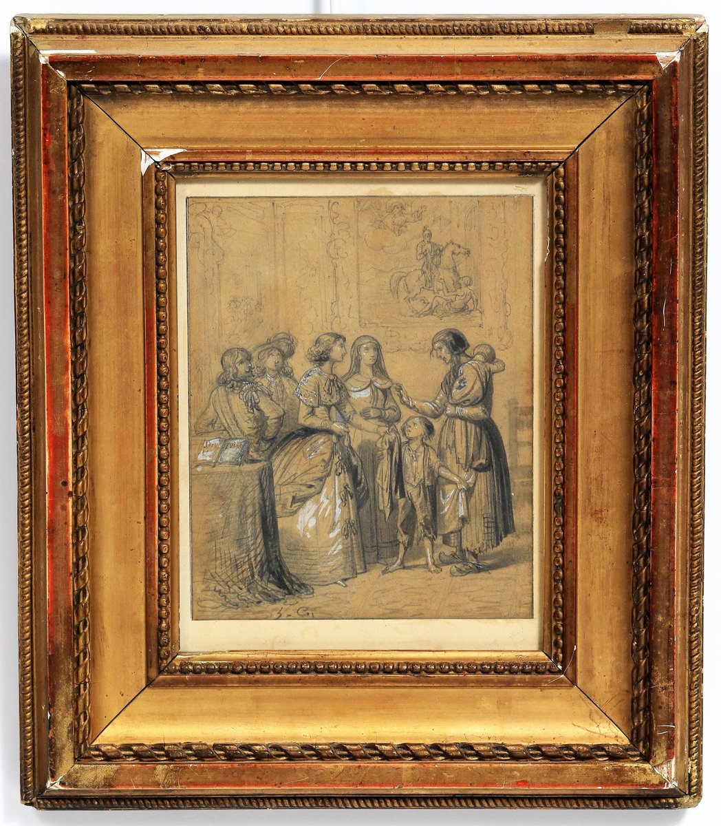 Artista della scuola francese, L'aumône, XIX secolo, matita nera e guazzo bianco, con cornice