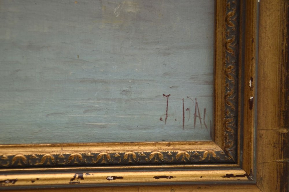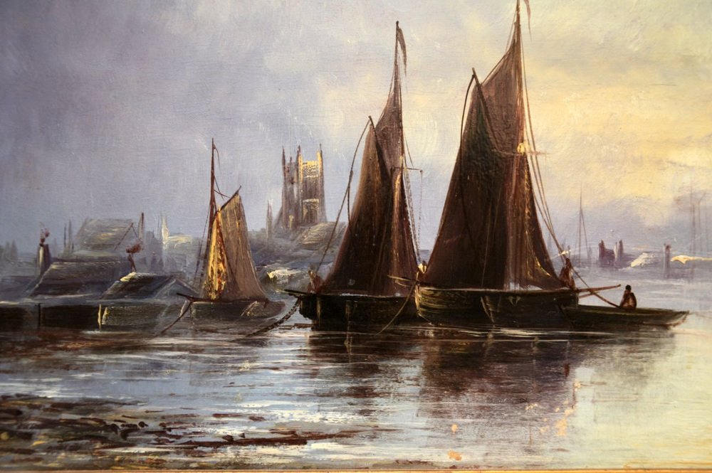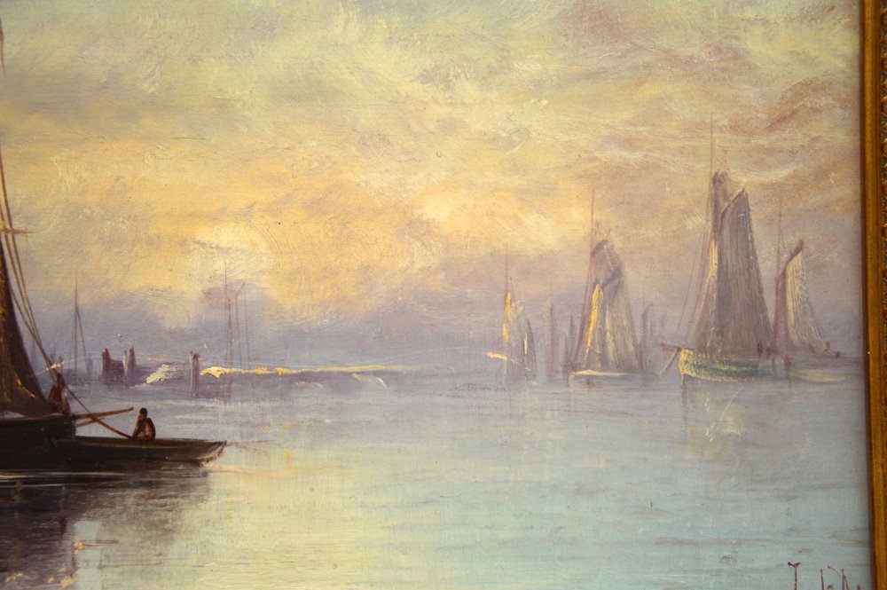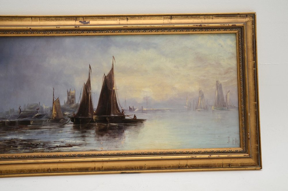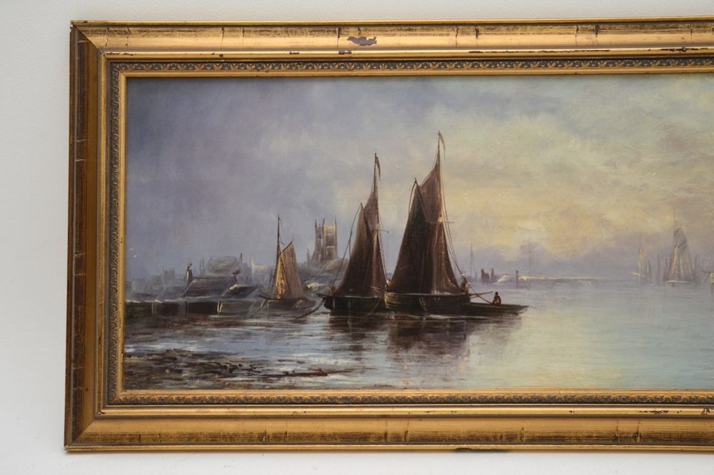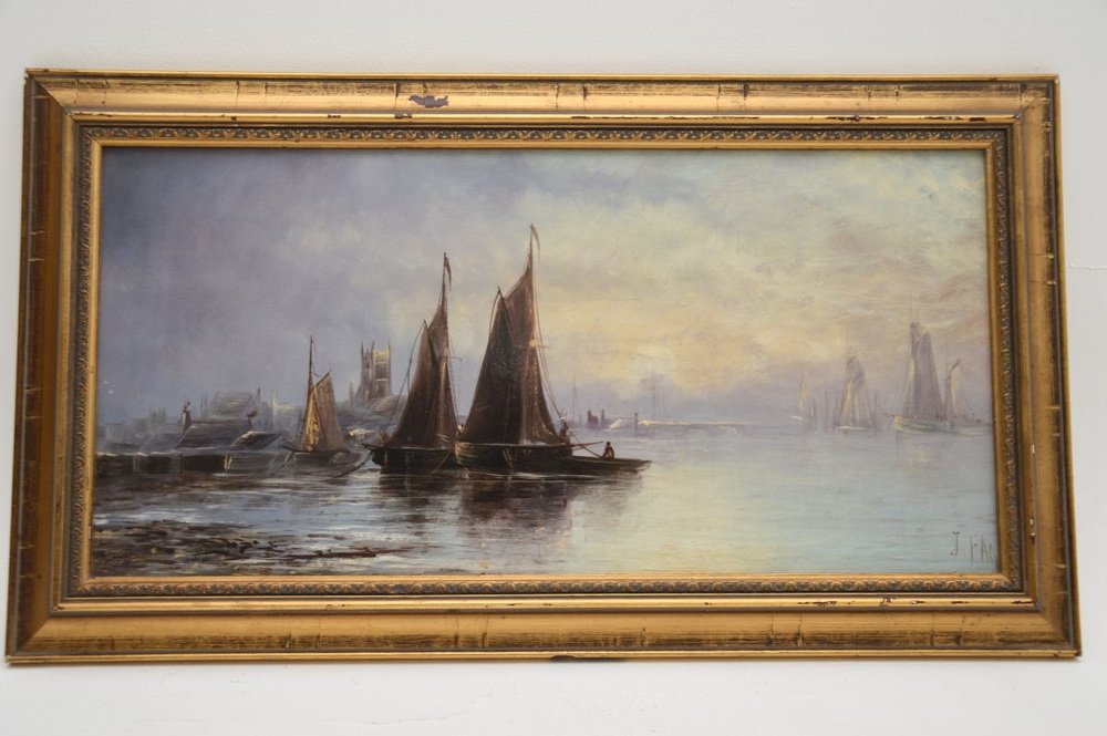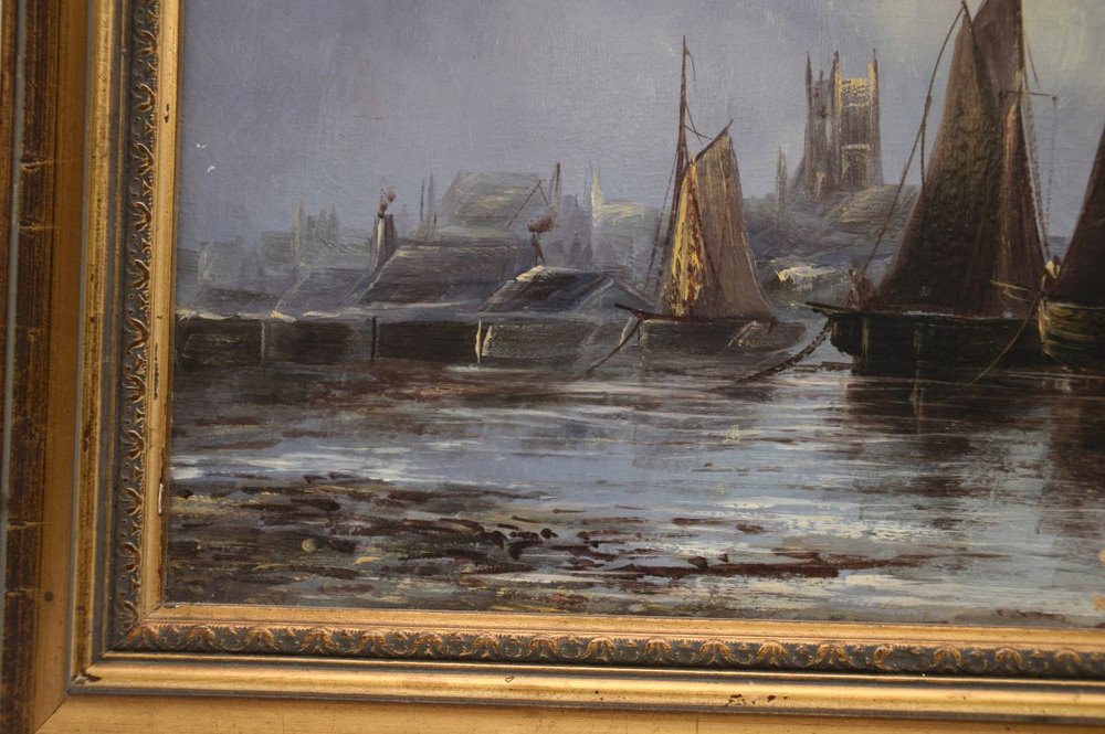 A wonderful antique Italian oil painting, depicting sail boats in a harbour. This was most likely made in Italy, it dates from around the mid twentieth century.
