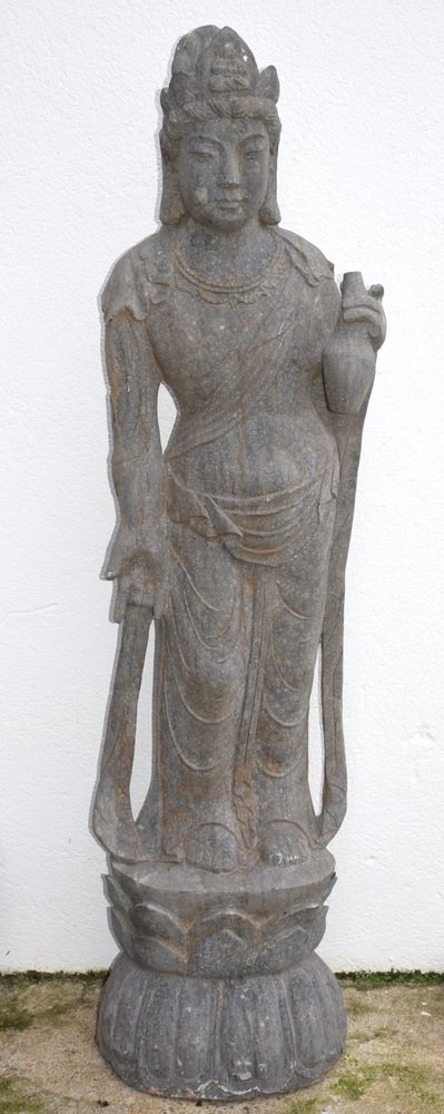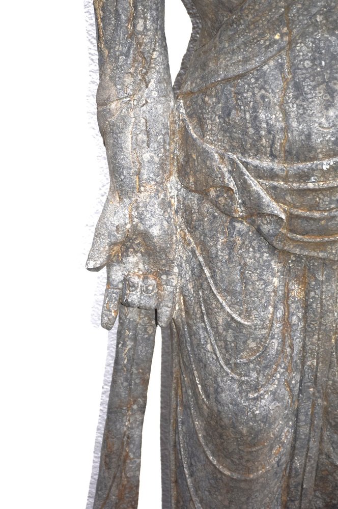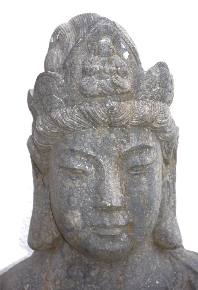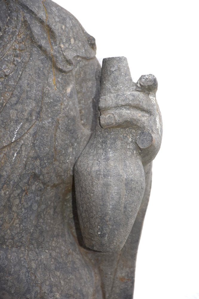 Bodhisttra Avalokiteshvara "the one who looks down on us" with Amithaba Buddha in his bun. with his right hand, he makes the gesture of giving, and with his left, he holds the anointing vessel to bless. Normal condition and patina for this very old Buddha, missing fingers on the left hand, the rest in good overall condition for such a pre-18th century antique.