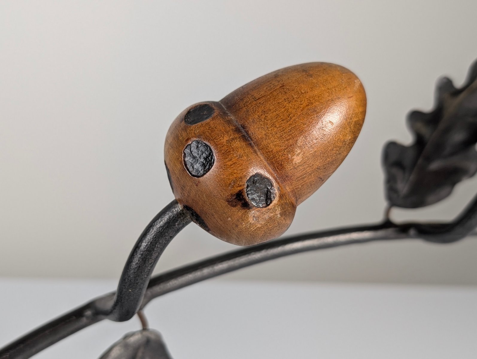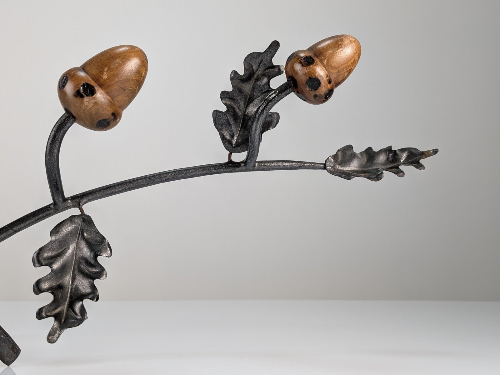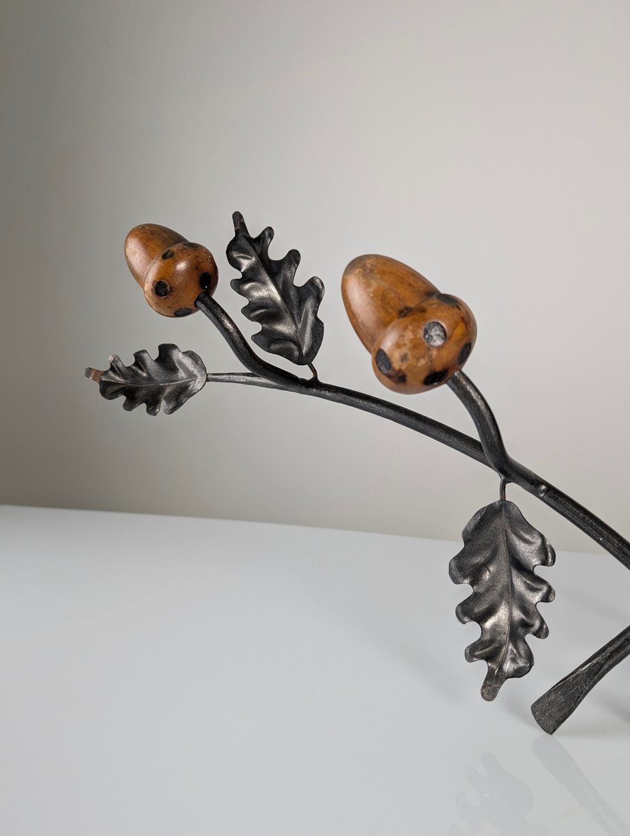 Hand-forged in the 1960s, this exceptional wall-mounted coat rack stands as a prime example of European organic design. Its wrought iron frame, adorned with oak leaves and beautifully hand-carved wooden acorns that serve as hooks, offers a storage solution that is both practical and aesthetically pleasing. The iron features a rich, textured black finish that contrasts beautifully with the natural warmth and grain of the solid wood elements. Signed by the artist, this piece exemplifies the mid-20th-century decorative arts trend of integrating naturalistic motifs into the home to soften architectural lines. The meticulous attention to detail in the forged foliage and the sculptural quality of the acorns demonstrate superior craftsmanship. This work transforms a utilitarian object into a functional sculpture, bringing a touch of nature and timeless elegance to any entryway, uniting rustic charm with modernist simplicity.
