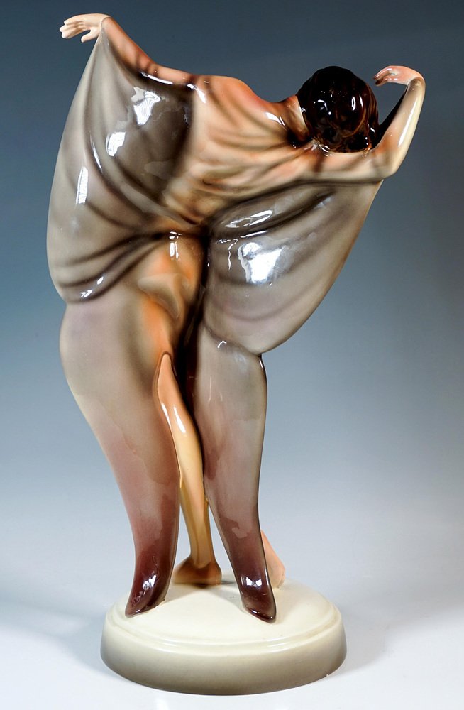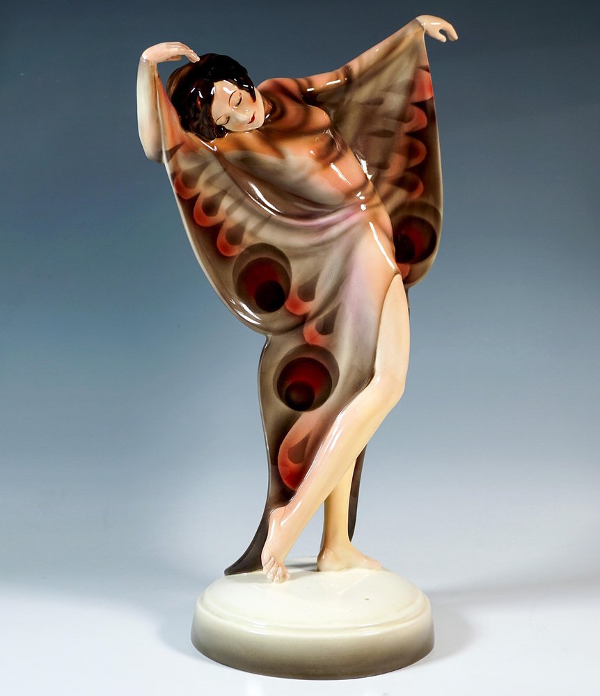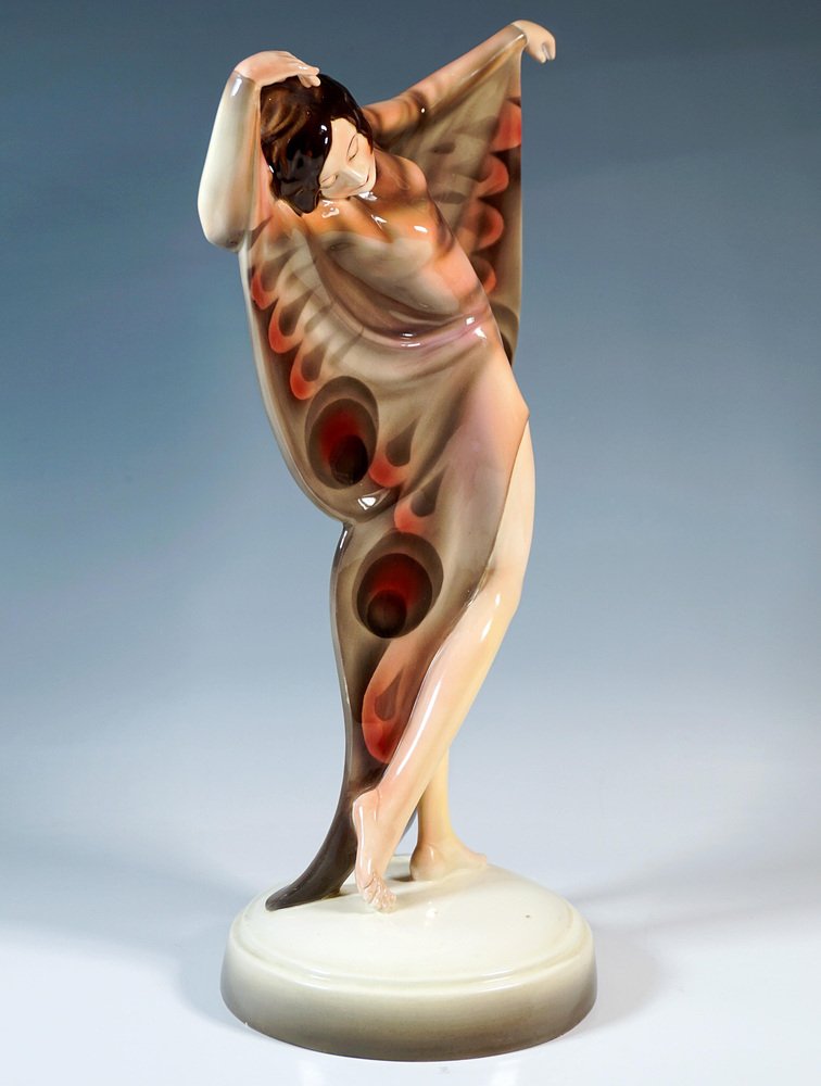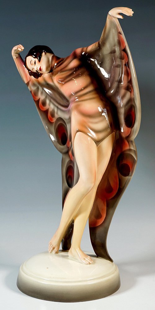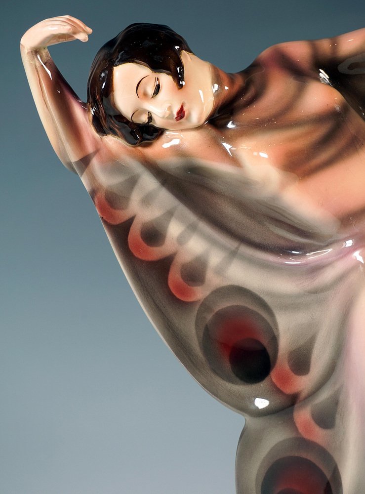Excellent ceramic figurine with rare decotation of the 1930s: The sculpture depicts a dancer in a butterfly costume. Standing with her arms raised and her head tilted to one side, she performs a slight twisting movement. The translucent costume and the fabric falling from the sleeves are reminiscent of butterfly wings, decorated in shades of light grey and pink. On a beige, slightly domed and stepped round base with grey shading on the sides, signature 'Lorenzl' on the left wing tip at the bottom rear. Designed by Josef LORENZL (1892 - 1950), who was an Austrian sculptor and ceramic modeler. His bronze statuettes often show graceful dancers with long legs and closed eyes. Lorenzl designed numerous ceramics for Friedrich Goldscheider and Keramos and was one of the most popular artists of Art Deco. Model 5900 was created circa 1929 and made circa 1930/35 Manufactory: Goldscheider Vienna / Austria Material & Technique: hand-crafted ceramics, white earthenware, hand-painted, glossy finish Dimensions: Height: 46,0 cm / 18.11 in Width: 26,0 cm / 10.23 in Depth: 18,0 cm / 7.08 in Marks: Model number 5900 / 121 / 8 Goldscheider Wien (Vienna) manufactory stamp MADE IN AUSTRIA / HAND-DECORATED Painter's and former's signs existing Artist's signature on the reverse side on wing tip Bibliography: DECHANT / GOLDSCHEIDER, GOLDSCHEIDER: Firmengeschichte und Werkverzeichnis / History of the company and catalogue of works, Stuttgart (Germany), 2007, page 419, number 5900. Condition: Very good