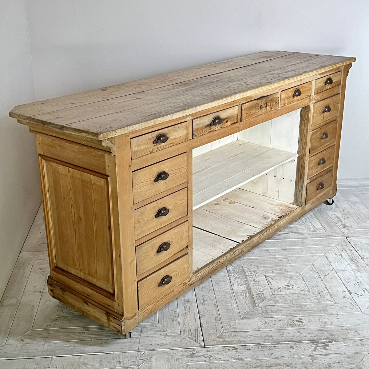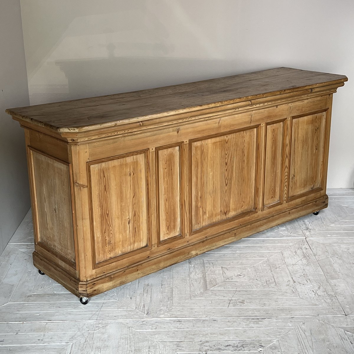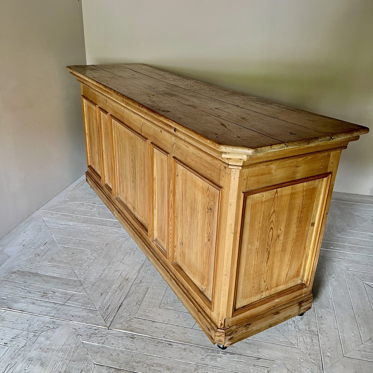This rustic French pine haberdashery shop counter features a wonderful grain and rich color on its triple-planked top, complemented by canted corners at the front, finished with an attractive Ogee-style architectural moulding. Below the top, there’s a spacious shelved area with two shelves, each providing ample storage space at approximately 110cm wide by 33cm high.