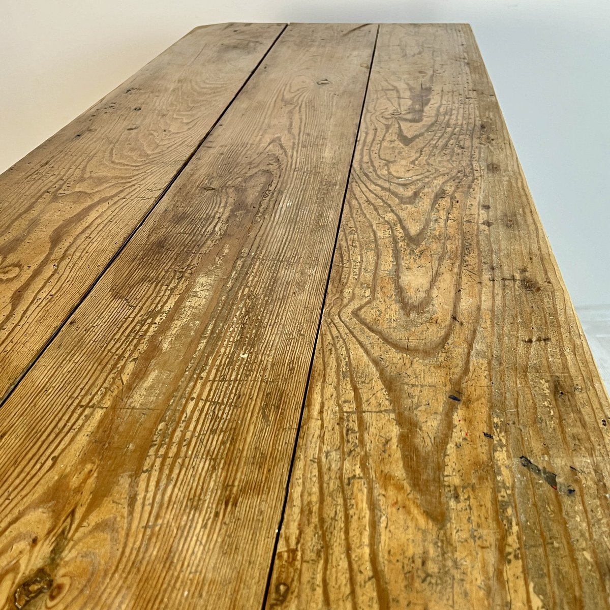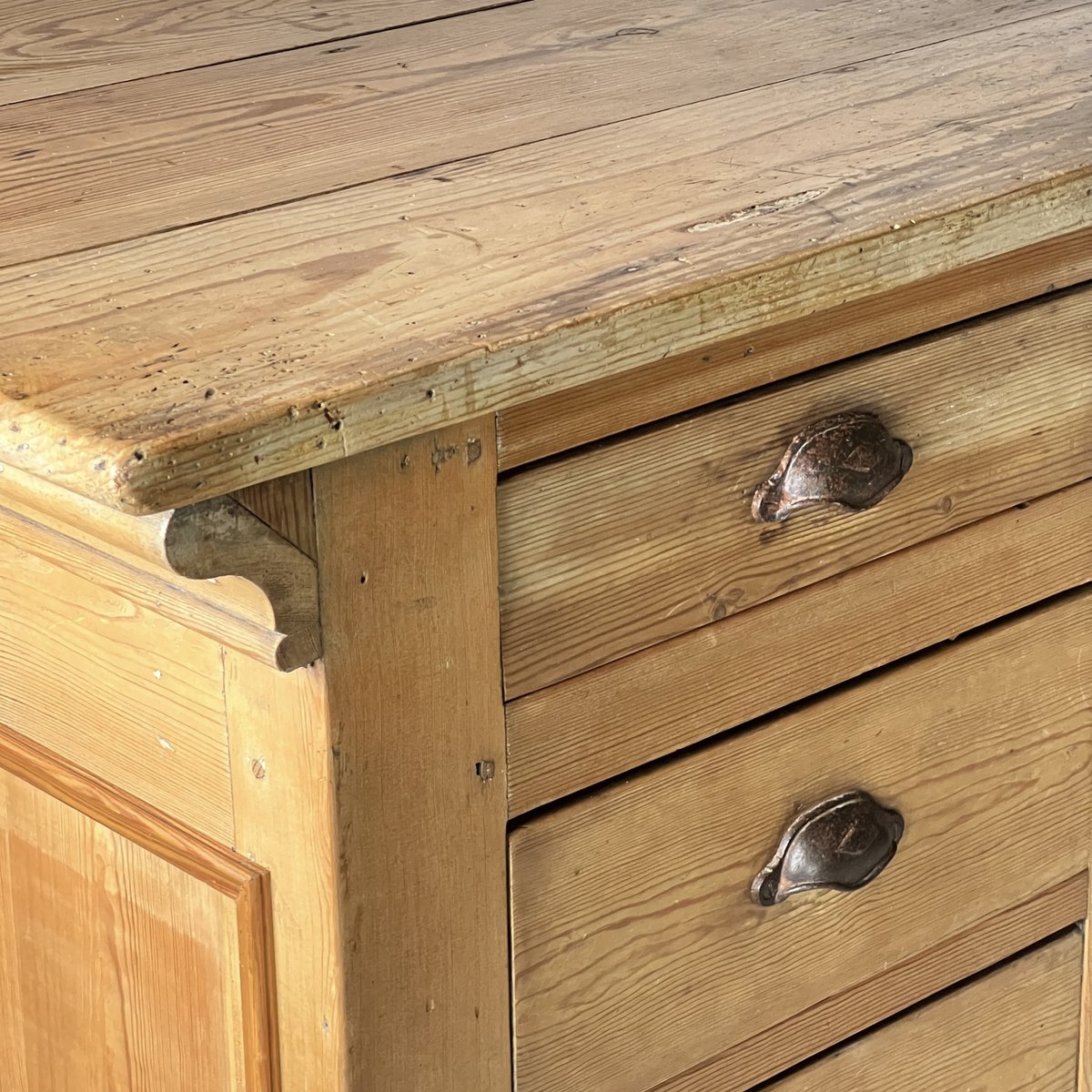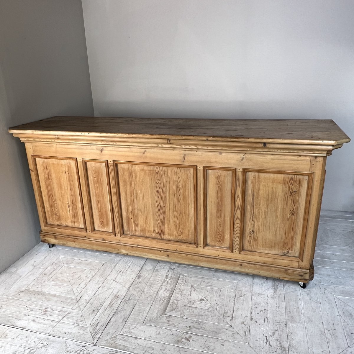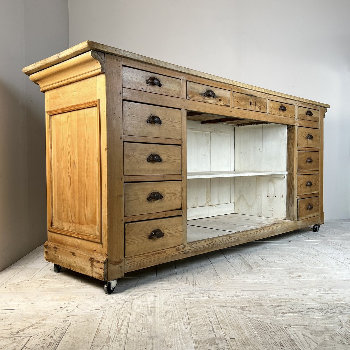This rustic French pine haberdashery shop counter features a wonderful grain and rich color on its triple-planked top, complemented by canted corners at the front, finished with an attractive Ogee-style architectural moulding. Below the top, there’s a spacious shelved area with two shelves, each providing ample storage space at approximately 110cm wide by 33cm high.