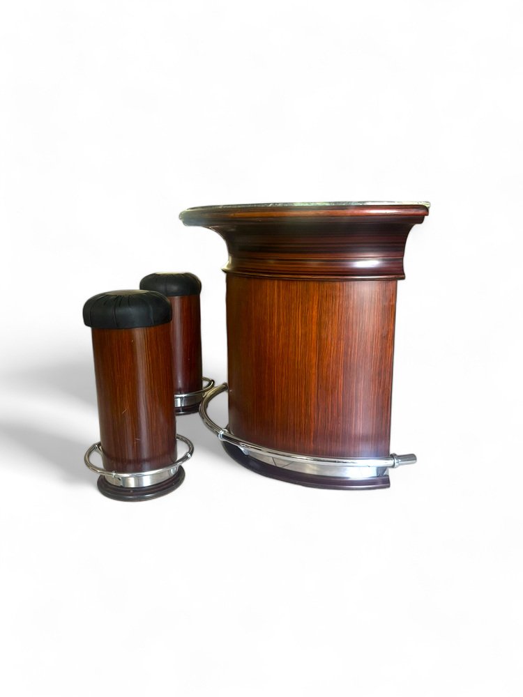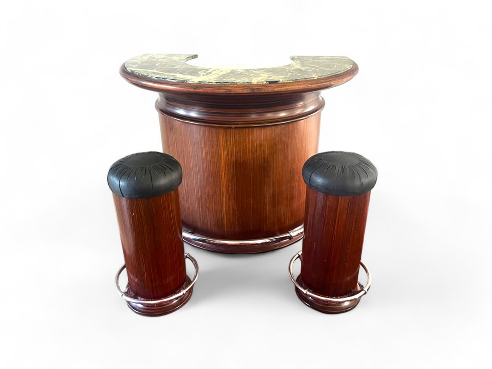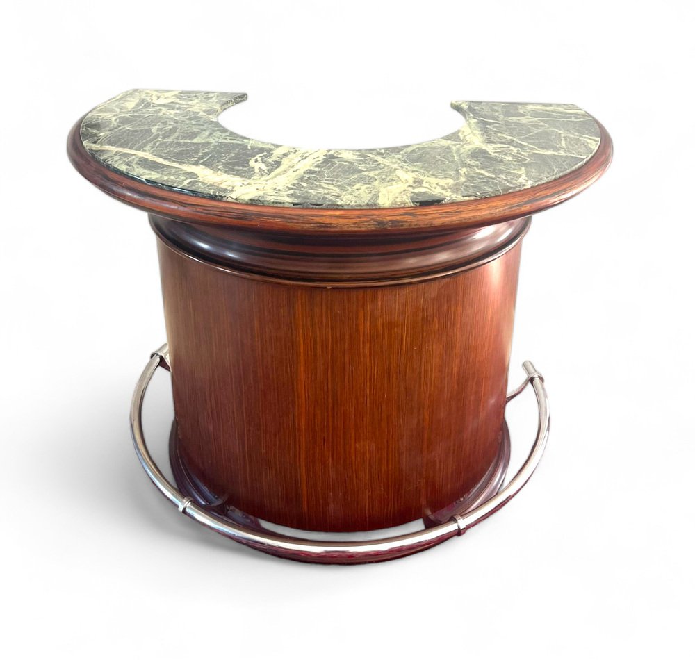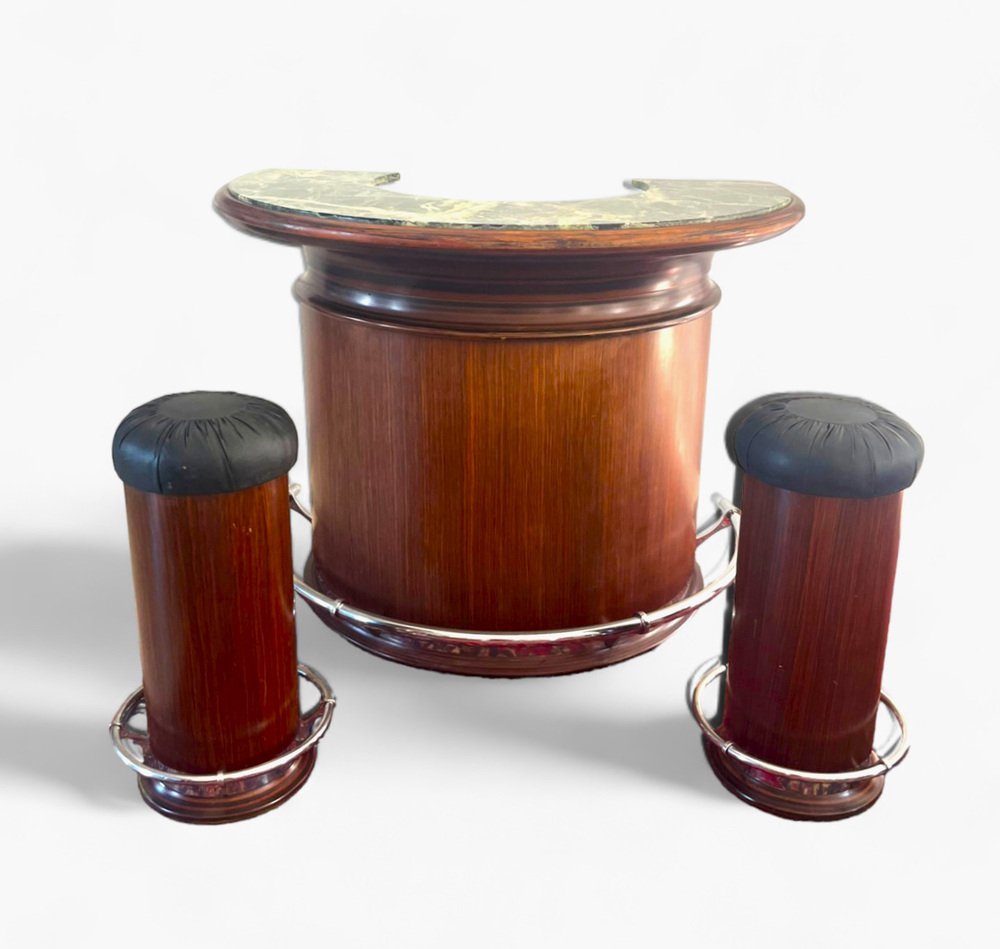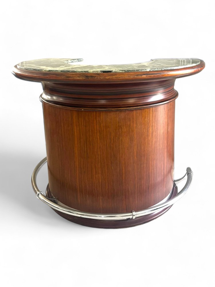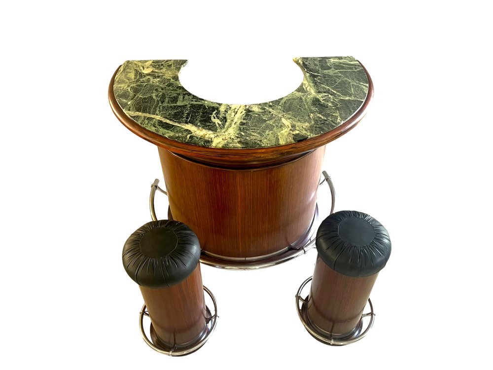 Bellissimo set da bar Art Déco composto da un elegante mobile bar rotondo/mezzaluna e due sgabelli da bar abbinati. L'impiallacciatura in legno nativo è bellissima. Il mobile bar è cilindrico e ospita 2 grandi cestini cromati per bicchieri e bottiglie. La struttura è rifinita con un bellissimo piano in marmo verde a forma di semicerchio. Il piano poggia su una sporgenza modellata che ammorbidisce la geometria del design, in uno stile tipicamente Art Déco.