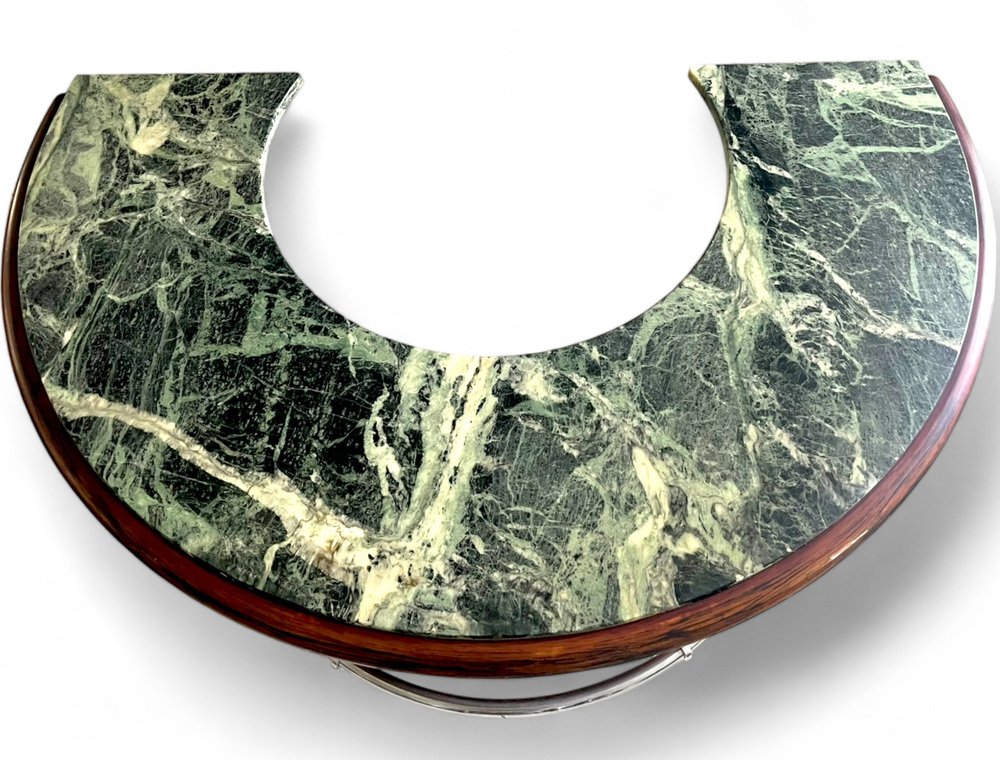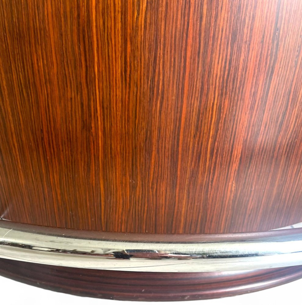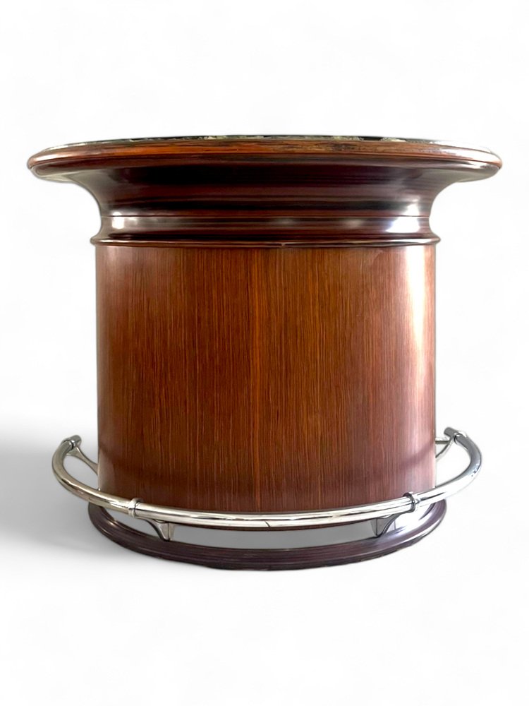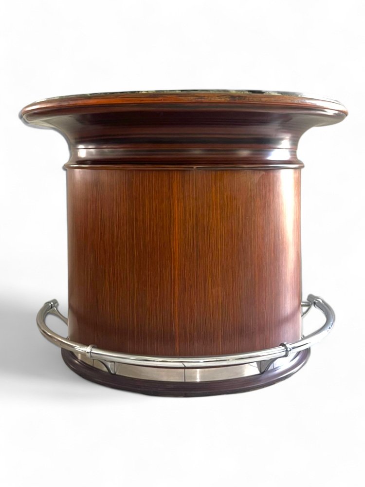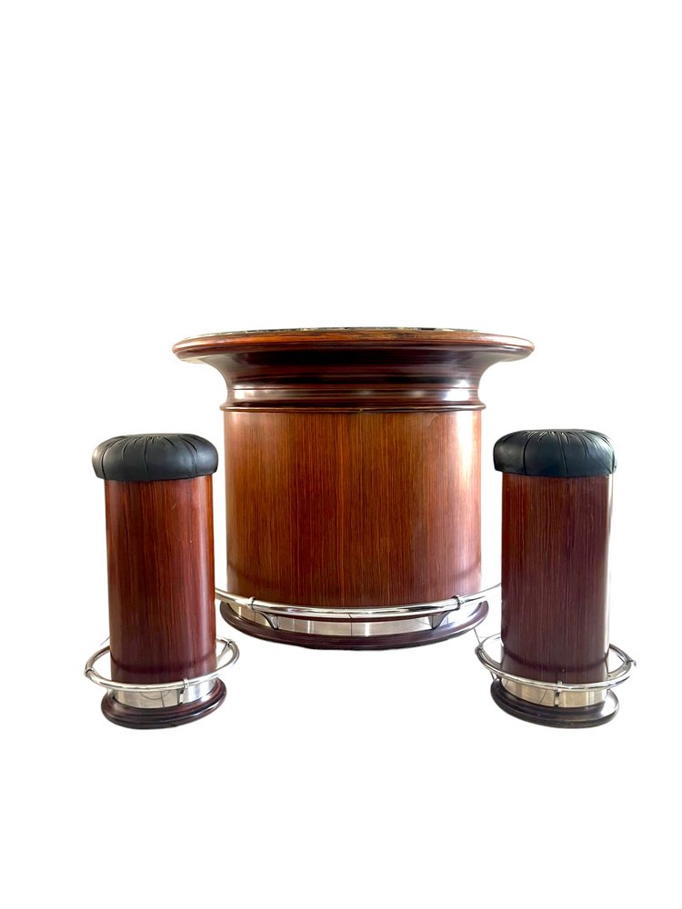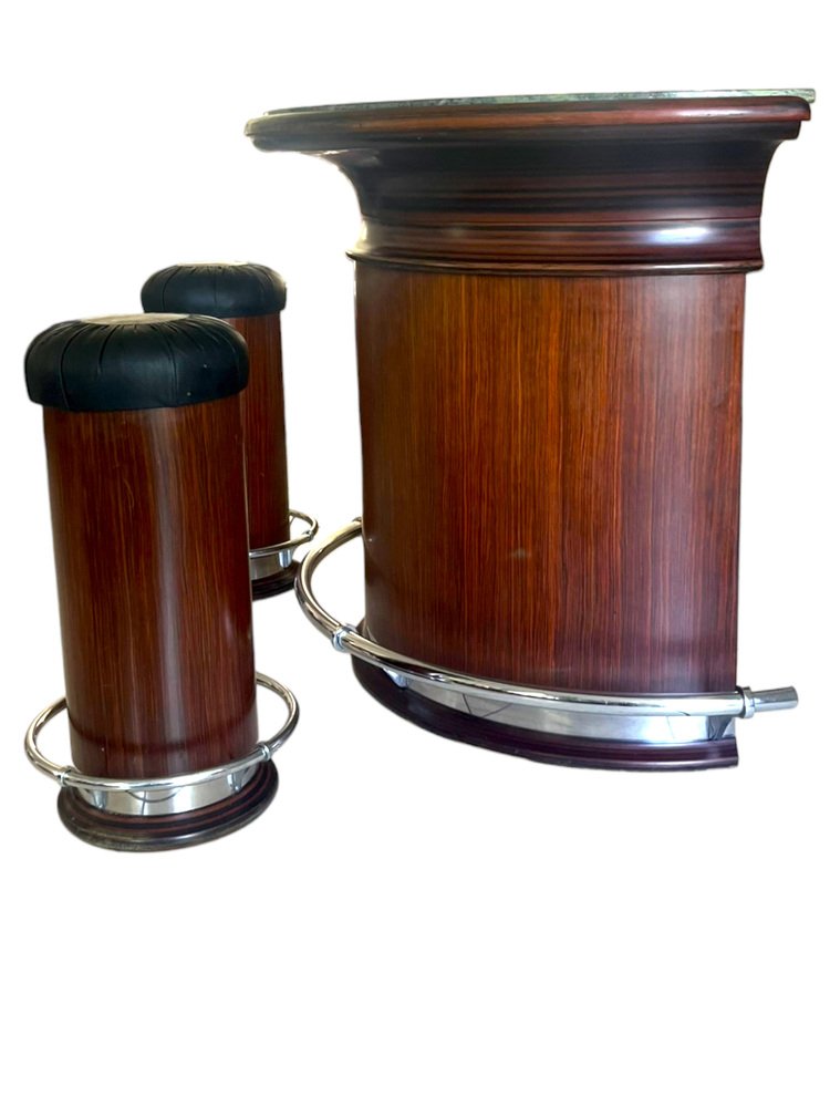 Bellissimo set da bar Art Déco composto da un elegante mobile bar rotondo/mezzaluna e due sgabelli da bar abbinati. L'impiallacciatura in legno nativo è bellissima. Il mobile bar è cilindrico e ospita 2 grandi cestini cromati per bicchieri e bottiglie. La struttura è rifinita con un bellissimo piano in marmo verde a forma di semicerchio. Il piano poggia su una sporgenza modellata che ammorbidisce la geometria del design, in uno stile tipicamente Art Déco.