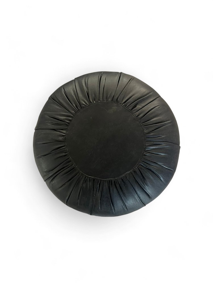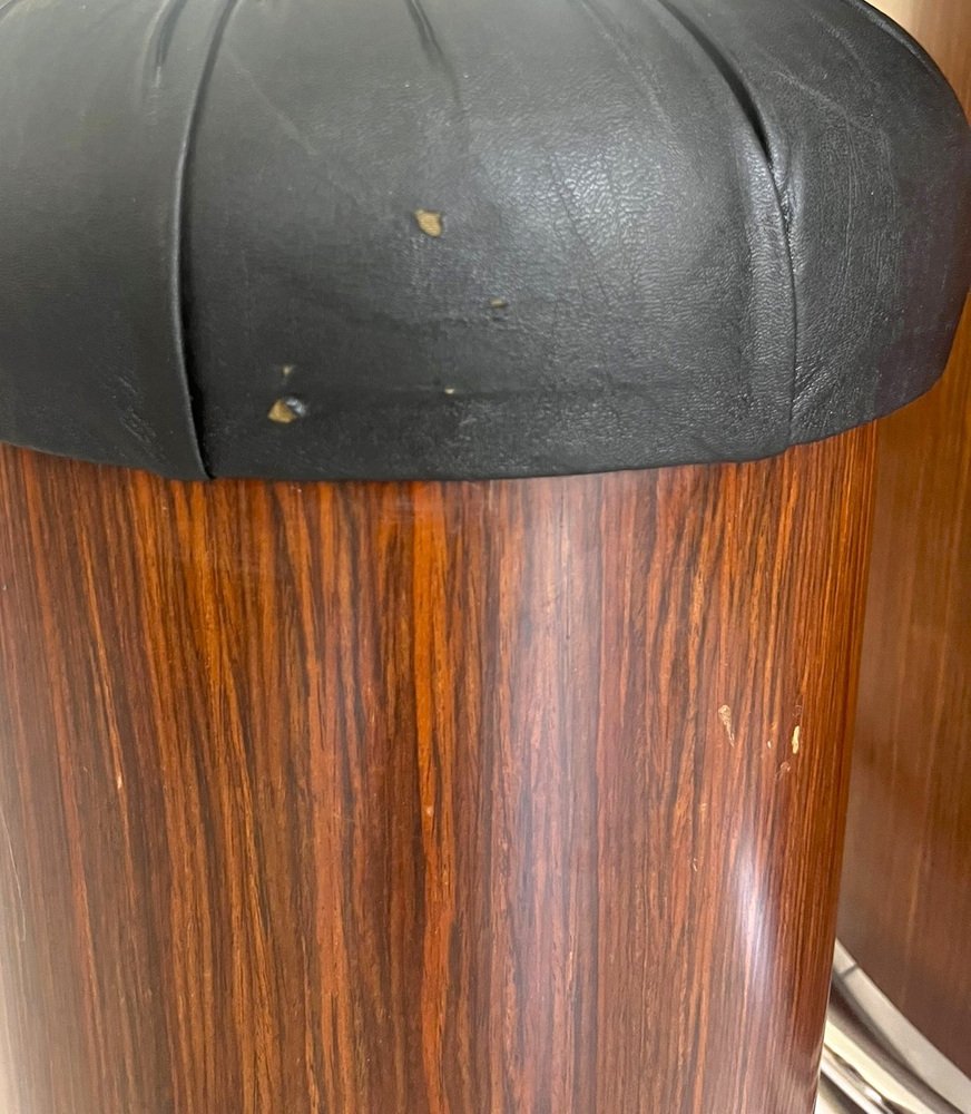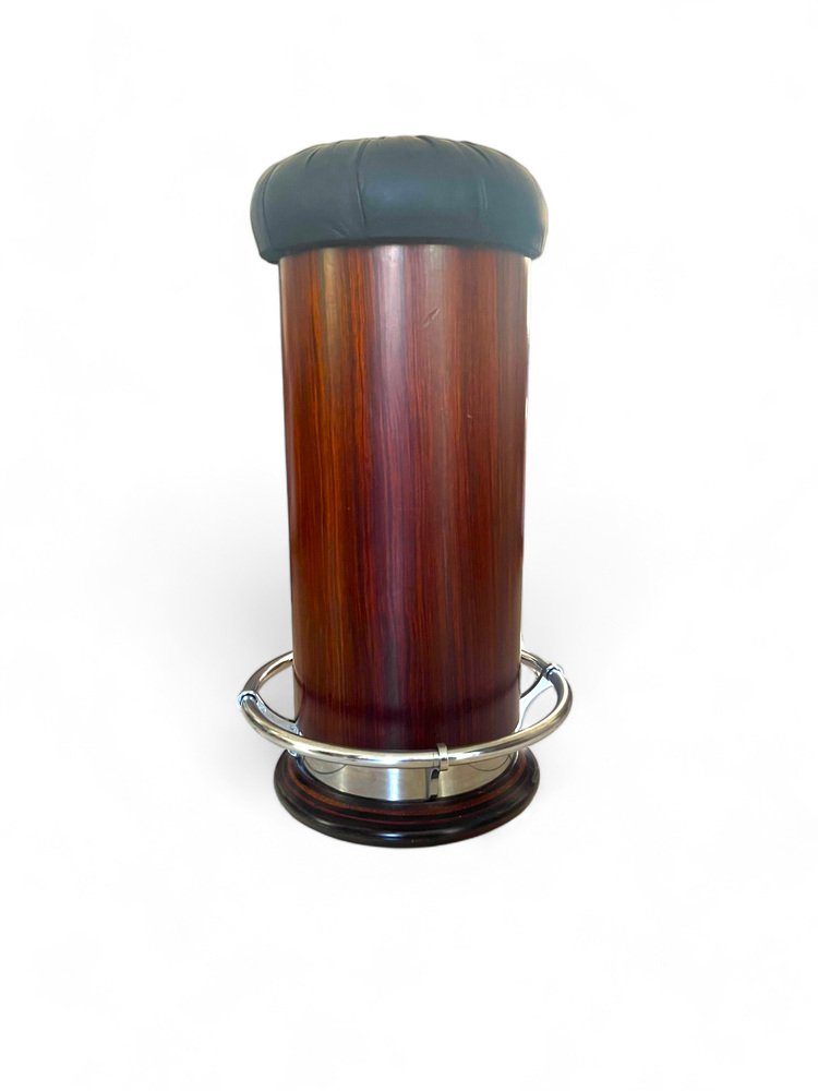 La coppia di sgabelli segue lo stesso design stilizzato, con le sedute cilindriche che presentano lo stesso tubo e l'ampia fascia metallica cromata del bancone. La seduta in pelle è molto accogliente e confortevole. Le cromature sono marcate "MM"