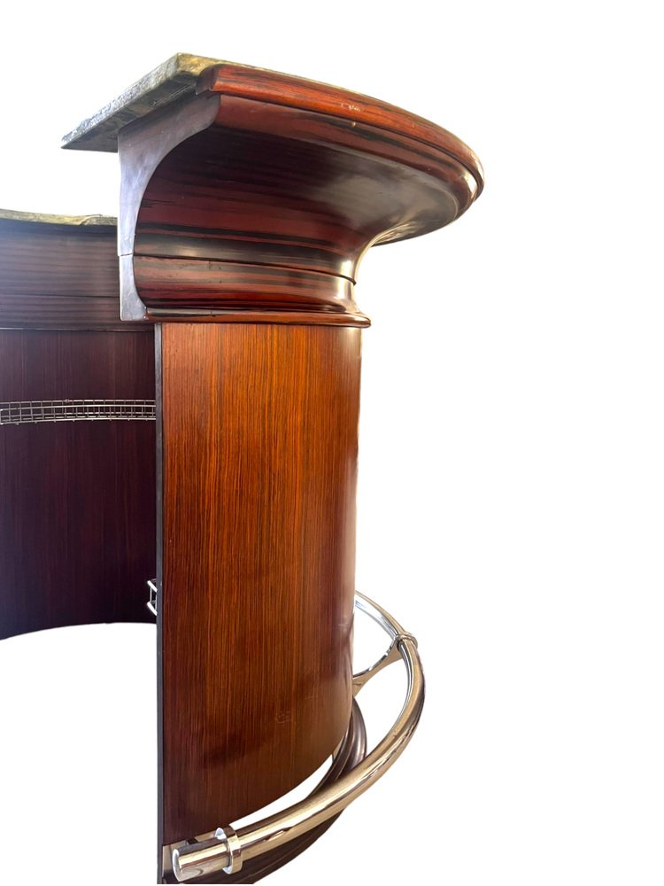 Very beautiful Art Deco bar set consisting of an elegant round/half-moon bar cabinet and two matching bar stools. The native wood veneer is beautiful. The bar is cylindrical and houses 2 large chrome baskets for glasses and bottles. The structure is finished with a very beautiful green marble top in the shape of a semicircle. The top rests on a molded projection which softens the geometry of the design, in a typically Art Deco style.