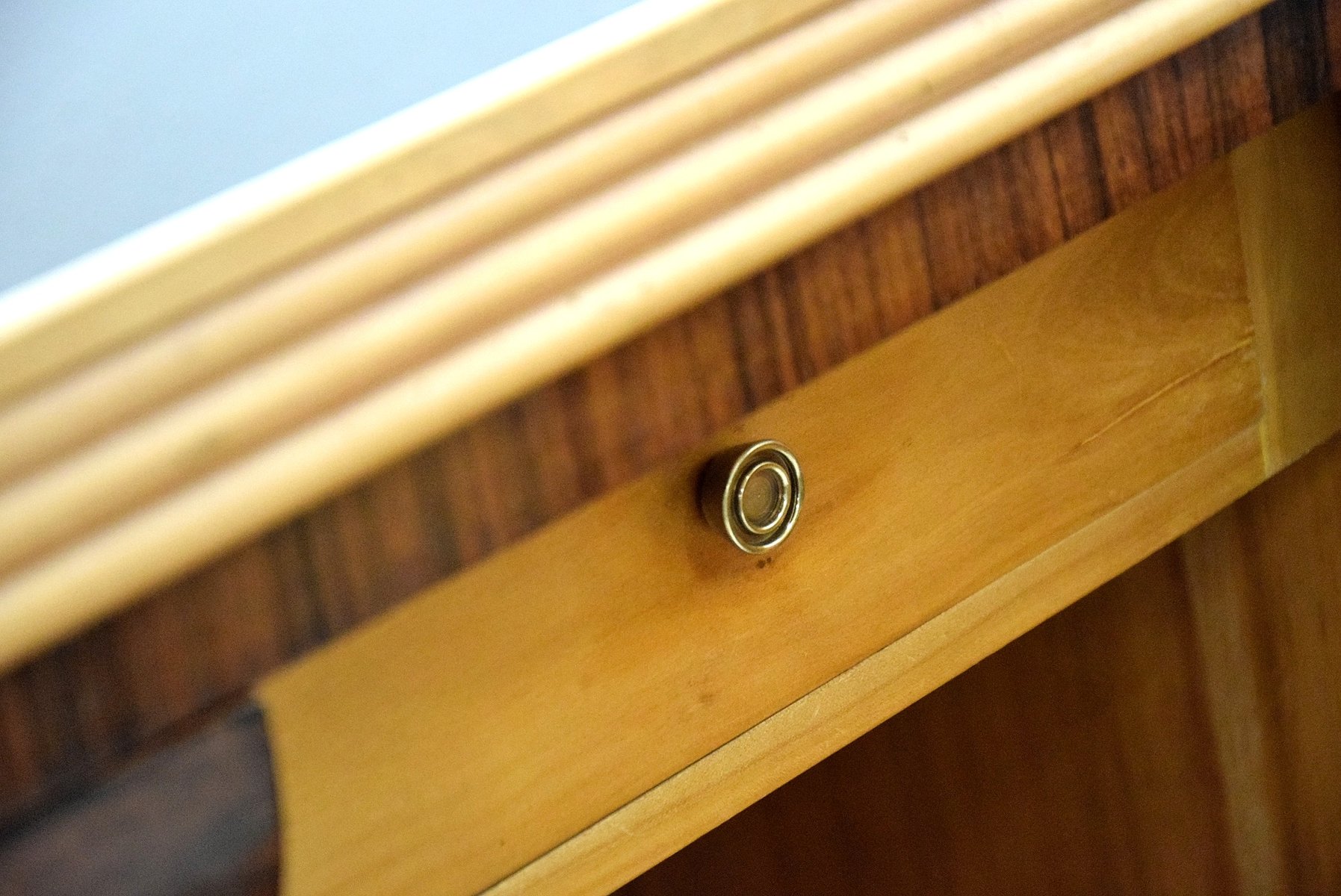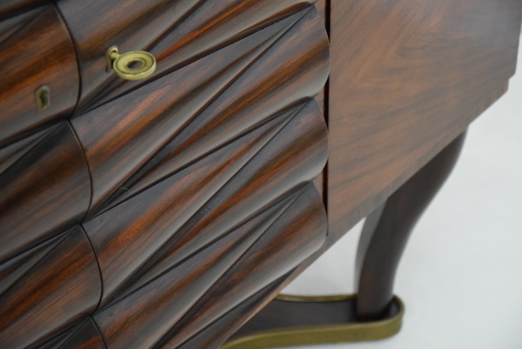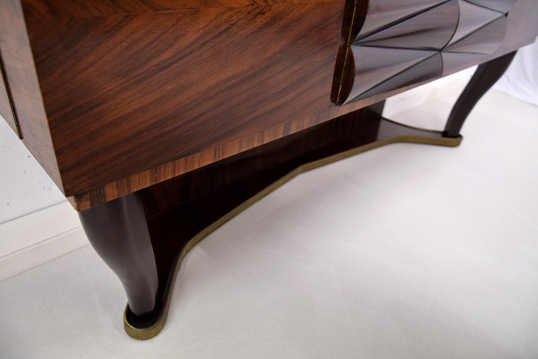 This rare and elegant dry bar, designed by the iconic Italian architect and designer Osvaldo Borsani in the 1940s, is a testament to the timeless artistry of mid-century modern furniture. Crafted with jatoba veneer (a hardwood prized for its durability and rich, warm tones), this piece exudes sophistication and luxury.