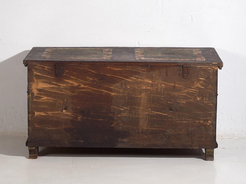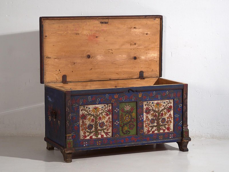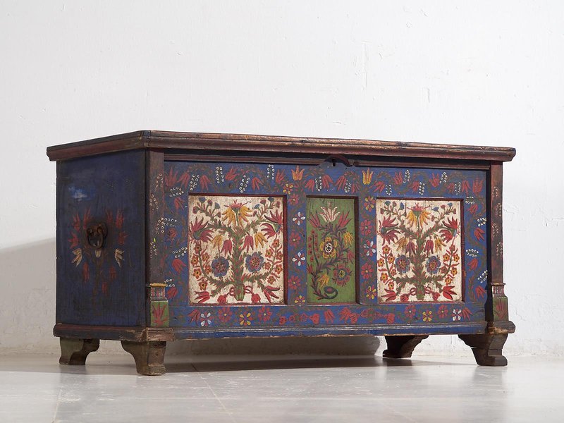 Baule antico blu con dettagli floreali dipinti a mano, anni '70 dell'Ottocento