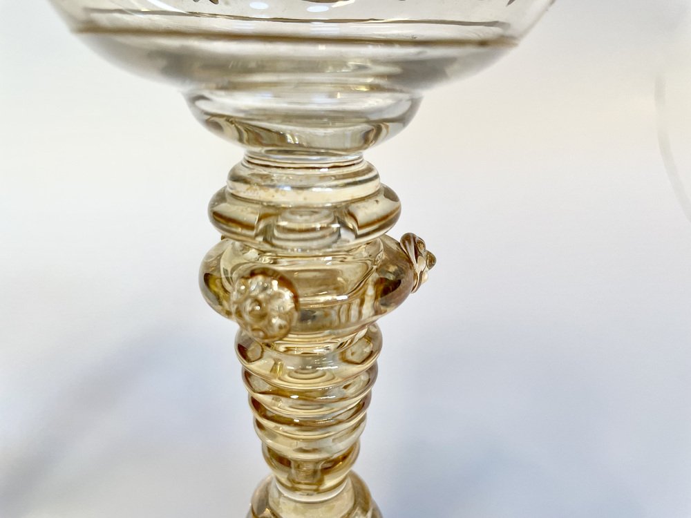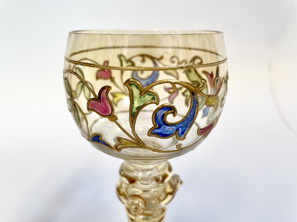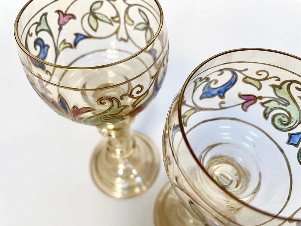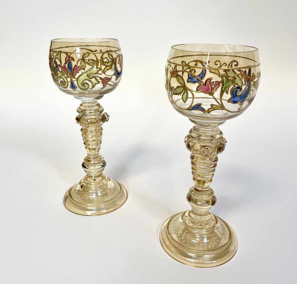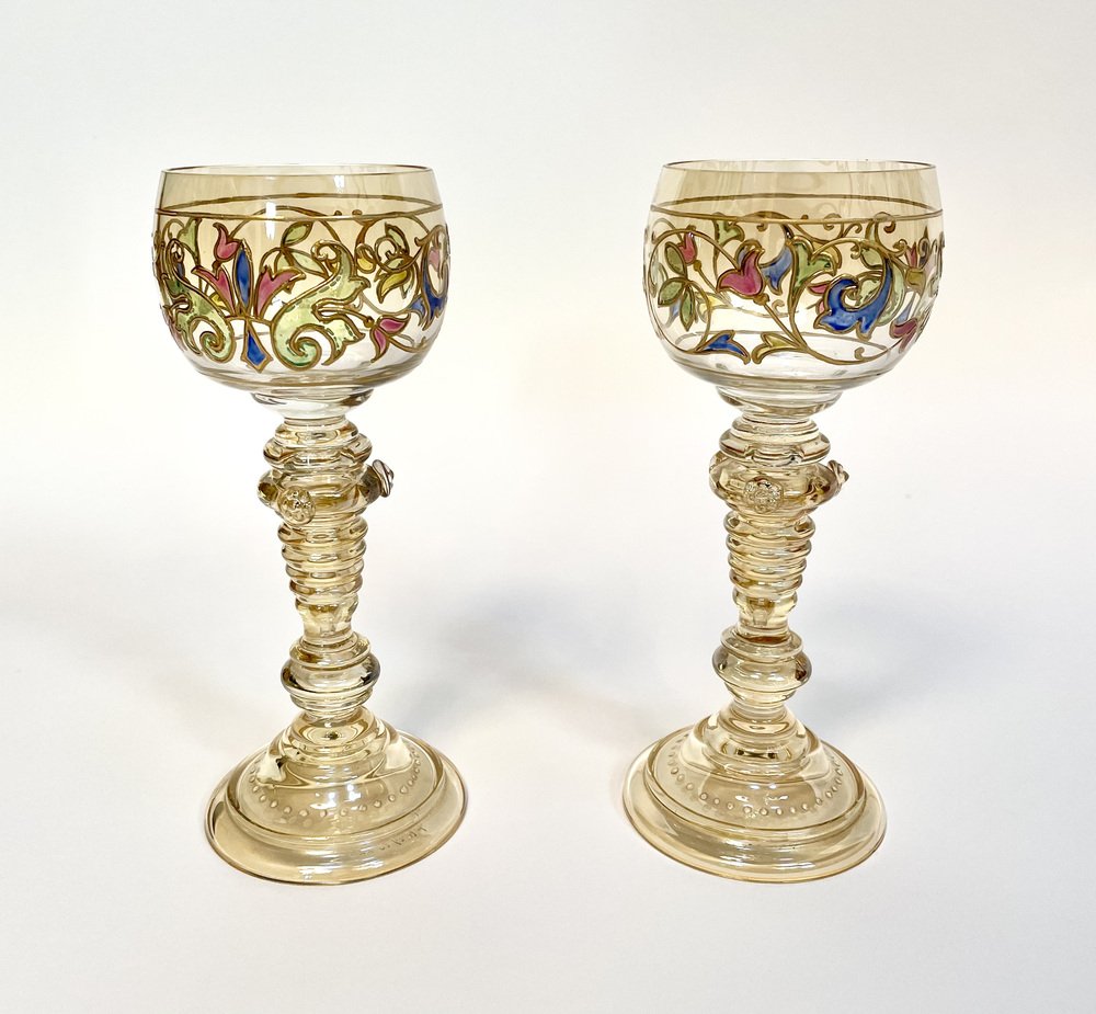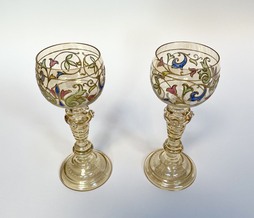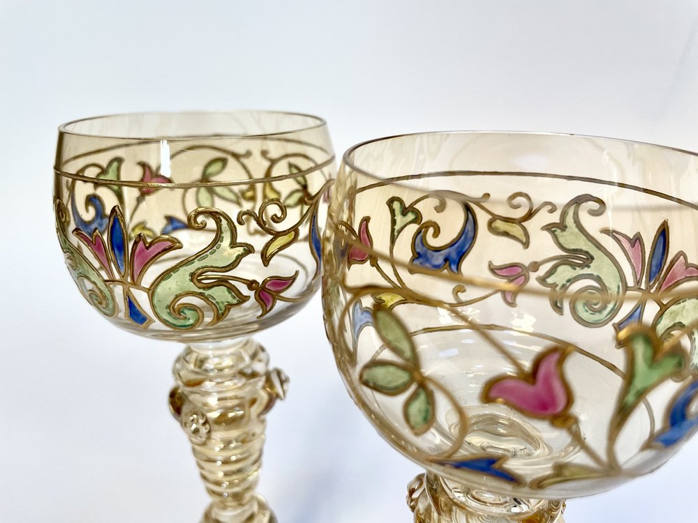 Bicchieri da vino Art Nouveau in stile romano con bicchiere in cristallo dipinto a mano di Glashütte Theresienthal, Germania, anni '20, set di 2