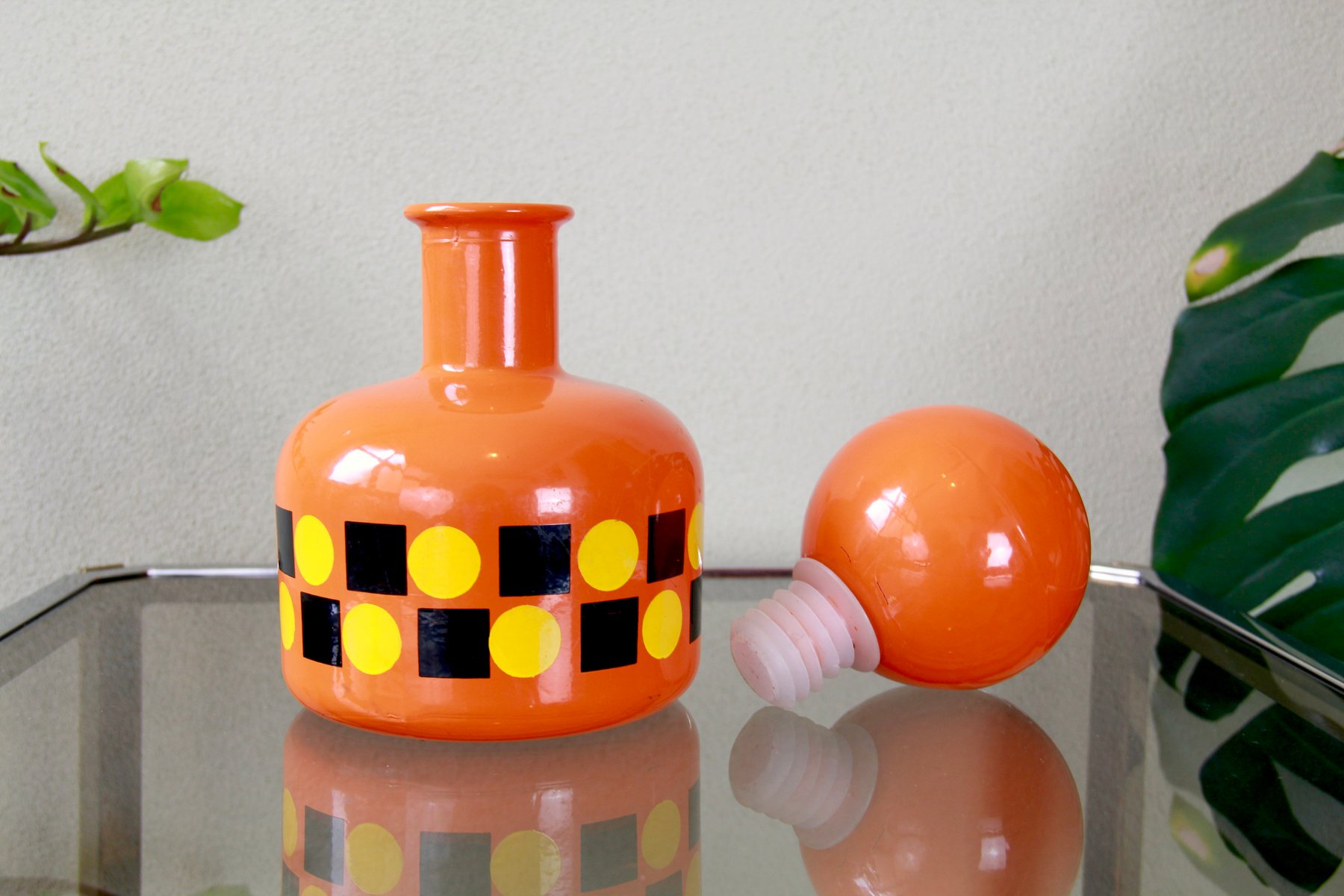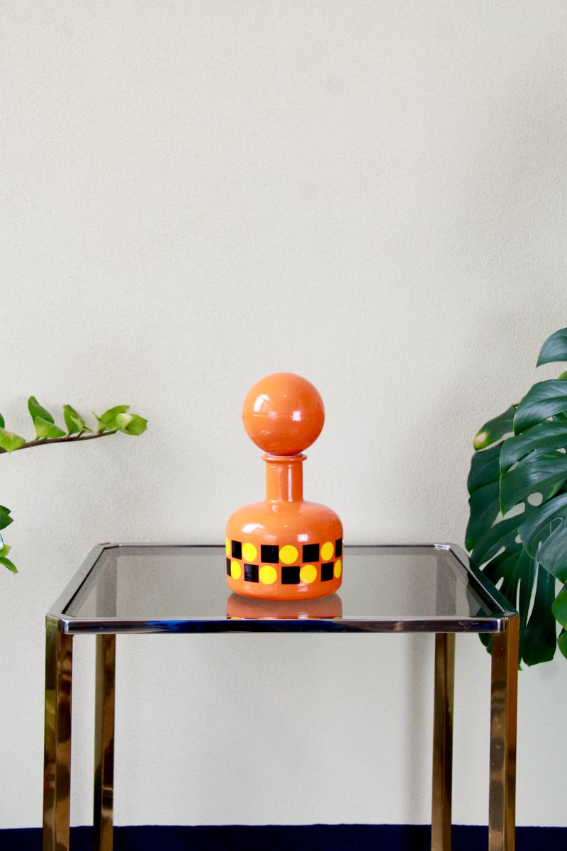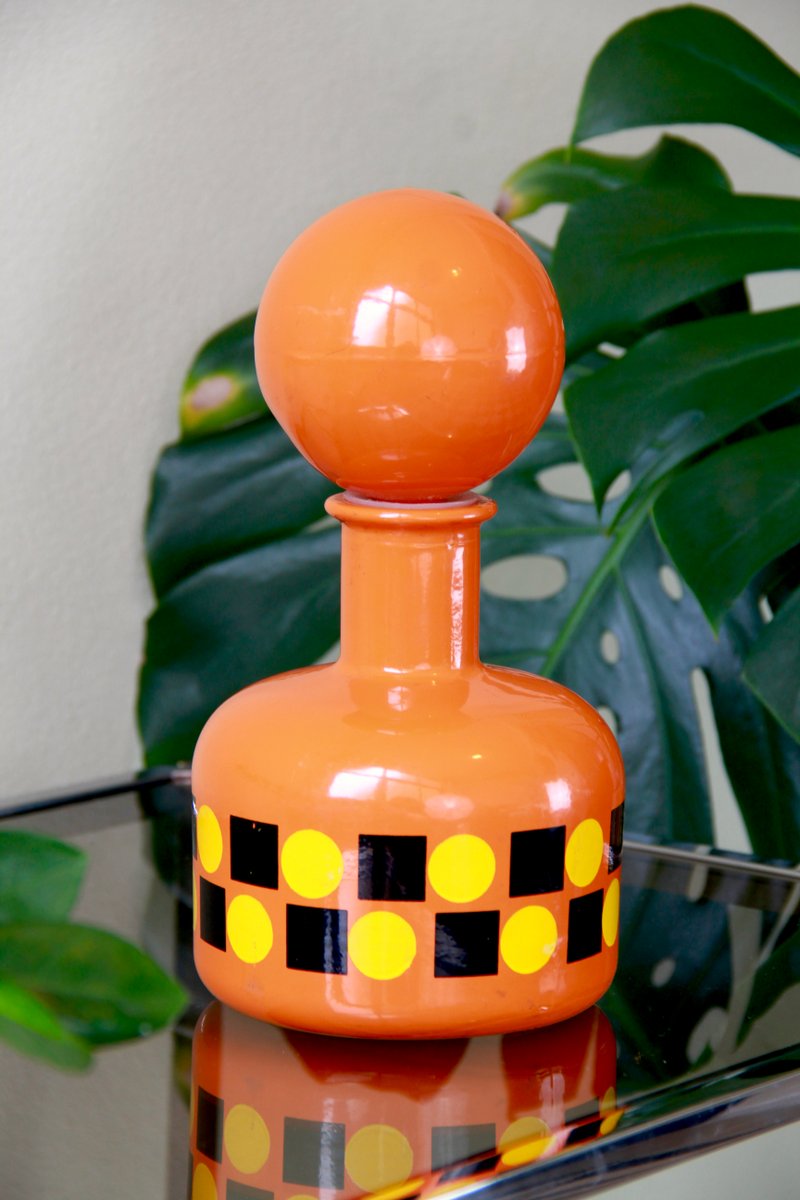 The entire bottle and stopper are made of glass and are dip-coated in a vibrant orange, featuring geometric patterns in yellow and black that run around its belly.