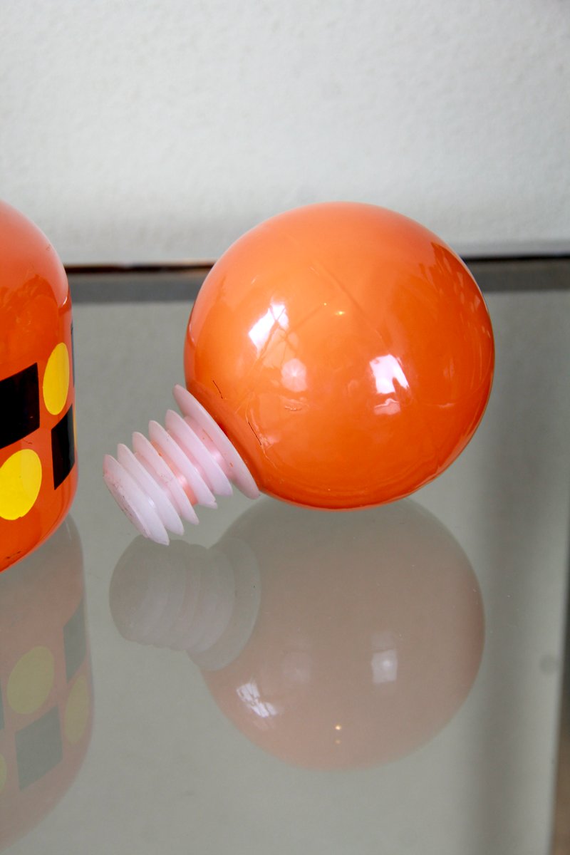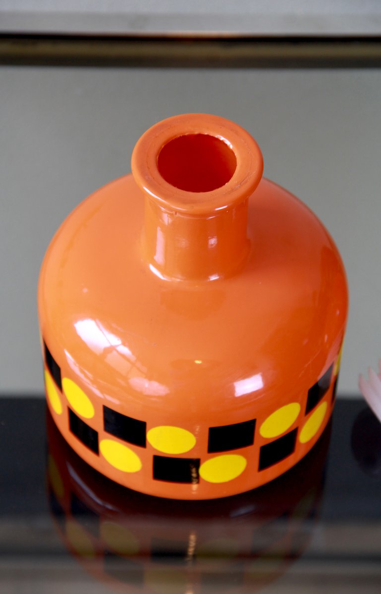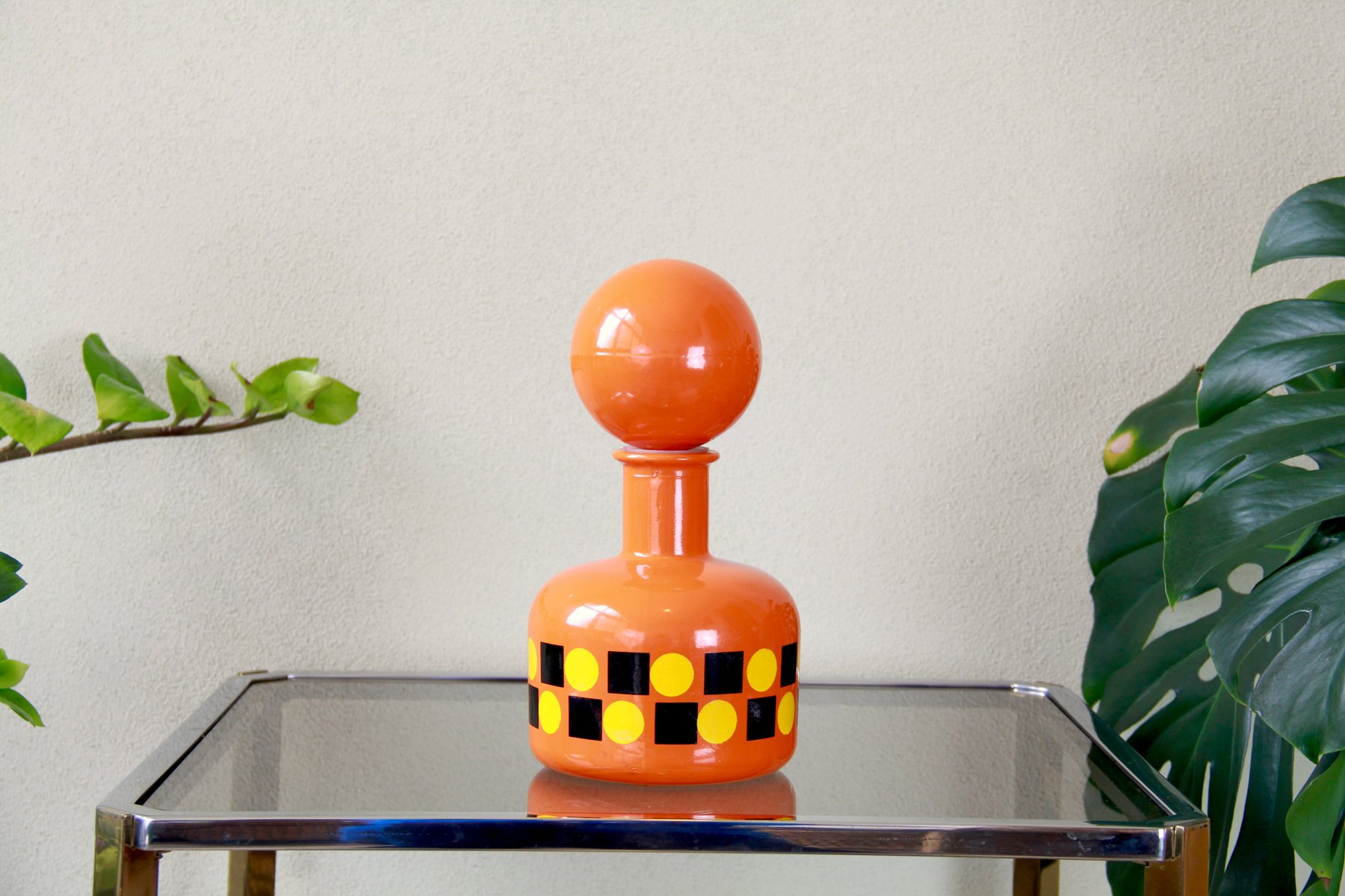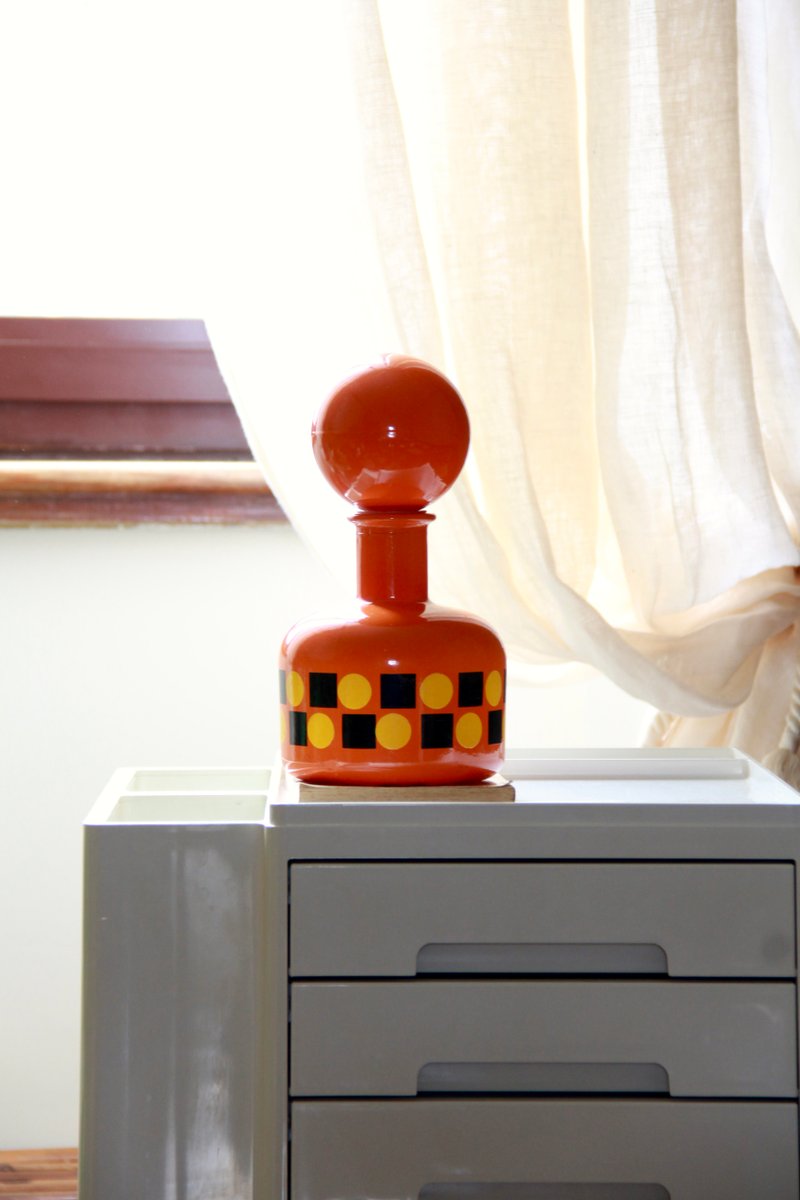 The entire bottle and stopper are made of glass and are dip-coated in a vibrant orange, featuring geometric patterns in yellow and black that run around its belly.