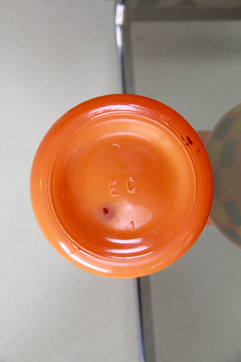 L'intera bottiglia e il tappo sono realizzati in vetro e sono rivestiti di un vivace colore arancione, con motivi geometrici in giallo e nero che corrono intorno alla pancia.