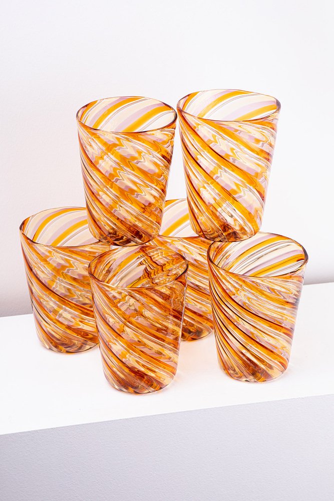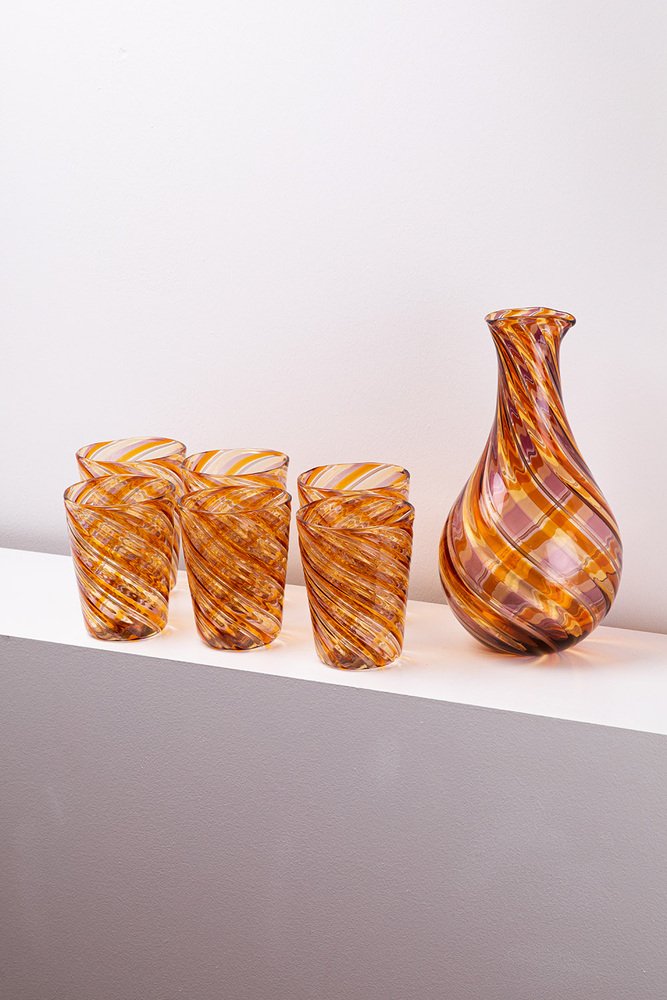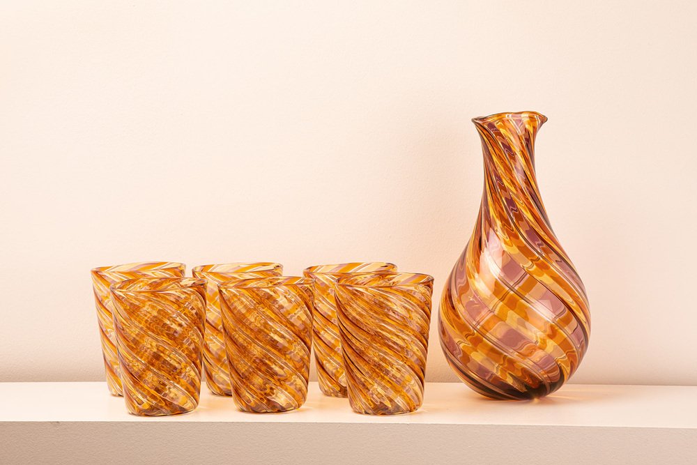 Questo set di sette pezzi, tra cui una brocca e sei bicchieri, è uno straordinario esempio di artigianato italiano del vetro di Murano, che fonde il design moderno con le tecniche tradizionali. Disegnato da Mariana Iskra, questo set è caratterizzato da un vibrante arancione e da un vetro trasparente soffiato a mano, creando un contrasto sorprendente che mette in risalto la bellezza del vetro di Murano. Le forme pulite e contemporanee lo rendono un'aggiunta di spicco a qualsiasi casa moderna, mentre l'artigianato e i colori vivaci portano in tavola un tocco di eleganza ed energia.