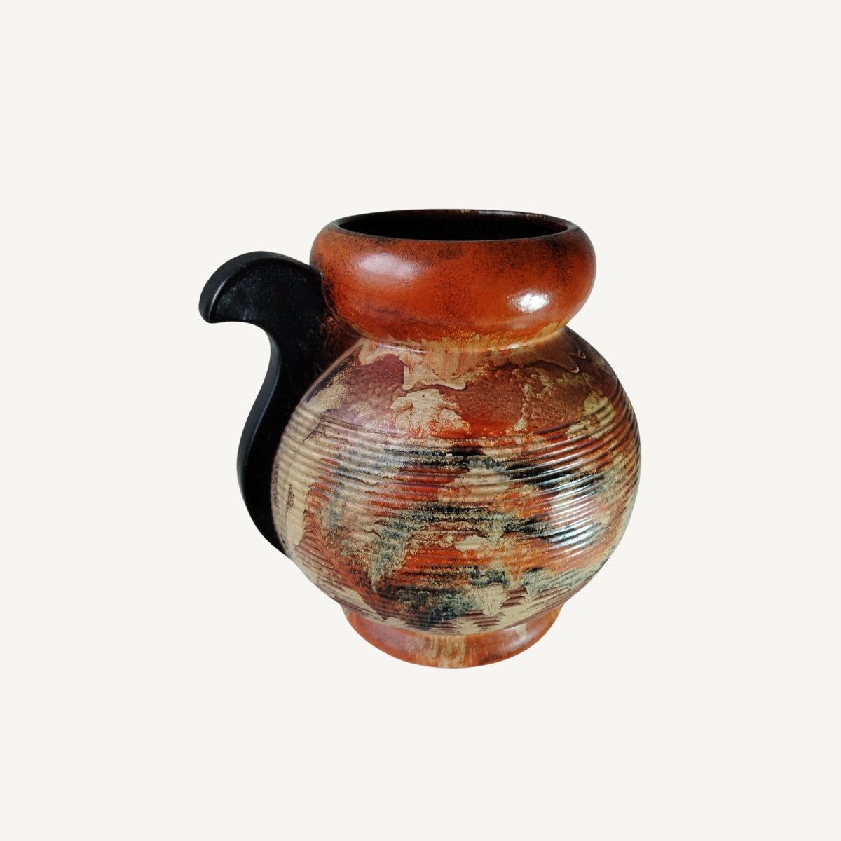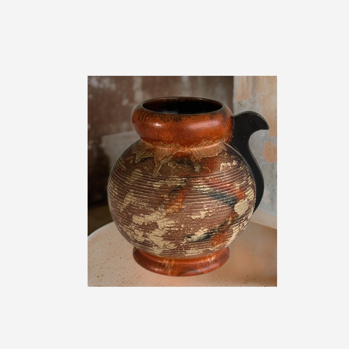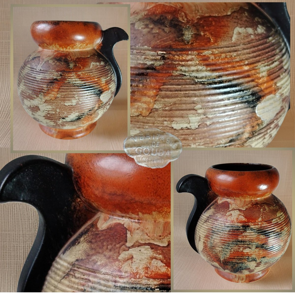 Emotive handcrafted glazed ceramic piece from Gouda (Holland), celebrated for its genuine design and textured reliefs. The pitcher features a delicate combination of warm tones interwoven with organic patterns and subtle lines, evoking natural landscapes and centuries-old traditions. Crafted using traditional techniques, its glazed finish was carefully applied by hand, ensuring a unique and unrepeatable character.
