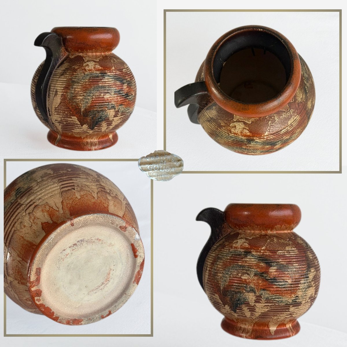 Emozionante manufatto in ceramica smaltata di Gouda (Olanda), celebre per il suo design genuino e i rilievi strutturati. La brocca presenta una delicata combinazione di toni caldi intrecciati con motivi organici e linee sottili, che evocano paesaggi naturali e tradizioni secolari. Realizzata con tecniche tradizionali, la sua finitura smaltata è stata accuratamente applicata a mano, garantendo un carattere unico e irripetibile.