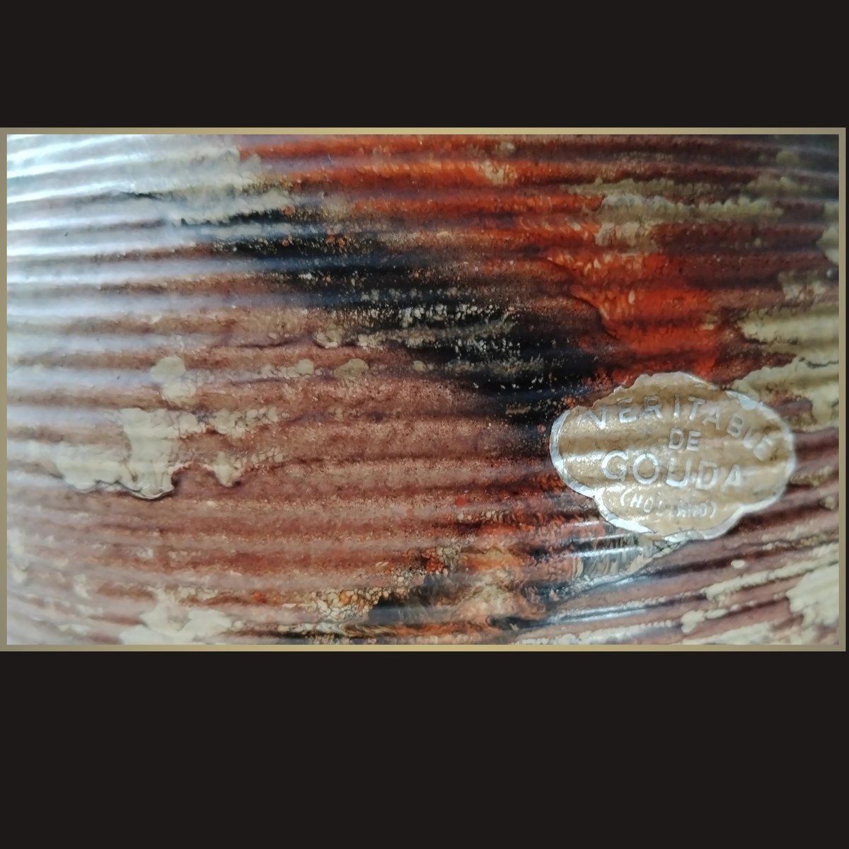 Prodotto a metà del XX secolo, questo pezzo reca il caratteristico sigillo "Véritable de Gouda", che ne certifica l'autenticità come opera originale della rinomata tradizione ceramica olandese.