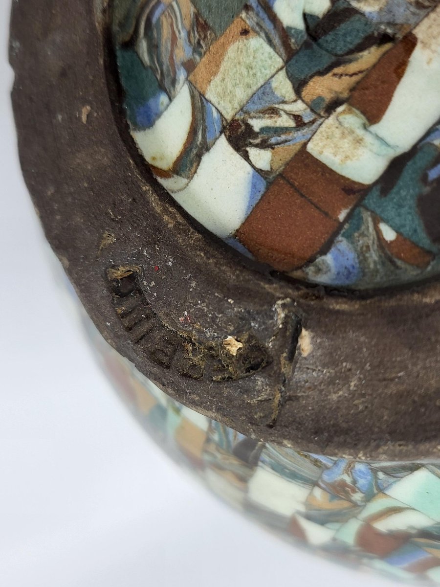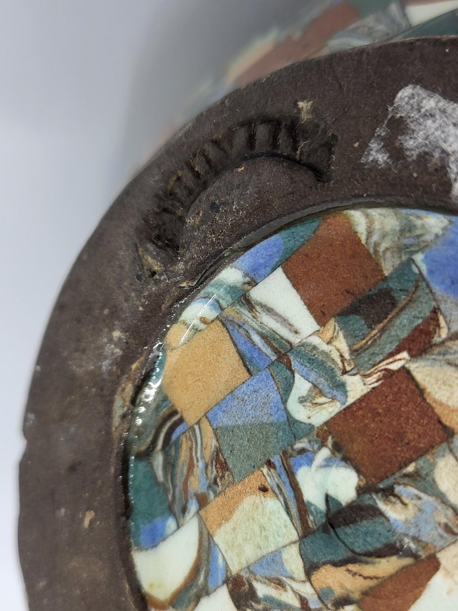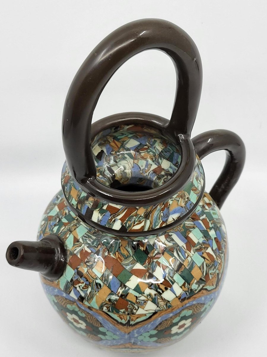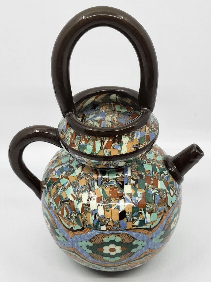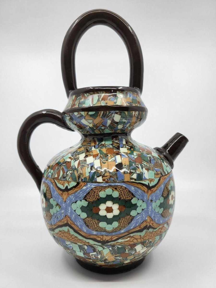 La chevrette o gargoulette in ceramica di Jean Gerbino è un pezzo eccezionale, molto raro da trovare e in perfette condizioni. L'artista, nato nel 1876 e morto nel 1966, iniziò la sua carriera in Italia prima di entrare nella bottega di Delphin Massier. Nel 1930 fondò un proprio laboratorio a Vallauris, dove sviluppò un'innovativa tecnica di mosaico ceramico, che lo distinse tra i suoi contemporanei come Roger Capron e Pablo Picasso. Gerbino riuscì ad affermarsi nella comunità artistica della Costa Azzurra, circondato da figure influenti come Jean Cocteau e Jean Lurçat. Quest'opera testimonia il suo know-how unico e lo spirito creativo che ha contraddistinto l'arte ceramica della regione. Possedere un pezzo realizzato da Gerbino significa possedere un segmento della storia artistica del XX secolo.