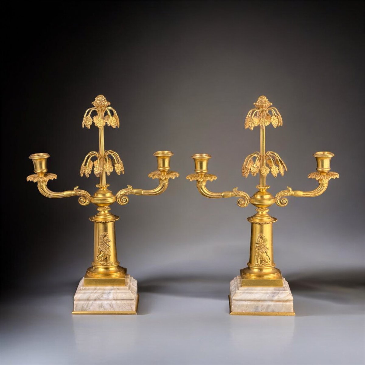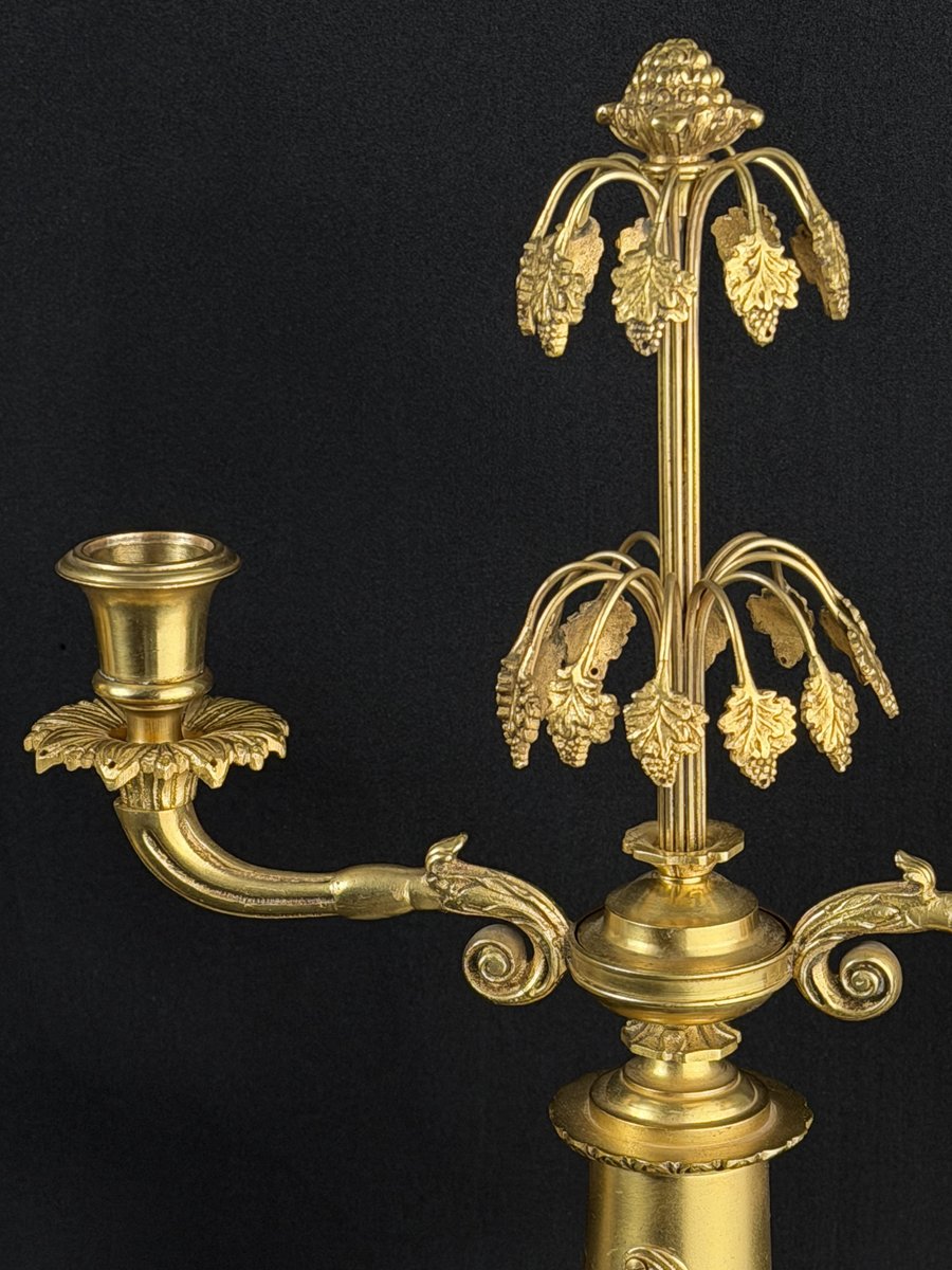 Each candelabrum features a sculptural central column adorned with cascading leaf motifs and a richly detailed floral finial at the top. The curved candle arms are balanced and harmonious, while the column bases are decorated with finely cast figural reliefs.