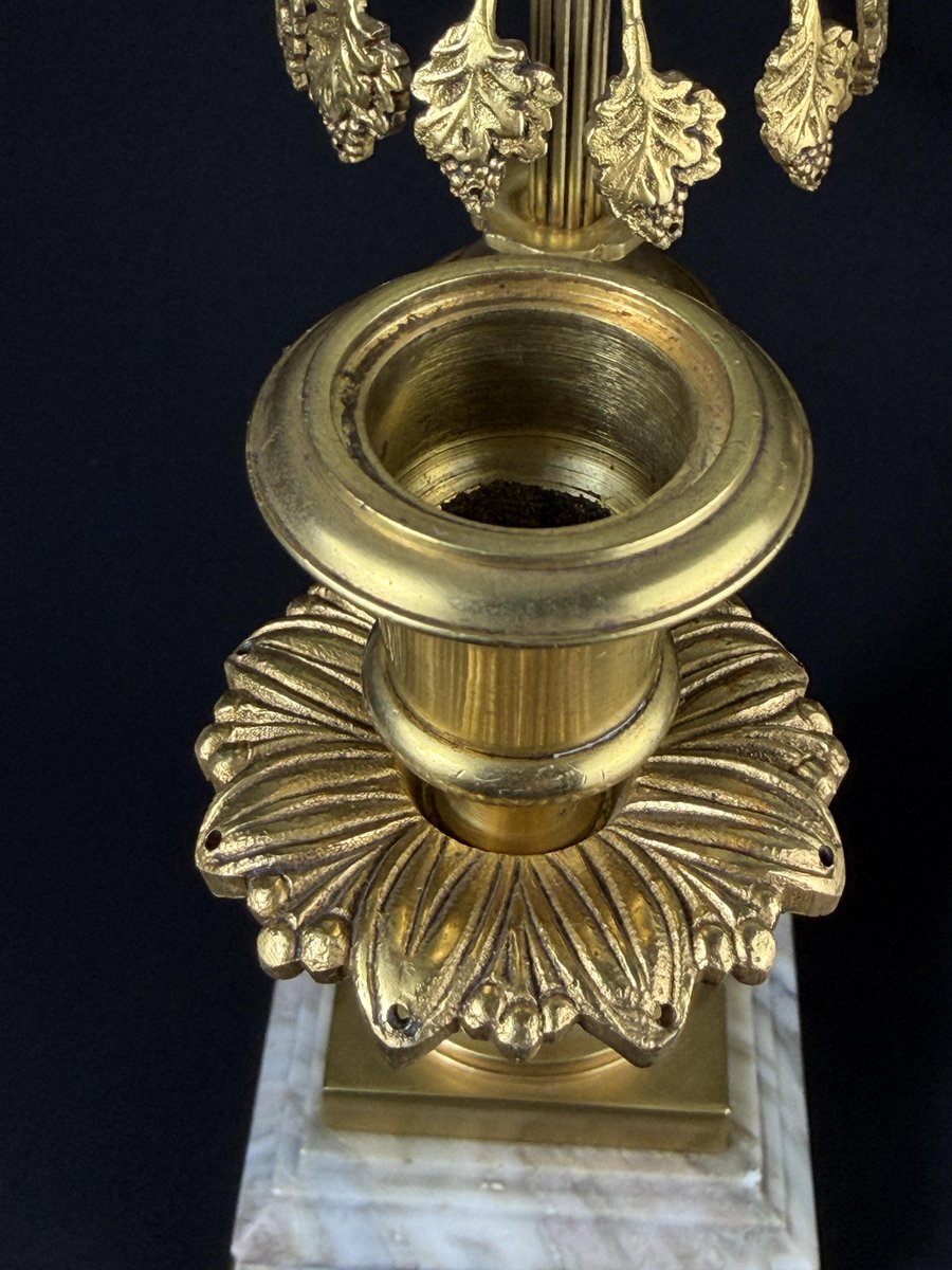 The pieces rest on solid marble bases, providing both visual contrast and structural stability. The warm gilt bronze finish and classical proportions make this pair ideal for a fireplace mantel, console, or formal interior setting.