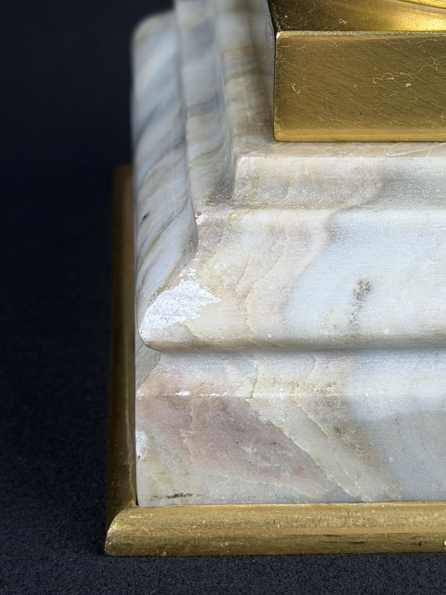 Altezza: 39 cm Larghezza: 28 cm Condizioni: ottime condizioni antiche complessive. Una base in marmo presenta una piccola scheggiatura sul retro. La seconda base presenta una scheggiatura che è stata restaurata professionalmente. Gli elementi in bronzo e le dorature sono ben conservati, con lievi segni di usura dovuti all'età. (Le foto fanno parte del .)