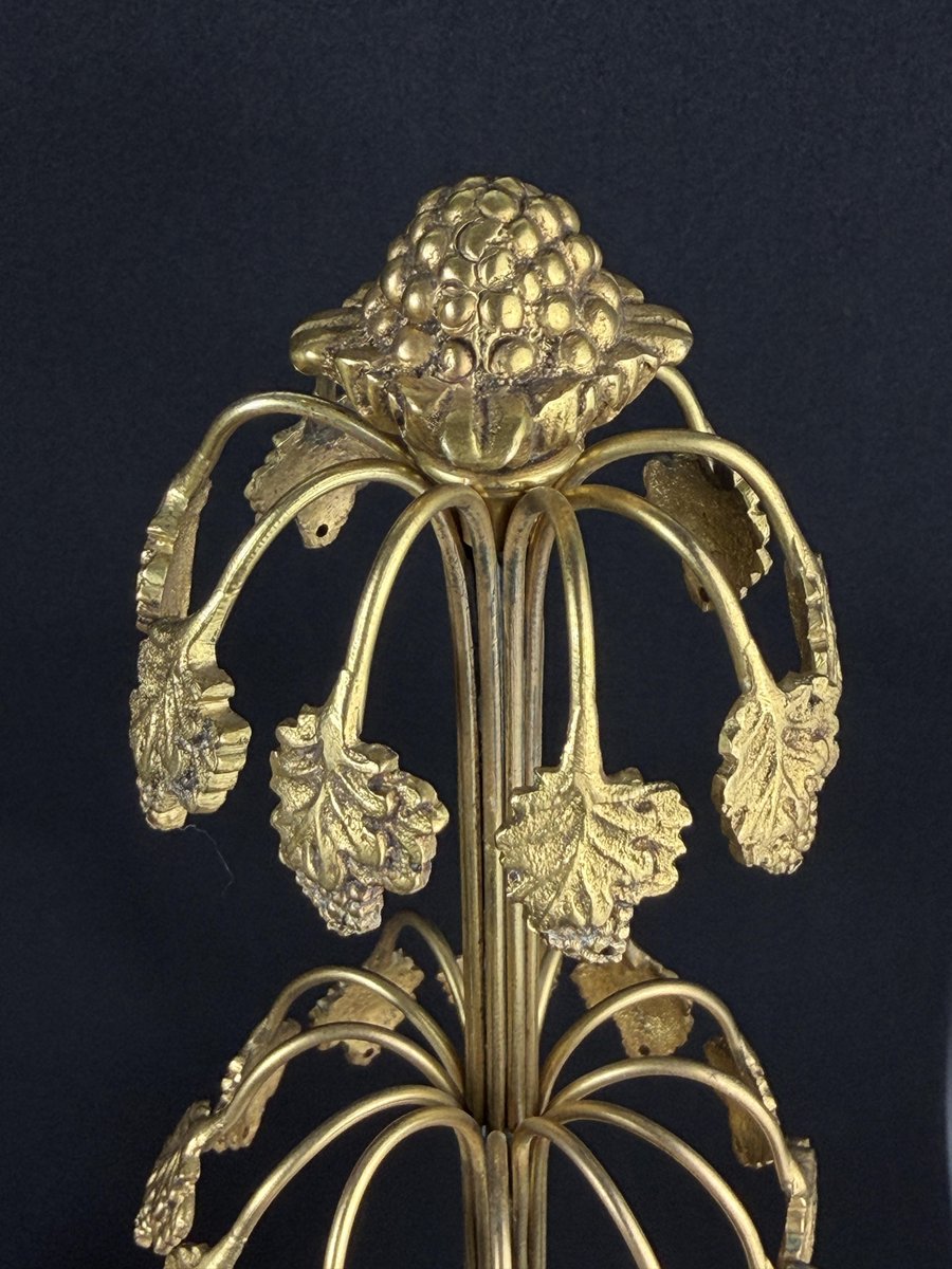 Elegante coppia di candelabri francesi in bronzo dorato risalenti all'inizio del XX secolo, progettati per due candele ciascuno e realizzati in un raffinato stile neoclassico. Ogni candelabro presenta una colonna centrale scultorea adornata con motivi a foglie a cascata e un riccamente dettagliato pinnacolo floreale nella parte superiore. I bracci curvi sono equilibrati e armoniosi, mentre le basi delle colonne sono decorate con rilievi figurativi finemente fusi.