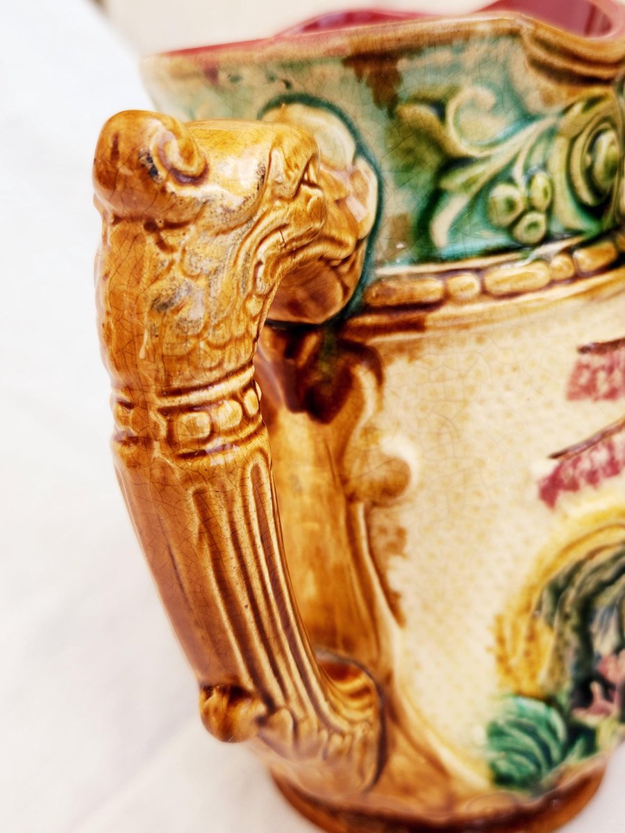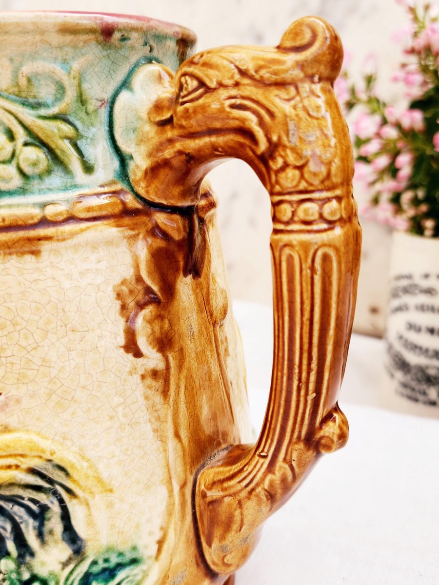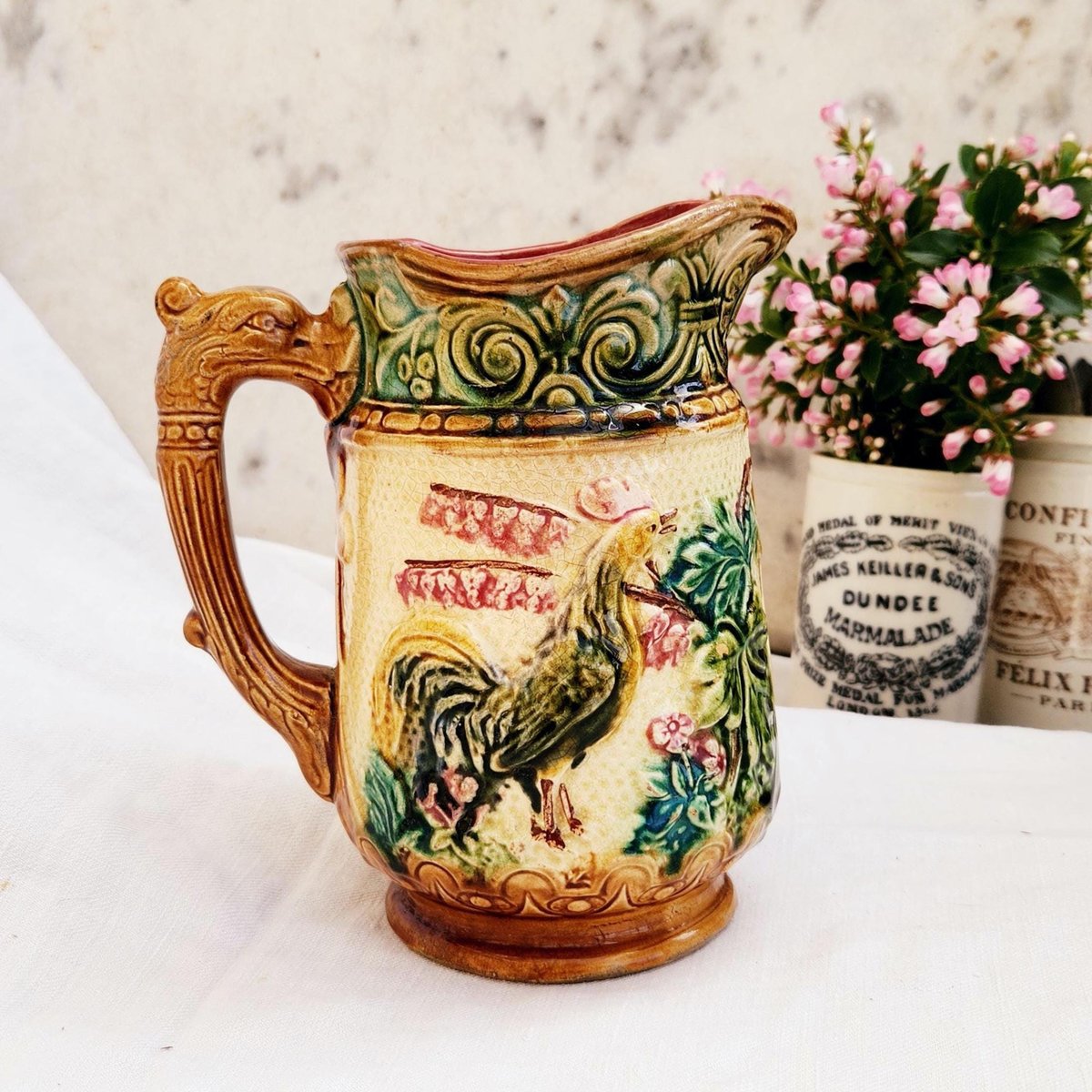 Caraffa Galletto in maiolica con manico a drago, Francia, inizio XIX secolo