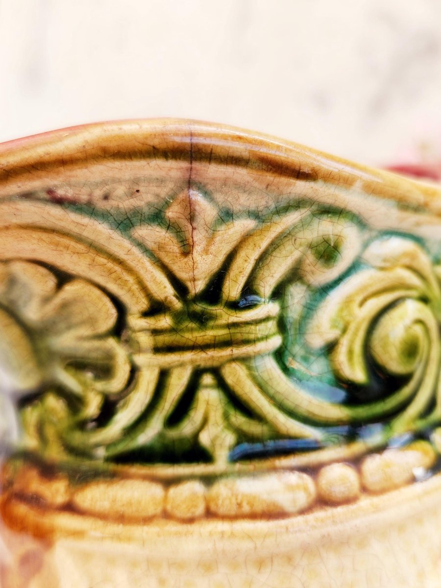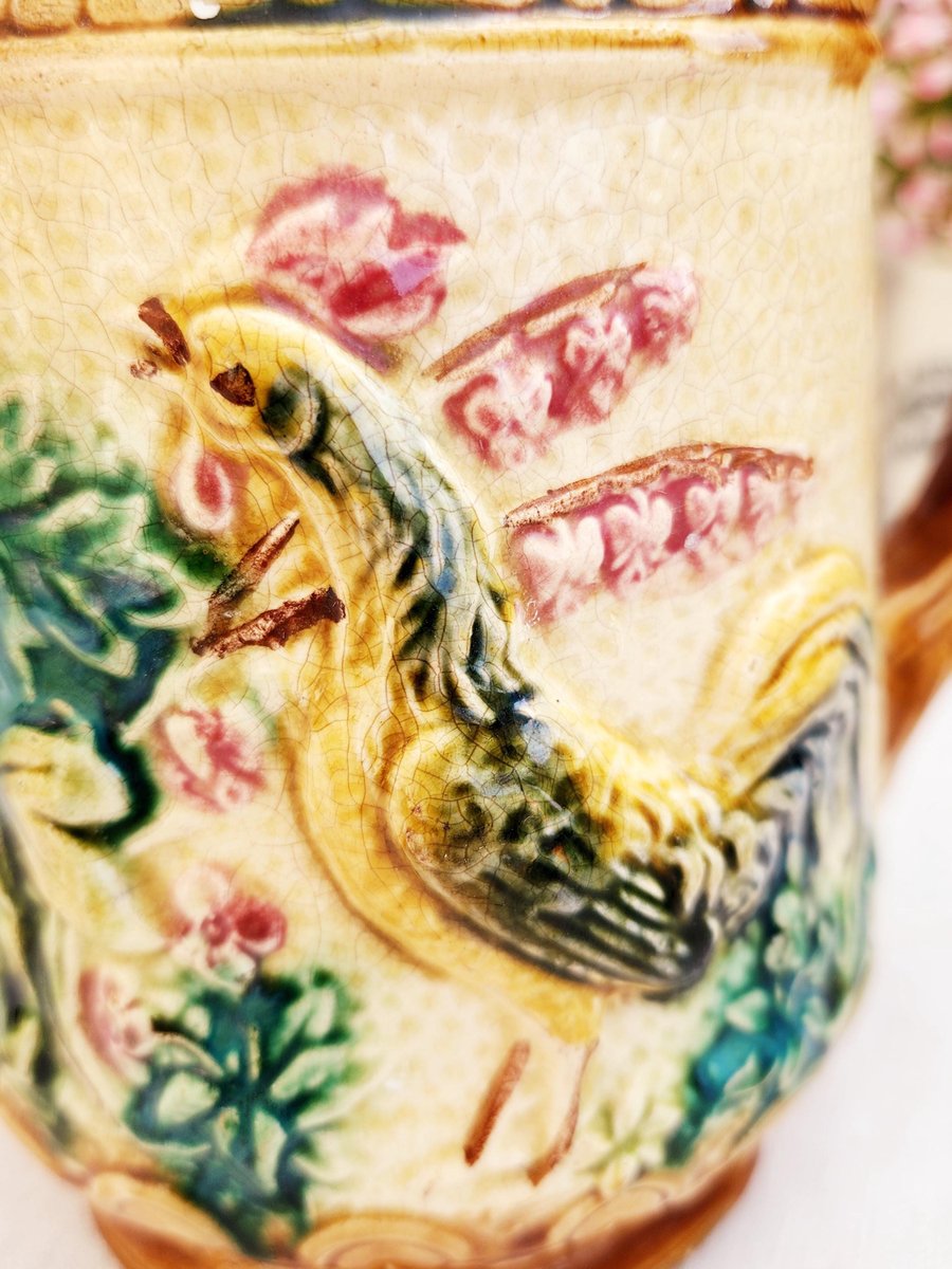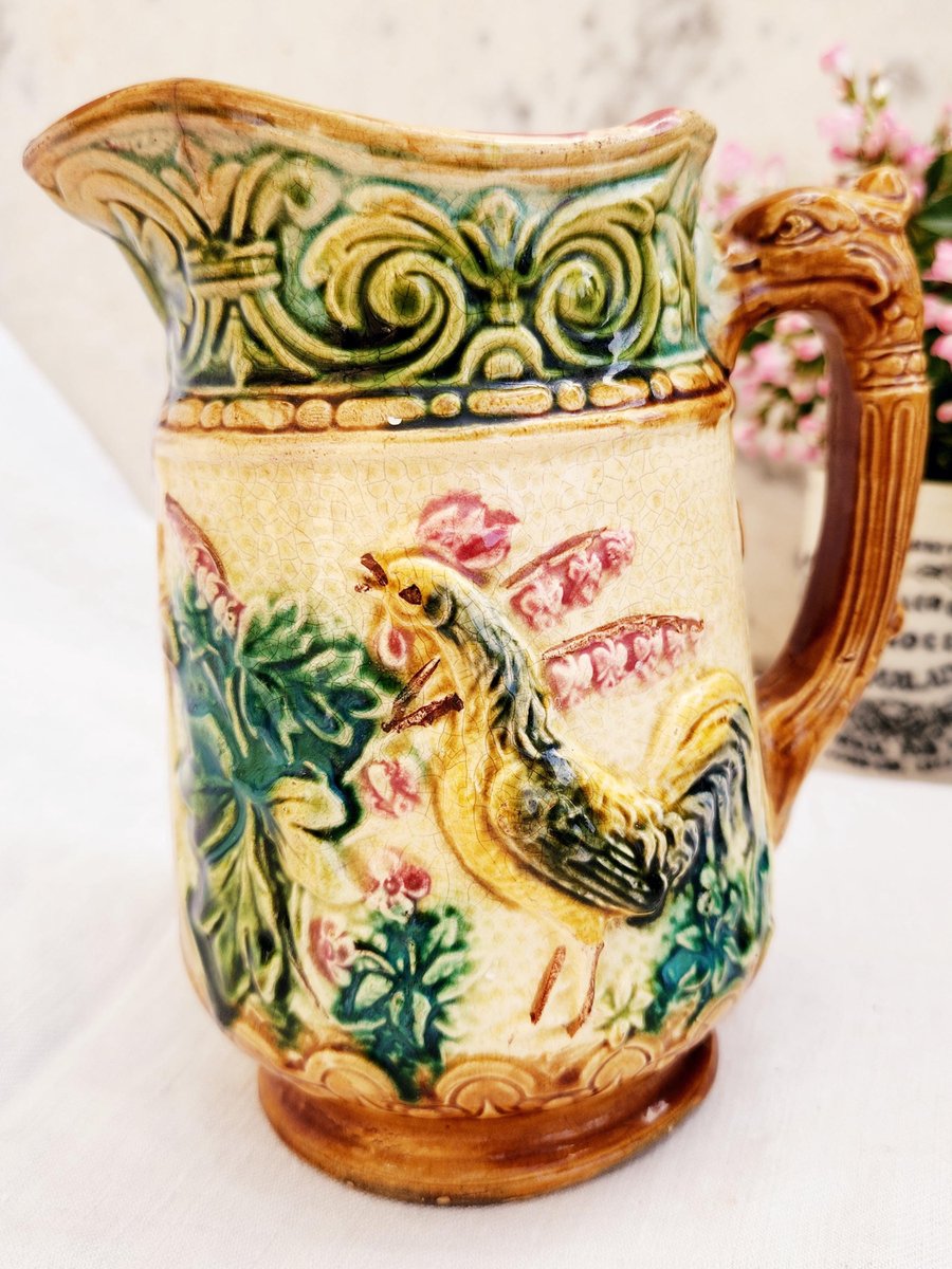 Caraffa Galletto in maiolica con manico a drago, Francia, inizio XIX secolo