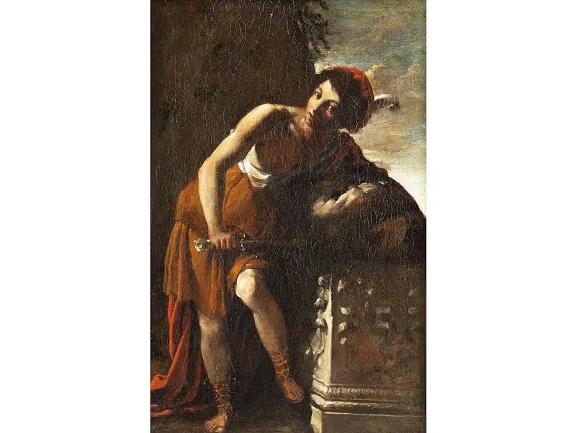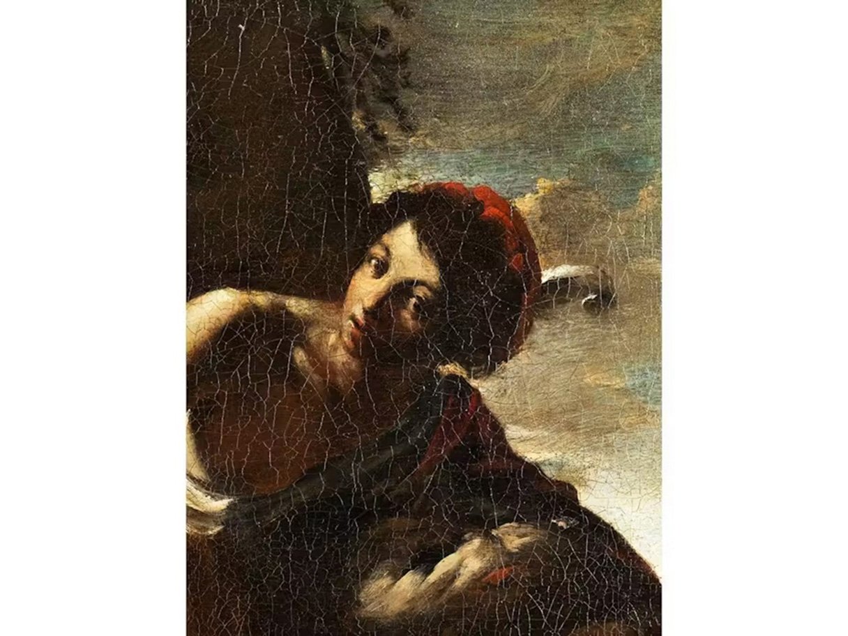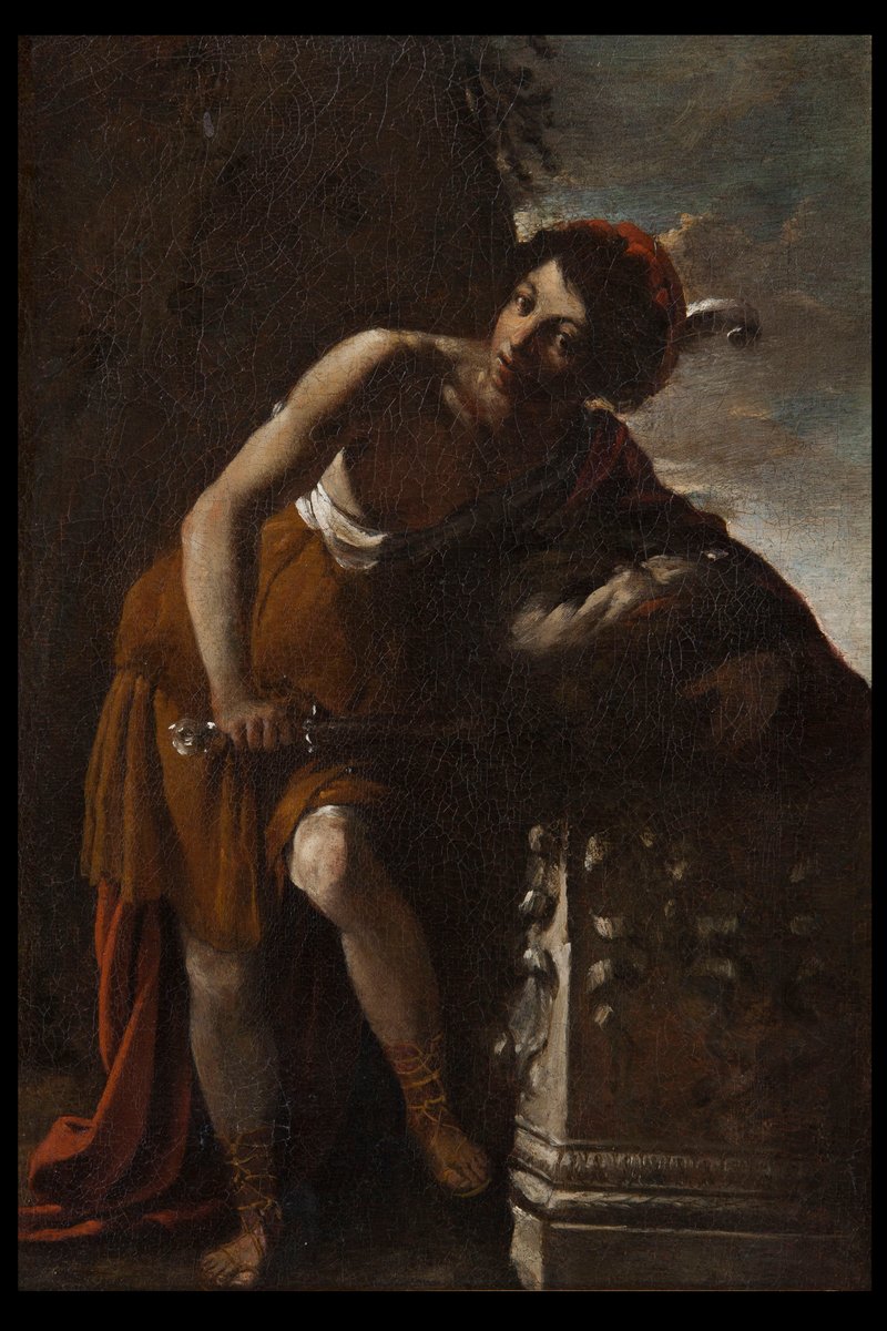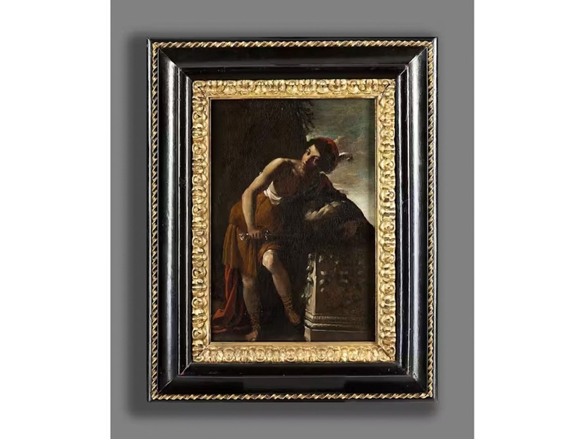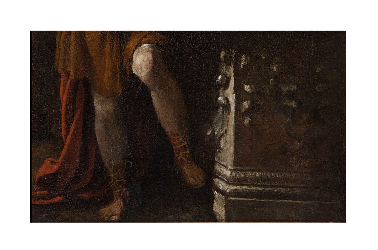 In front of a large brown, partly overgrown boulder, which to the right offers a view of the cloudy blue sky in the light of the setting sun, the youthful David standing with supporting and playing leg, his upper body inclined to the right. He is wearing a short brown and white robe, sandals, a red headdress with a white feather and a long red cloak over his left shoulder, in which he has embedded the head of the slain Goliath, which he is clutching with his left arm on an ornate stone pedestal. In his right hand, above his left knee, he holds the large, shiny sword used for the deed. with his dark eyes, he looks directly out at the viewer. The incidence of light from the top left from an unseen source effectively illuminates his right arm, his left knee, the face and parts of Goliath's head in particular. High-quality painting in a strong chiaroscuro manner in the style of Caravaggism.