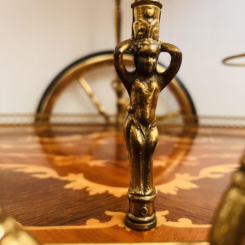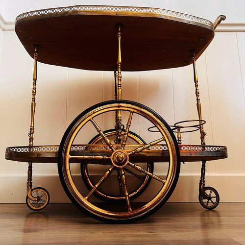 One-of-a-kind Bar, Cocktail, Tea, Cart, Trolley Italian Hollywood Regency Style, Midcentury. Made in Italy. Vintage Italian Hollywood Regency bar cart with brass hardware and inlaid wood. It can be used as a bar cart or tea trolley-a fantastic addition to your living room. This bar cart is functional, on 4 wheels, 3 bottle holders, and brass hardware adorning the cart adds a luxurious touch, accentuating its vintage charm. The warm, lustrous brass complements the wood beautifully, creating a harmonious and opulent aesthetic. Whether you’re hosting a cocktail party or simply enjoying a quiet afternoon tea, this cart is ready to serve. Dimensions: Height: 65 cm / 25.5 inches, Widht: 73 x 43 cm / 28.7 x 16.9 inches. Condition: This cart is in used vintage condition, with typical signs of wear. All the items in our shop are vintage, mainly used, and may have slight manufacturing imperfections. Please take a good look at all the photos before you purchase them to be satisfied with your acquisition, and for other questions, don’t hesitate to contact us. The bar cart will be disassembled for a secure and safe shipment. We will send instructions on how to reassemble it.