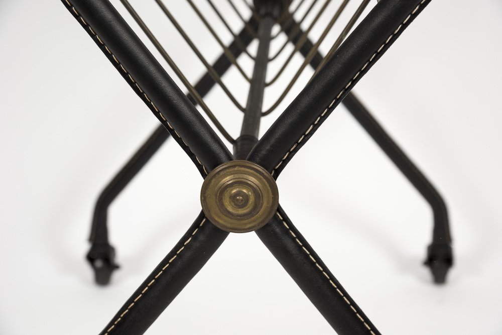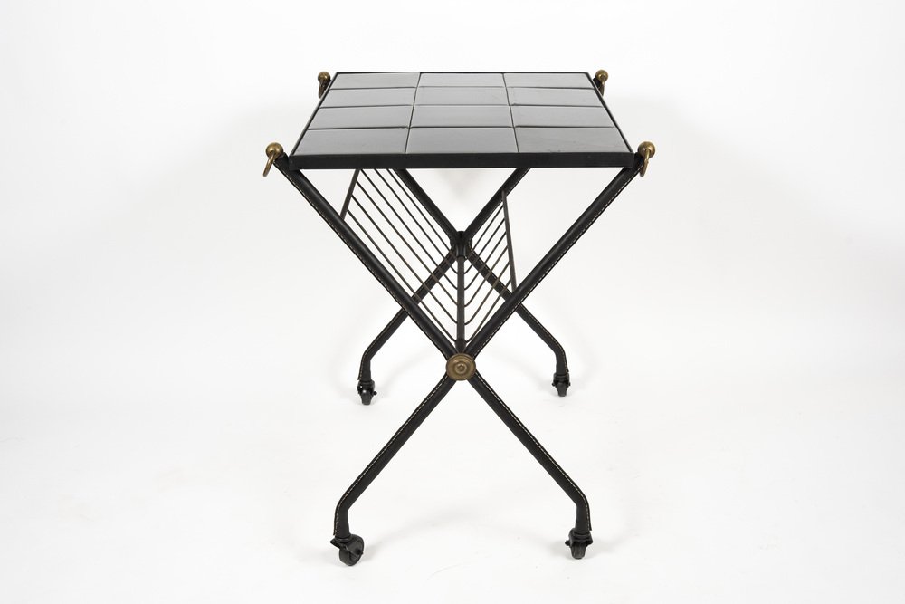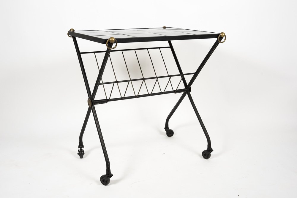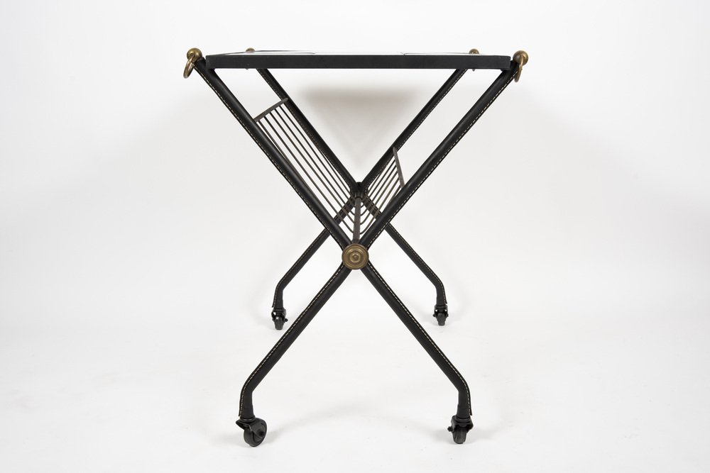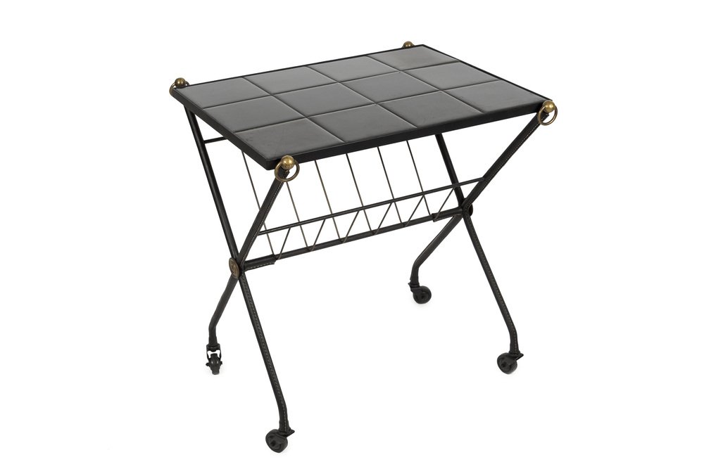 Carrello di servizio in pelle e ceramica di Jacques Adnet, anni '50