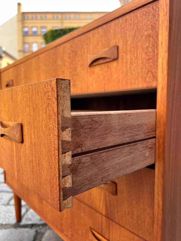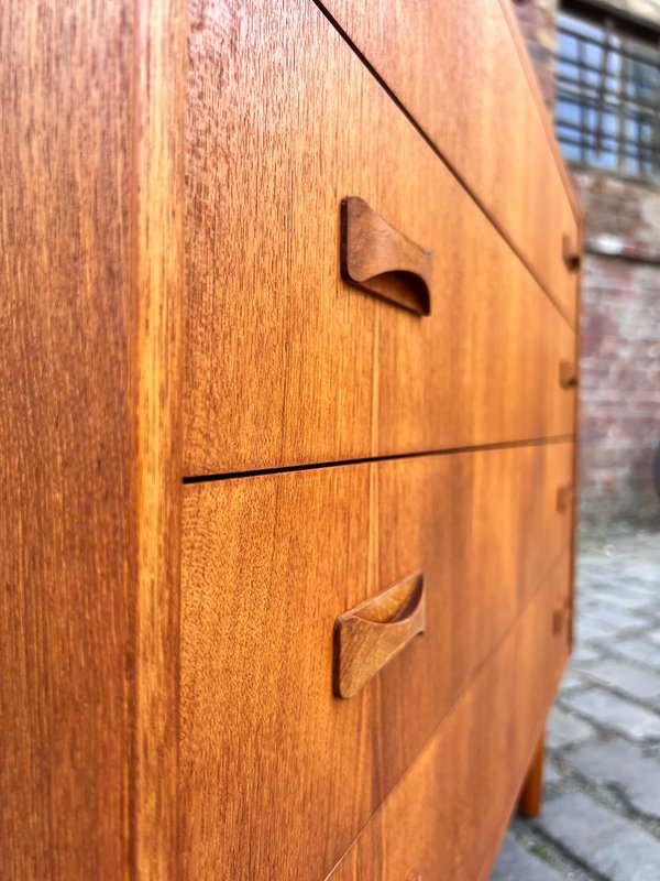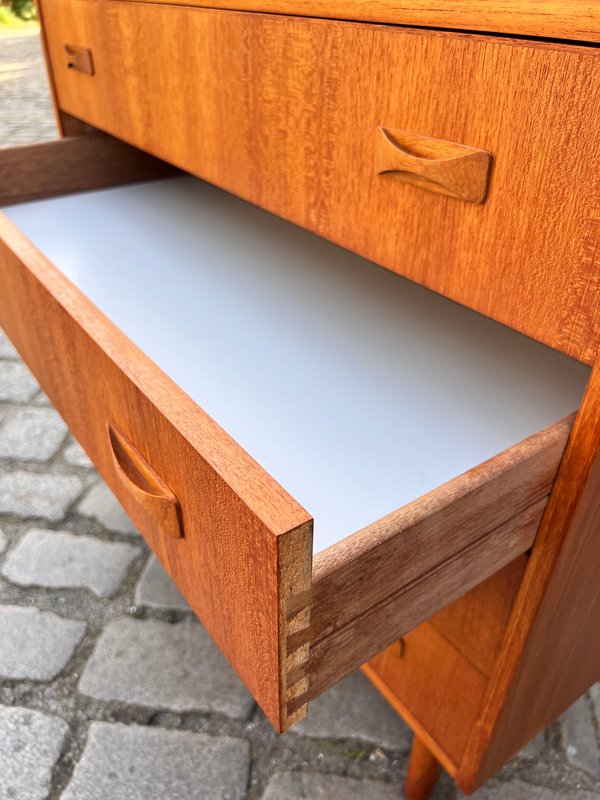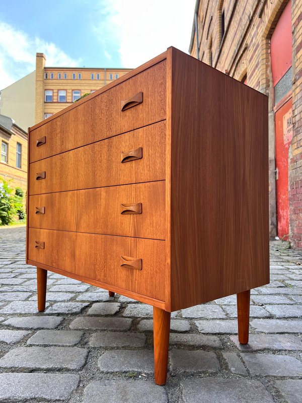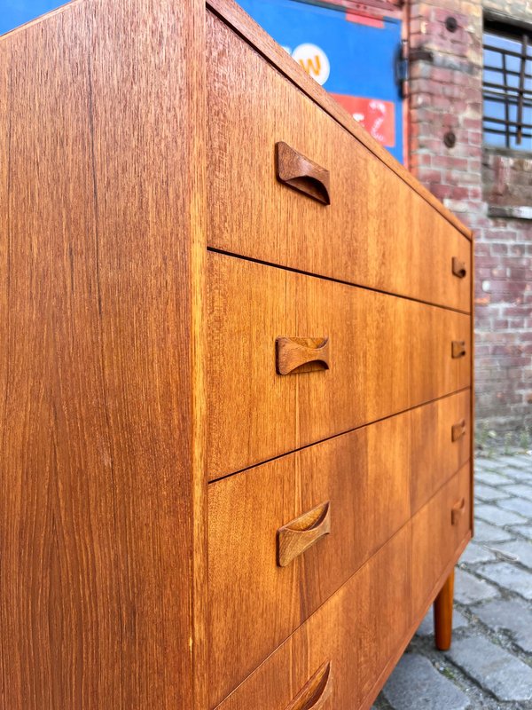 Danish teak chests of drawers are true classics of Scandinavian design and embody the timeless elegance of mid-century style. The warm, natural teak used in this furniture exudes a warm atmosphere and immediately brings a sense of security to any room. The clean lines and functional design characterize this chest of drawers: perfect for the style-conscious home that values quality and aesthetics. Today, Danish teak chests of drawers are considered valuable design pieces that combine the Scandinavian lifestyle with functionality and simple beauty. Whether in the bedroom, living room, or hallway – they set stylish accents, create order, and lend the room a special charm. Anyone who values a piece of furniture that is timelessly beautiful and looks great in any home will find a Danish teak chest of drawers a true choice for life.