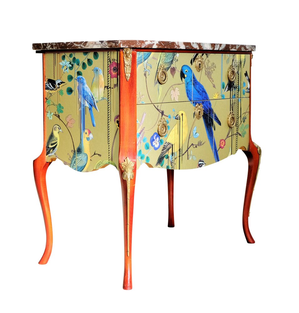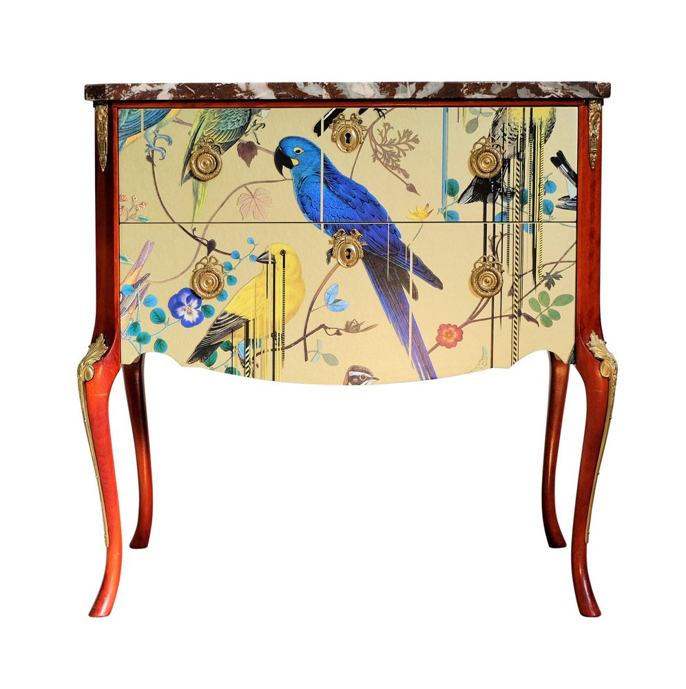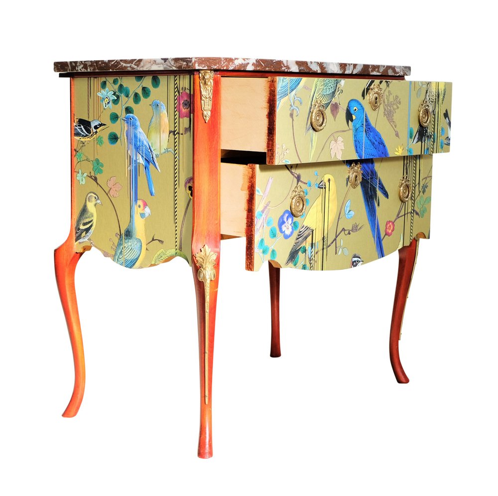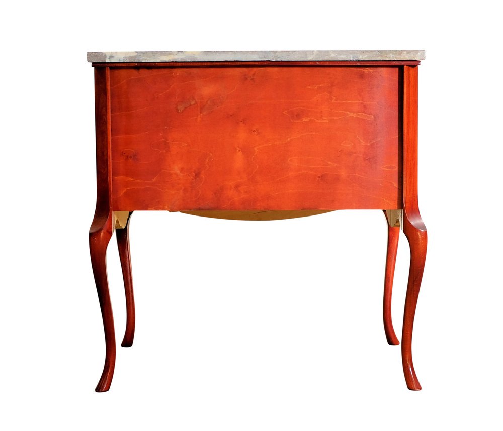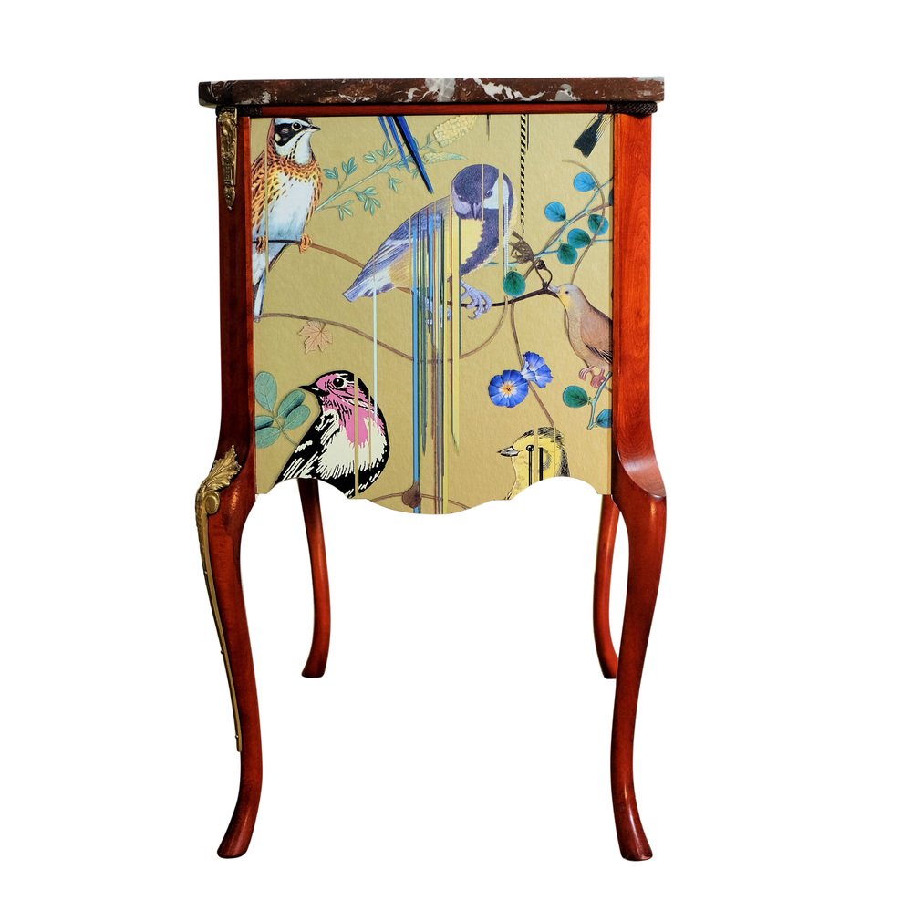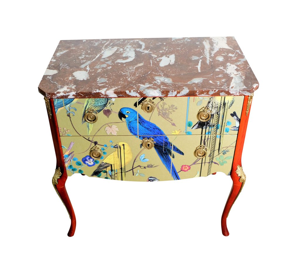 Cassettiera Luigi XV con uccelli dorati e ripiano in marmo, anni '50