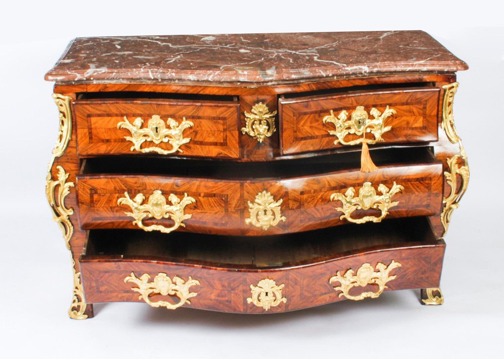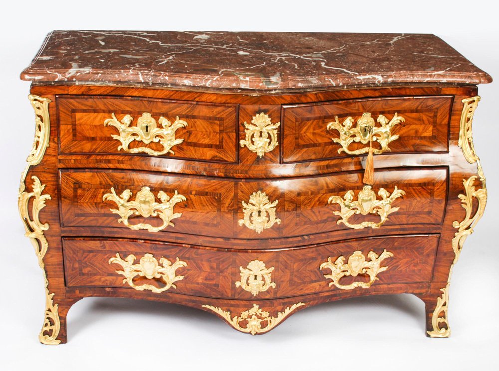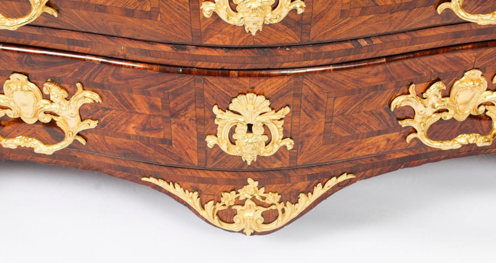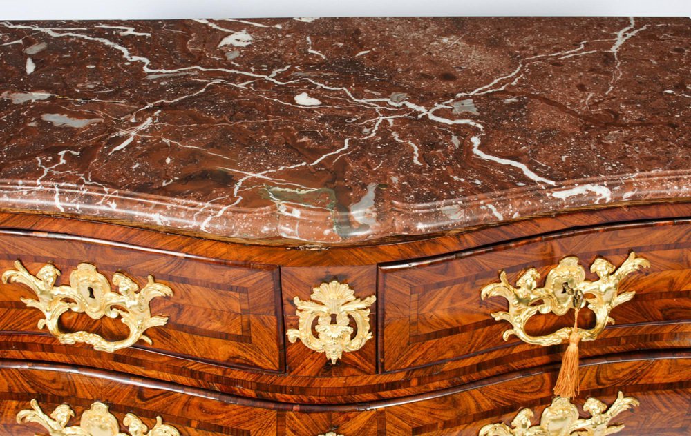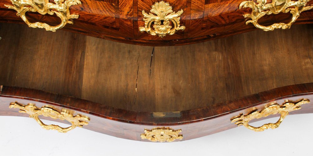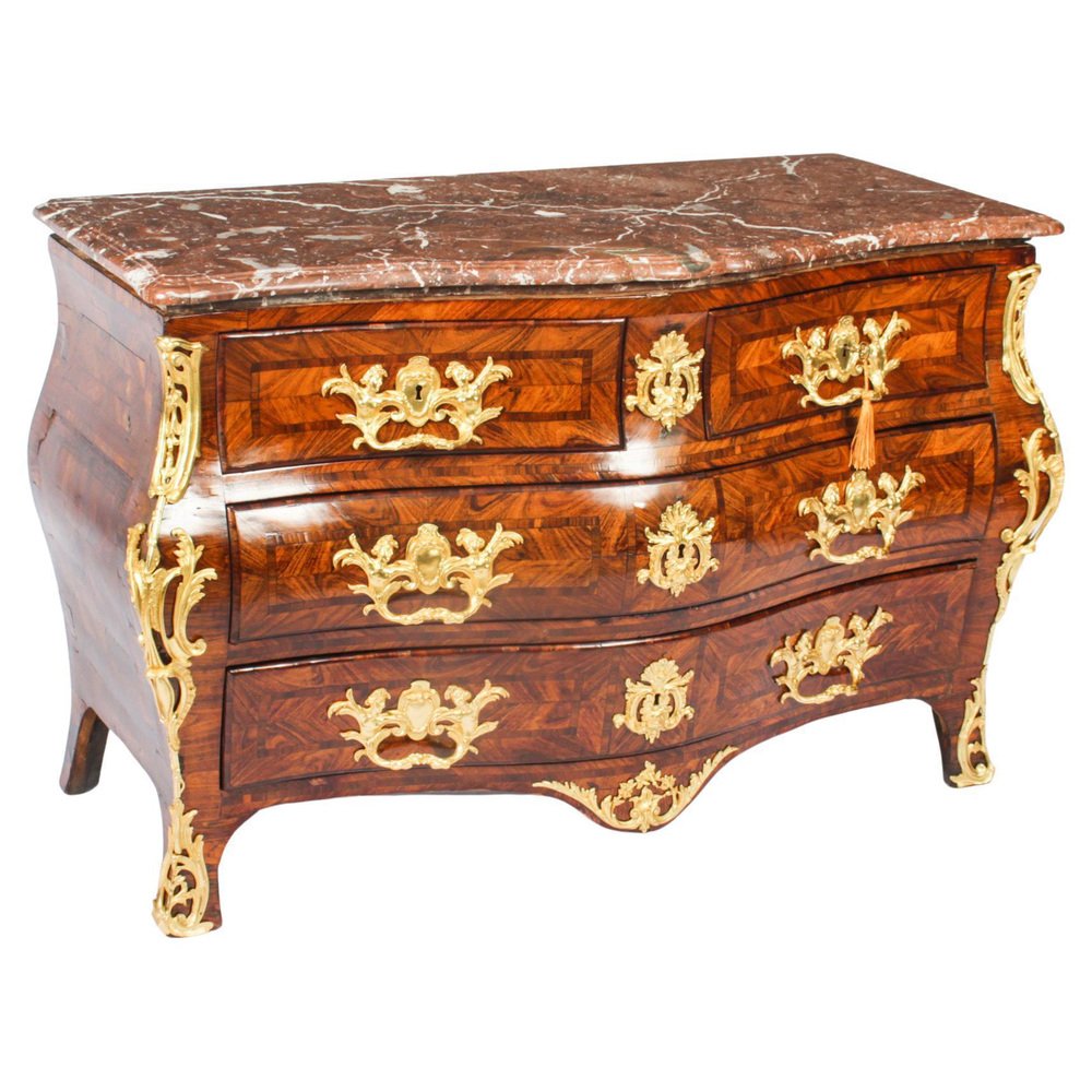 This is an impressive and rare antique french régence wood and ormolu mounted commode, circa 1720 in date. The stunning breche violette marble top over a serpentine front having two short over two full width drawers, the drawers fitted with scrolling ormolu handles with twin masque maidens. The commode with wood parquetry, superb decorative gilded bronze ormolu mounts, raised on short shaped legs and stamped 'jme and 'mm'. This is an exceptional piece of craftsmanship, a truly gorgeous piece. This commode deserves pride of place in any furniture collection and will become the central focus point in your room. Complete with original working locks and key. Condition: in excellent condition having been beautifully cleaned, french polished and waxed in our workshops, please see photos for confirmation. Dimensions in cm: height 85 x width 131 x depth 65 dimensions in inches: height 2 foot, 9 inches x width 4 foot, 4 inches x depth 2 foot, 2 inches régence style, transition in the decorative arts from the massive rectilinear forms of louis xiv furniture to those prefiguring the rococo style of louis xv. The style encompasses about the first 30 years of the 18th century, when philippe ii, duc d’orléans, was regent of france. The restraint arrived at during this period resulted from a strong reaction against the pomposity of the court under louis xiv. The evolution of the intimate petit salon as opposed to the formal, ceremonial state apartments of the past brought with it a penchant for graceful, easily movable furniture, designed to showcase the impeccable craftsmanship of the period. At versailles, where furniture had formerly represented the firmly placed hierarchy of the court, rooms were divided into smaller, more intimate spaces calling for a new style. The aristocracy made the decoration of their parisian homes a lifetime occupation. Jean berain, charles cressent, robert de cotte, and the painter antoine watteau, whose pictures were painted on the panelled salon walls to harmonize with the gentle spirit of the period, are among the important names connected with the new delicacy. Régence furniture did away with heavy, carved ornamentation and substituted flat, curving motifs—characteristically foliage and bouquets framed by flowing ribbons and bows. The intricate tracery in brass and shell marquetry on ebony was adapted to the new taste. Woods such as walnut were used as veneer. A sculptural form in the shape of a female bust, called an “espagnolette,” made its appearance as a gently curved ornamental mount for chair and table legs. The commode and writing table, both representing the new, intimate style of life, were introduced during this period. Ormolu - gilt bronze (from french 'or moulu', signifying ground or pounded gold) is an 18th-century english term for applying finely ground, high-carat gold in a mercury amalgam to an object of bronze.the mercury is driven off in a kiln leaving behind a gold-coloured veneer known as 'gilt bronze'. The manufacture of true ormolu employs a process known as mercury-gilding or fire-gilding, in which a solution of nitrate of mercury is applied to a piece of copper, brass, or bronze, followed by the application of an amalgam of gold and mercury. The item was then exposed to extreme heat until the mercury burned off and the gold remained, adhered to the metal object. After around 1830 because legislation had outlawed the use of mercury other techniques were used instead. Electroplating is the most common modern technique. Ormolu techniques are essentially the same as those used on silver, to produce silver-gilt.